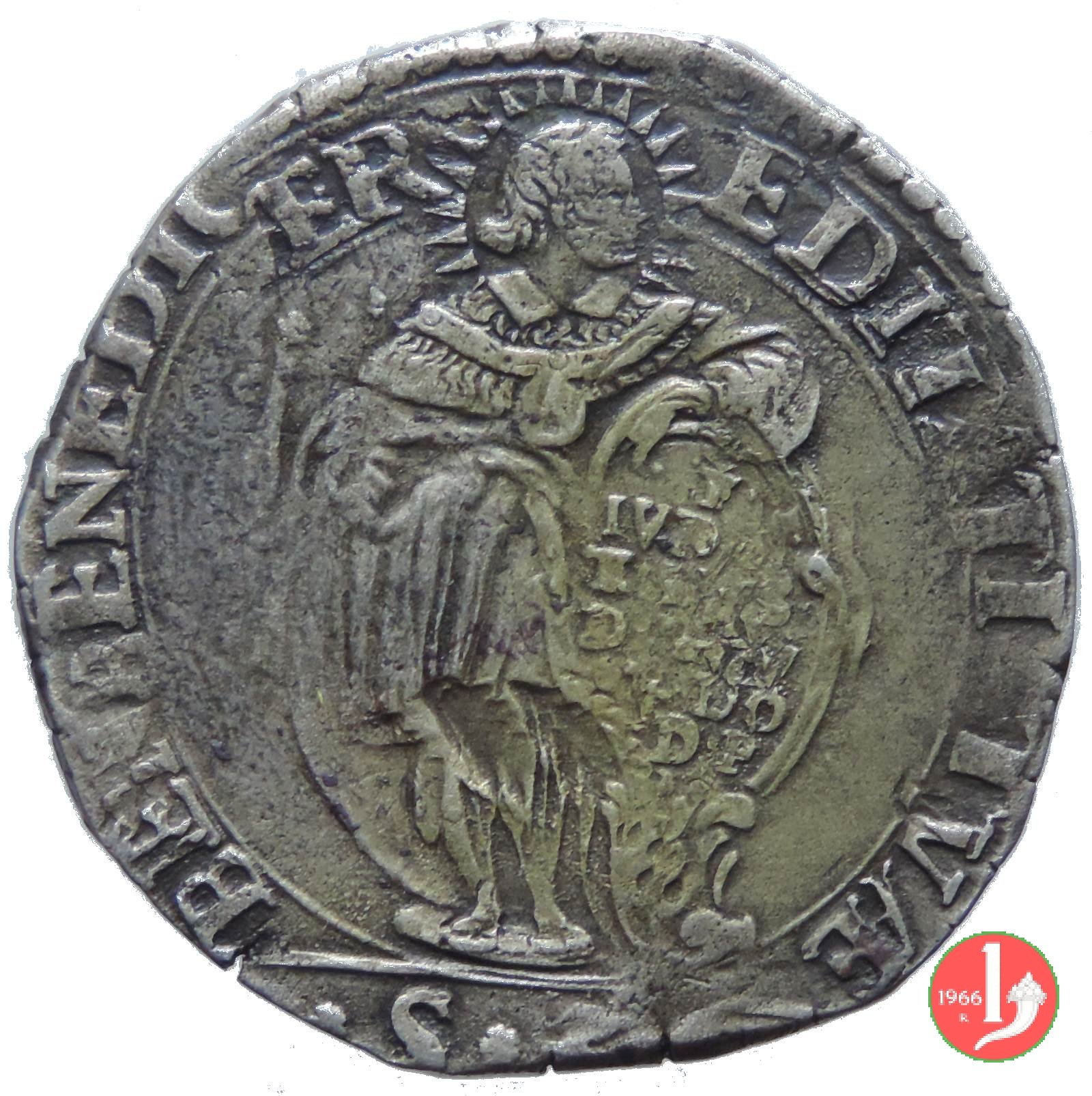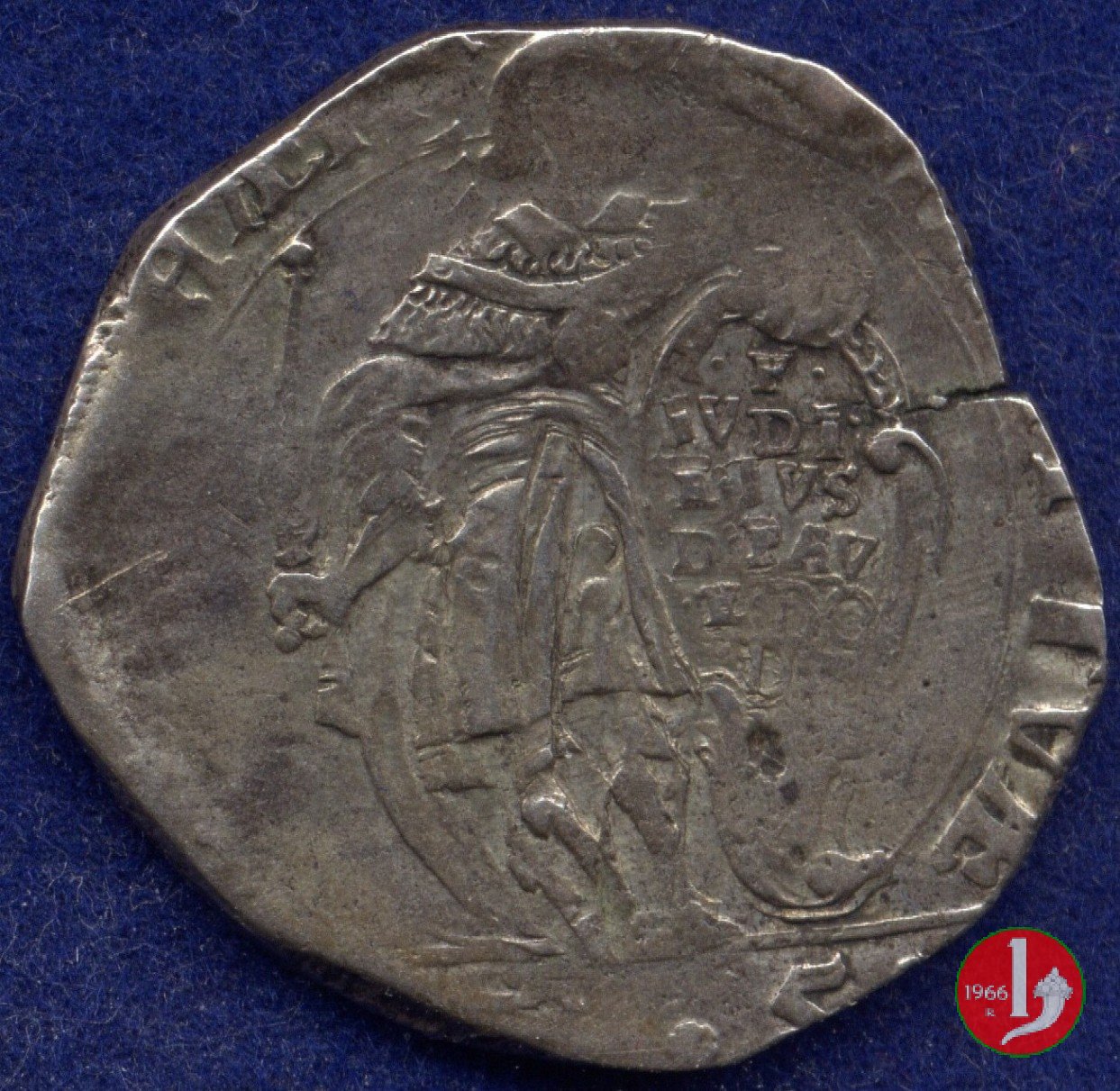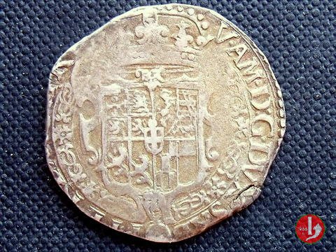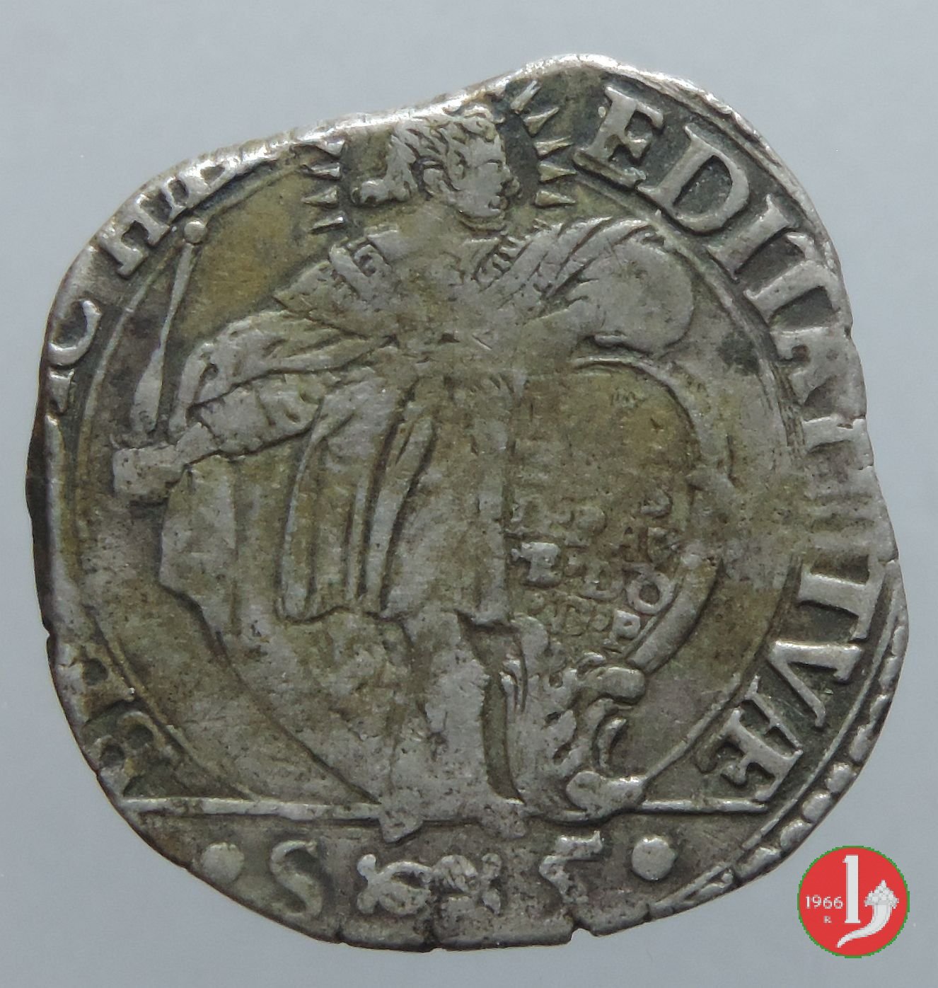 Scudo completo coronato da una corona reale (chiusa), incartocciato e circondato dal collare dell'annunziata, intorno V • AM • D : G • DUX • SAB P • PE • REX • CYPRI Il beato Amedeo in piedi, appoggiato su uno scudo su cui è scritto: • F • IUDI E • IUS D • PAU E • DO D • P, in esergo il valore • S • 5 • , intorno BENEDIC HAER EDITATI TUAE