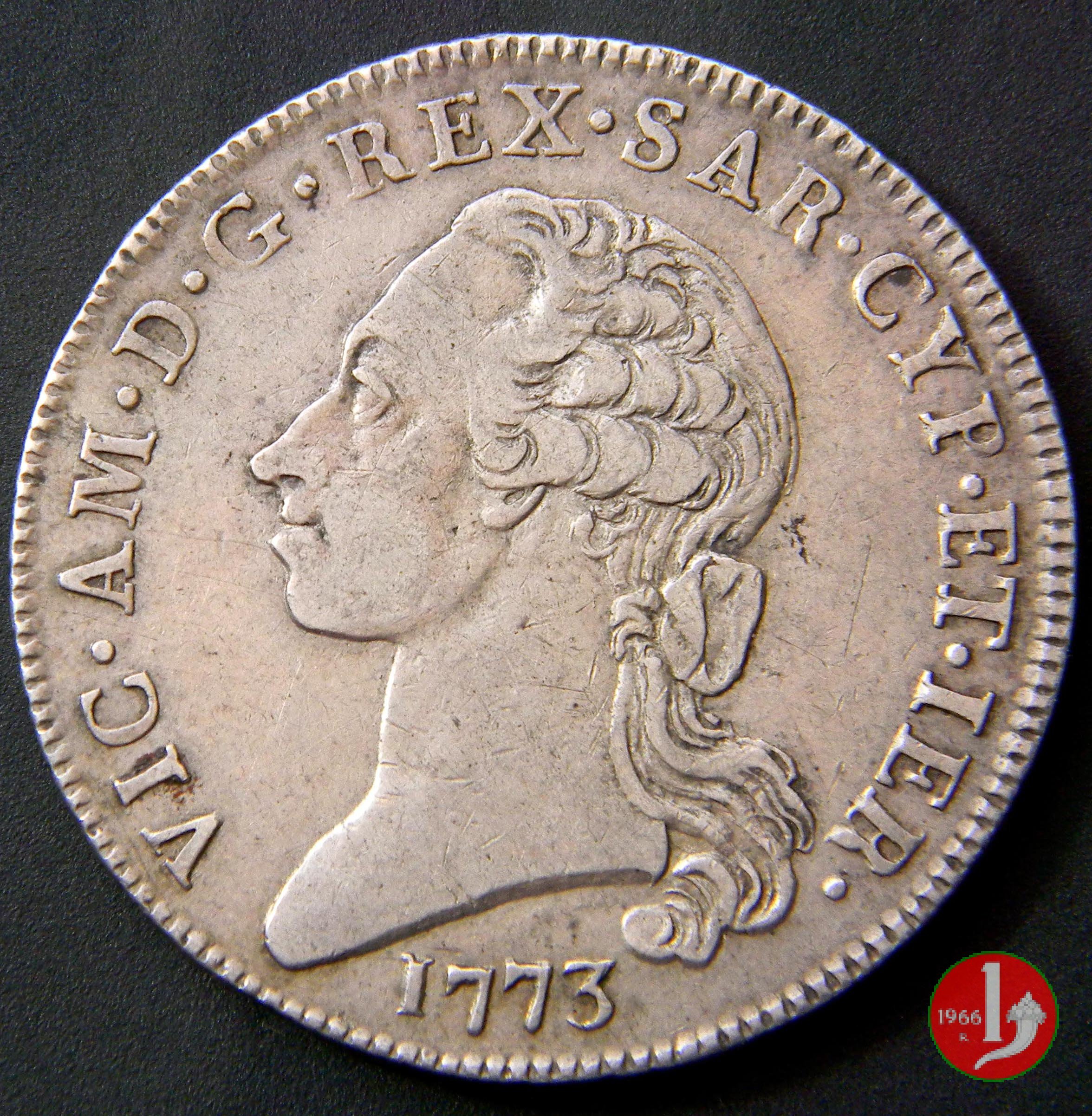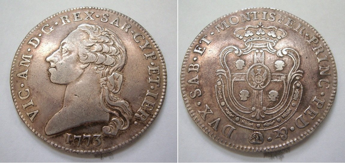 Testa nuda del re a sinistra, sotto il collo la data, intorno VIC • AM • D • G • REX • SAR • CYP • ET • IER •. Scudo sardo sagomato con aquila sabauda in cuore,coronato, con sotto il collare dell' annunziata, intorno DVX • SAB • ET • MONTISFER • PRINC • PED • & •.