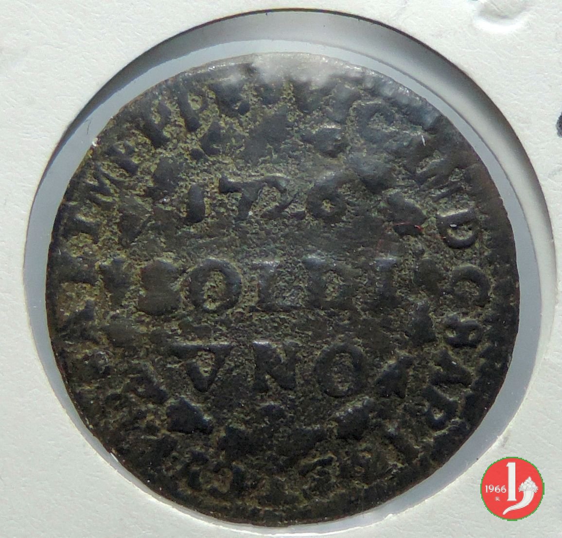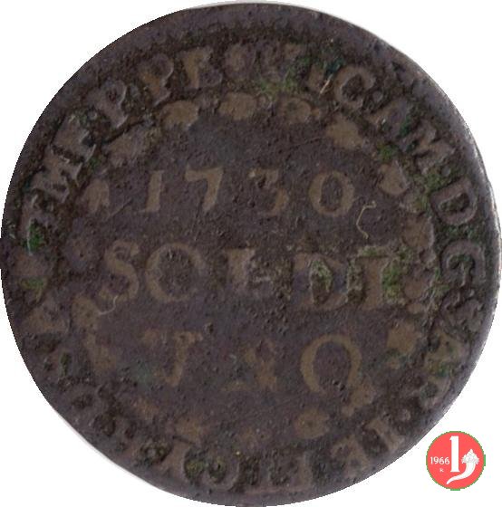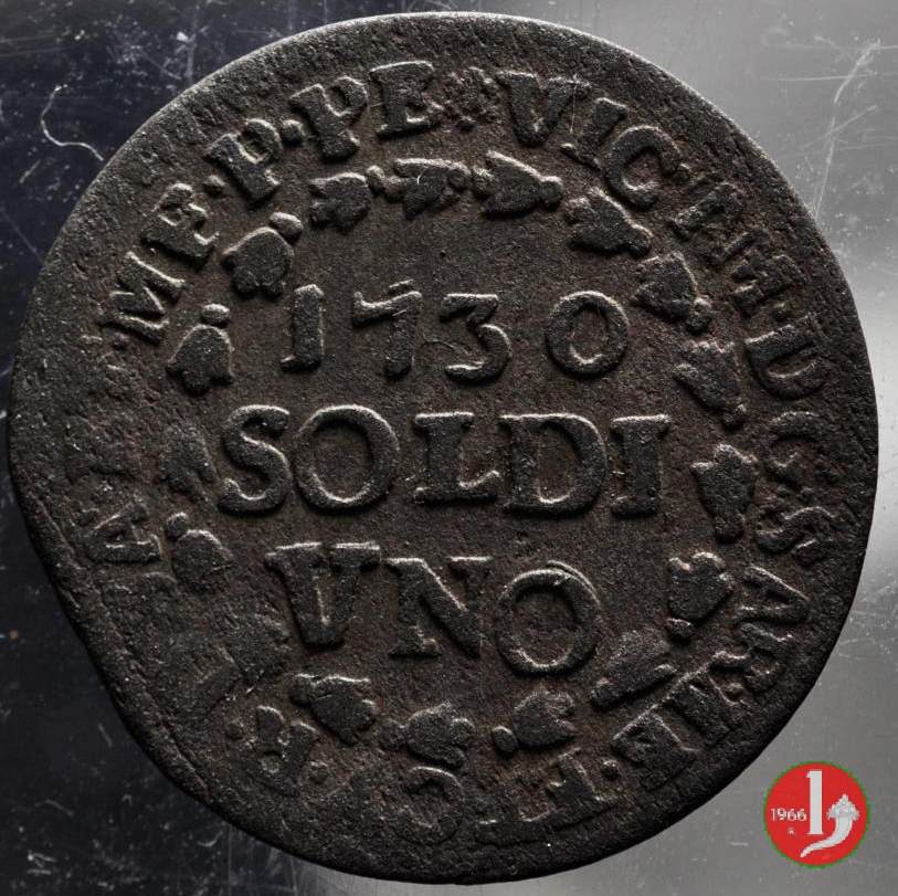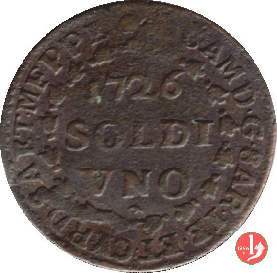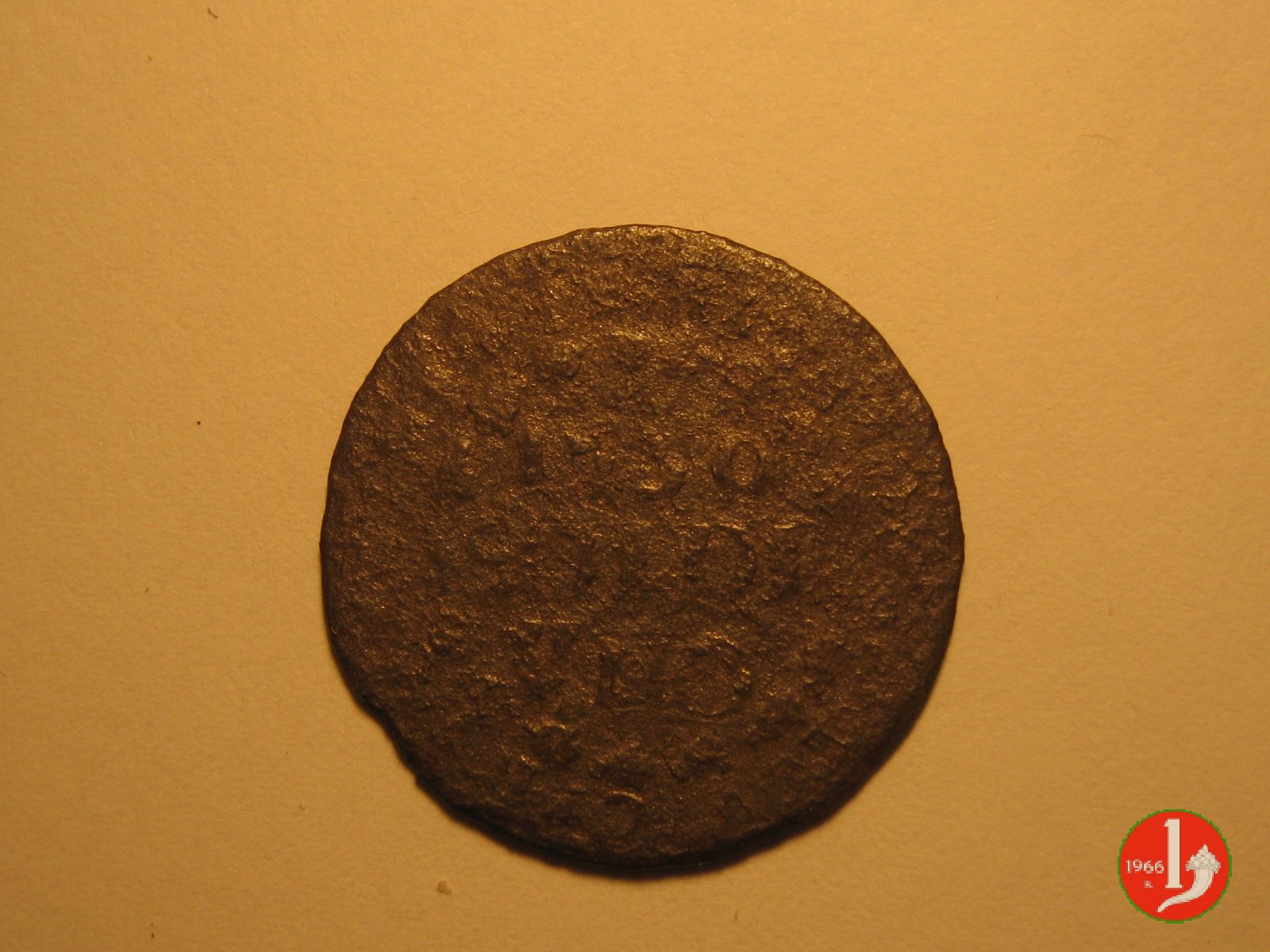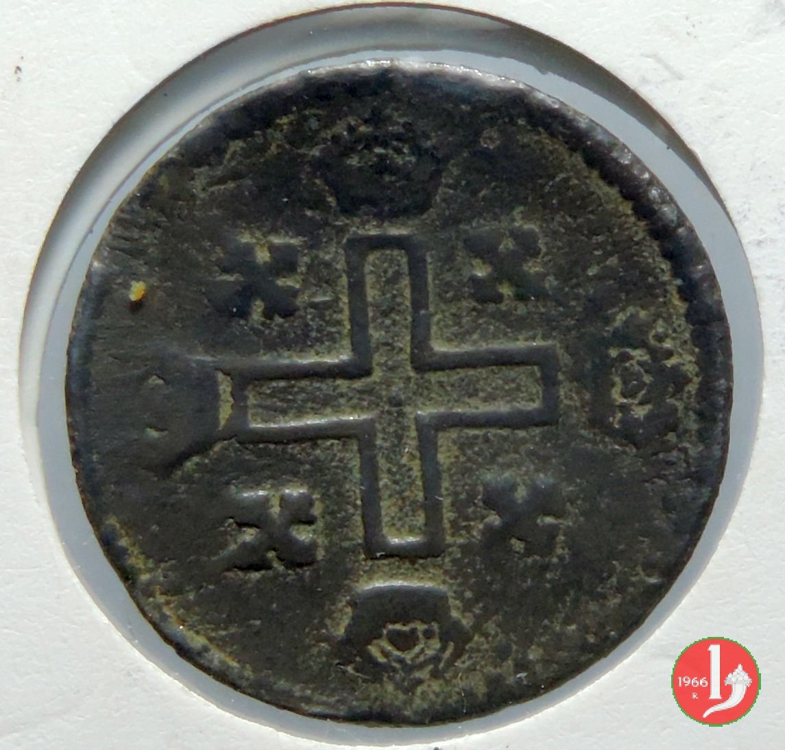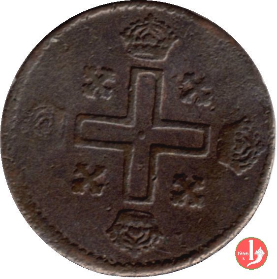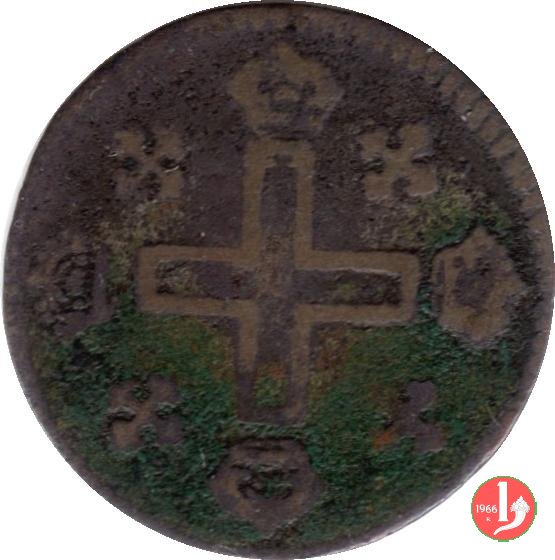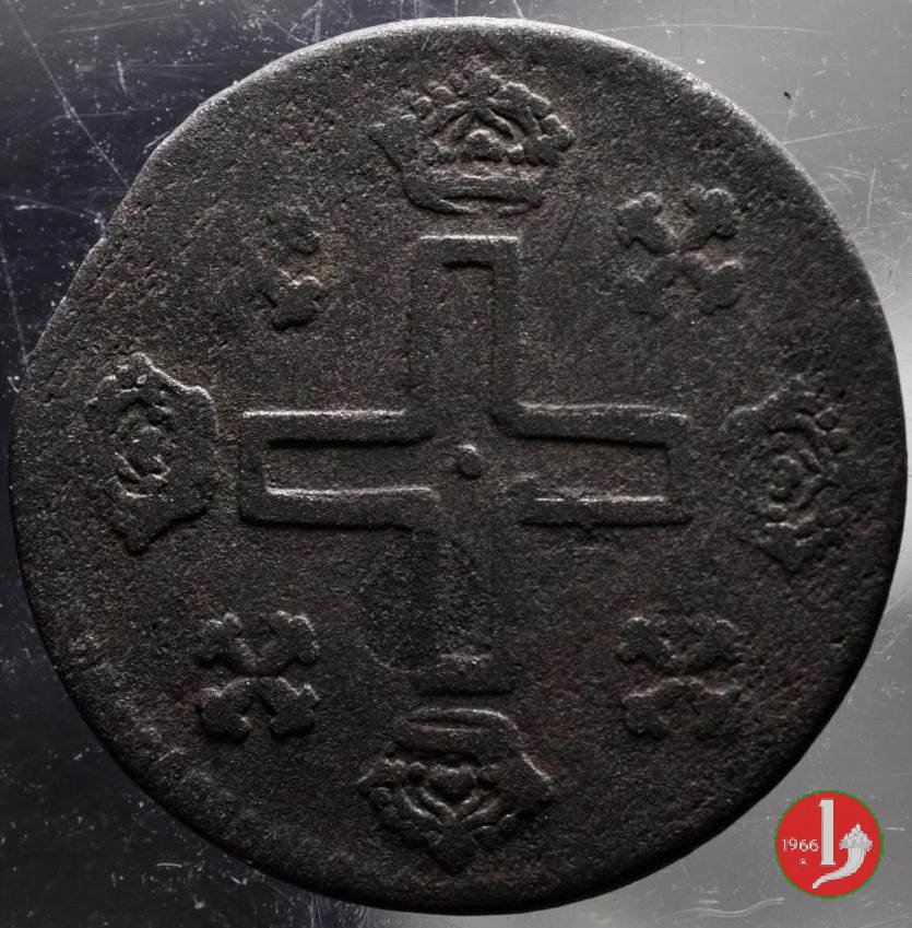 In tre righe; data SOLDI UNO, contornato da dei giglietti, intorno rosetta VIC • AM • D • G • SAR • IE • ET • CY • R • D • SA • ET • MF • P • PE Croce piana con corone alle estremità e accantonata da quattro crocette mauriziane