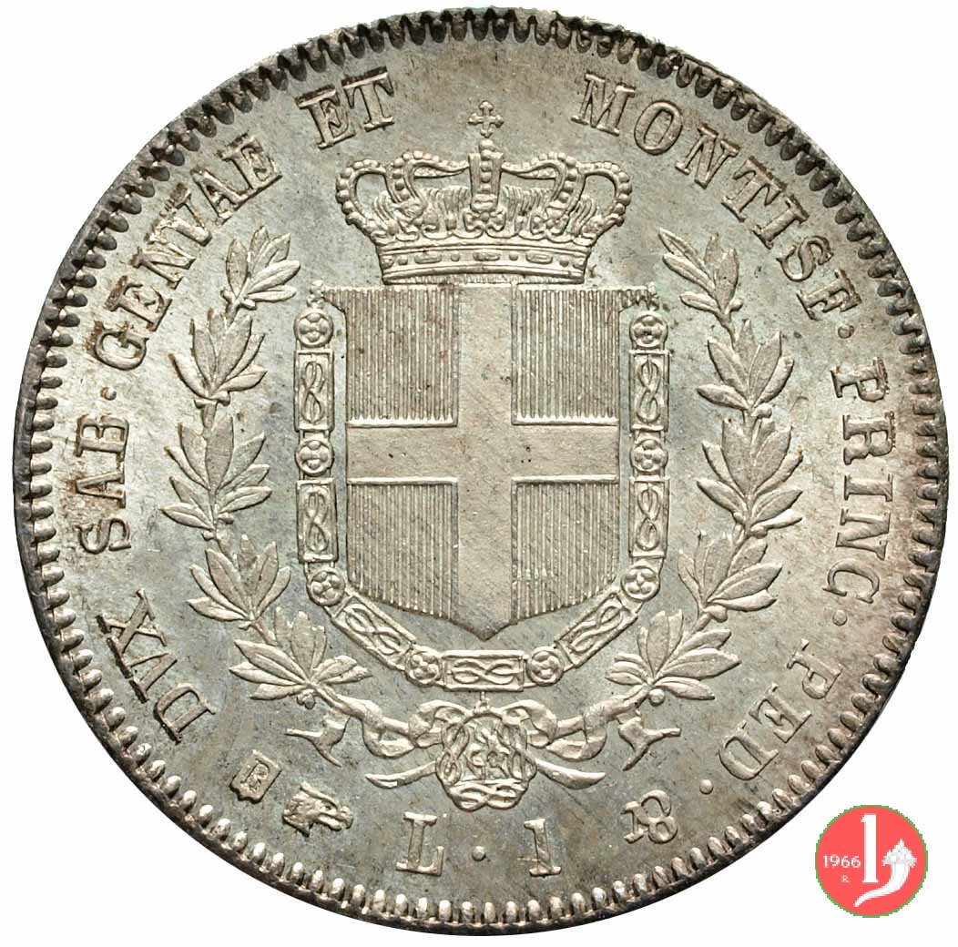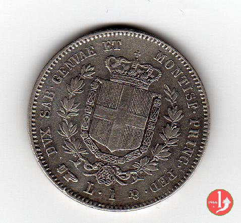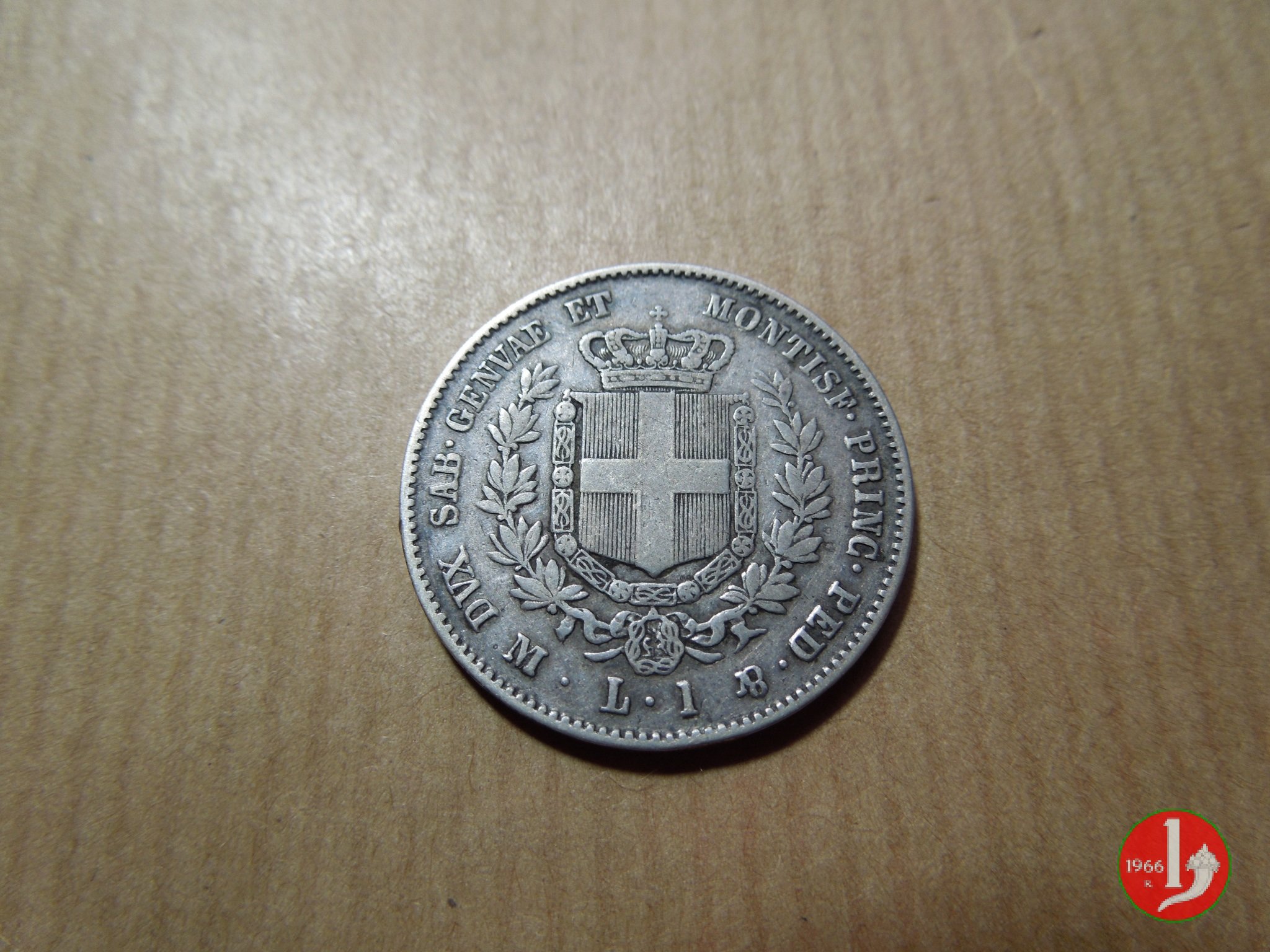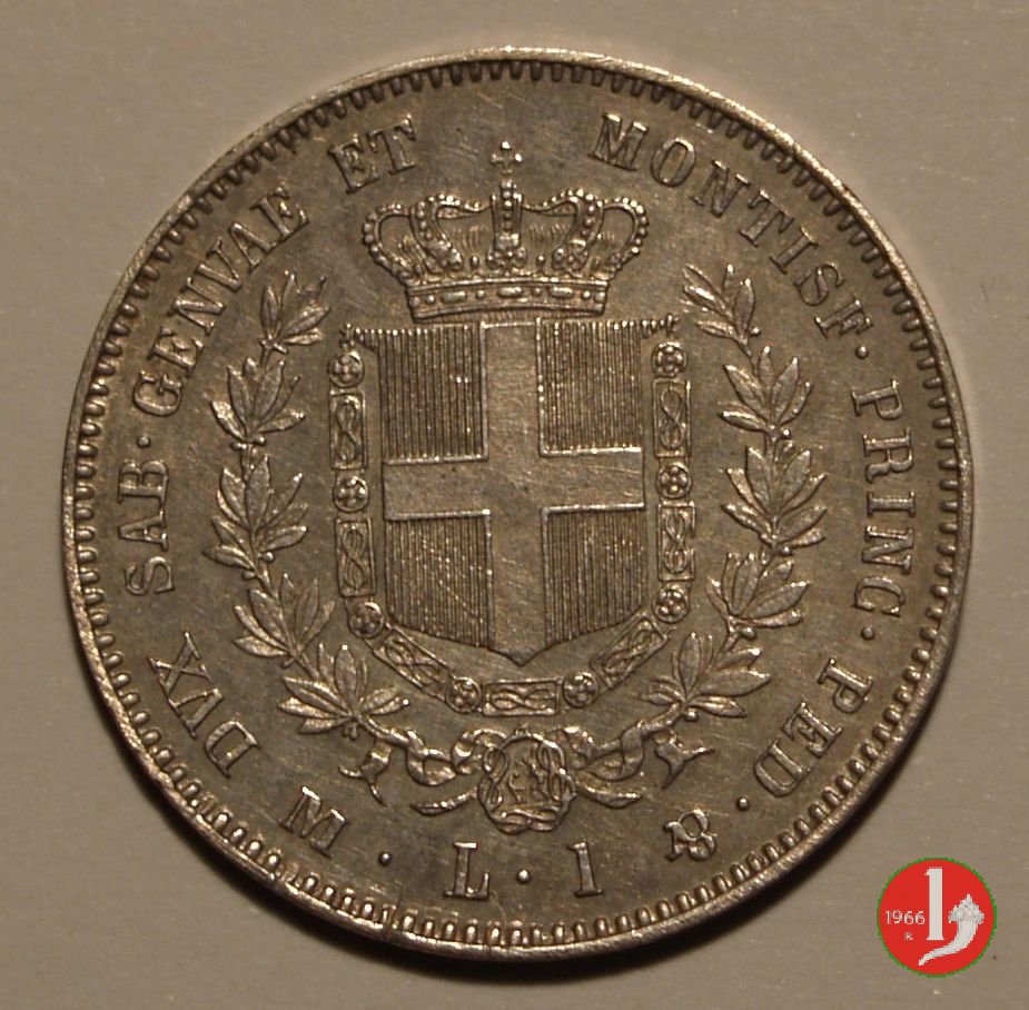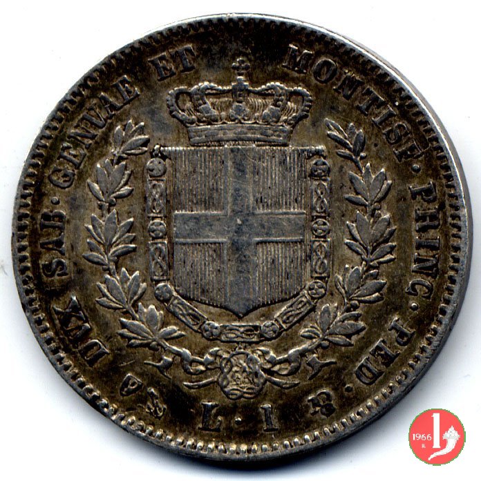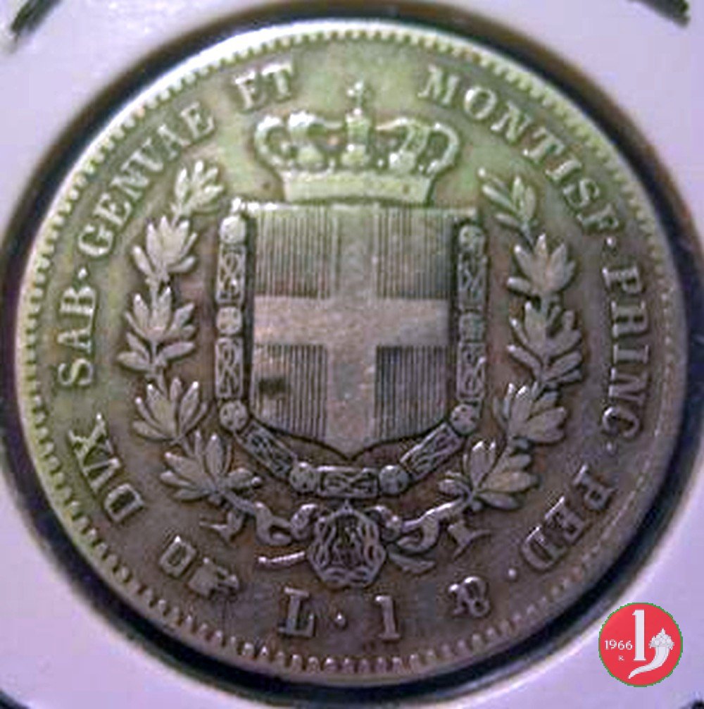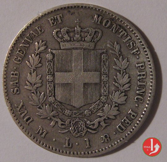Testa del Re a destra, al di sotto della quale si trova il millesimo. Lungo il bordo, VICTORIUS EMANVEL II D • G • REX SARD • CYP • ET HIER • Sul taglio del collo indicazione dell'autore (F • per Ferraris). Stemma con croce Sabauda sovrastato da Corona Reale e fregiato dal collare dell'Annunziata tra rami di lauro. Lungo il bordo: DVX SAB • GENVAE ET MONTISF • PRINC • PED • &. In basso, da sinistra a destra, segno di zecca e indicazione del valore (L • 1).