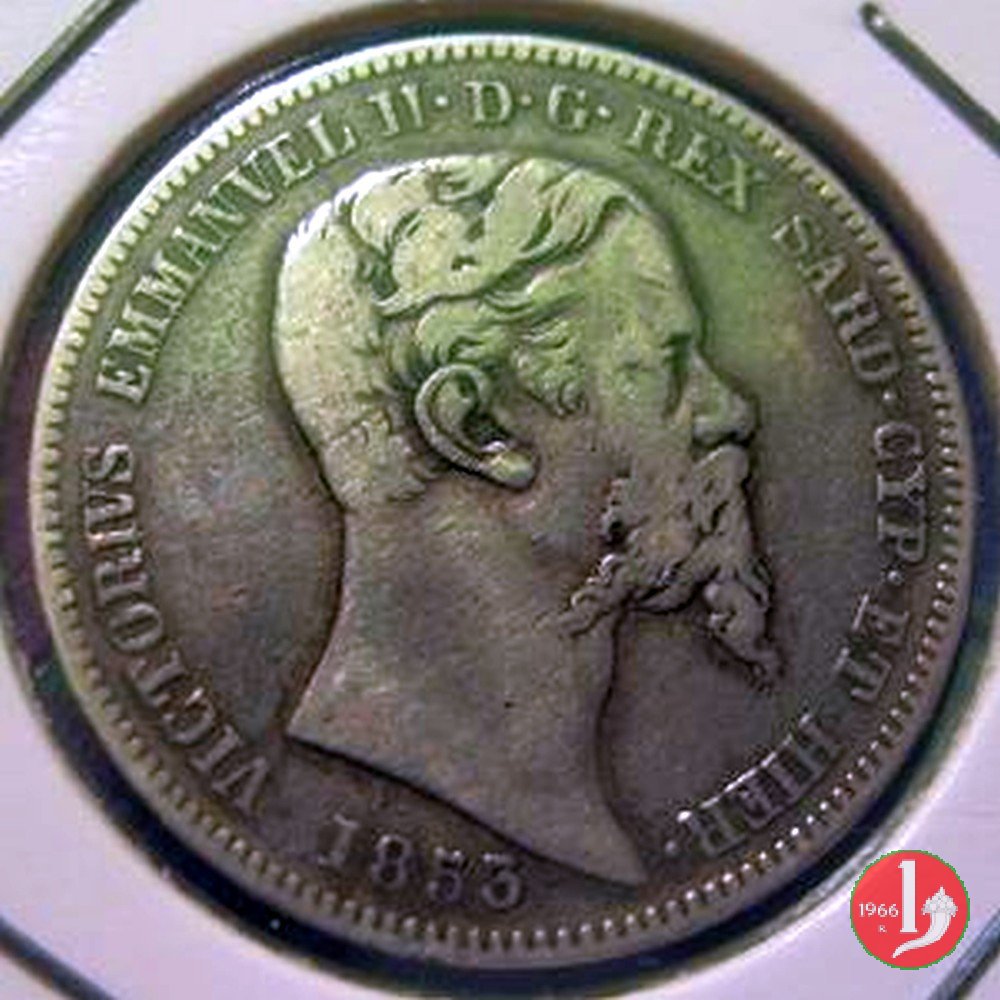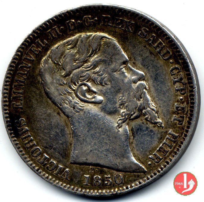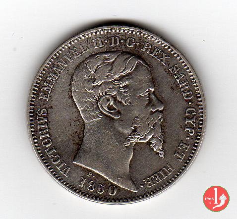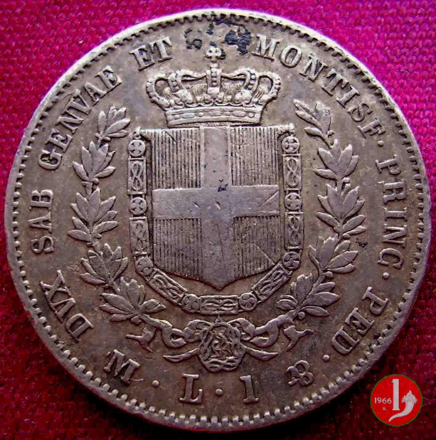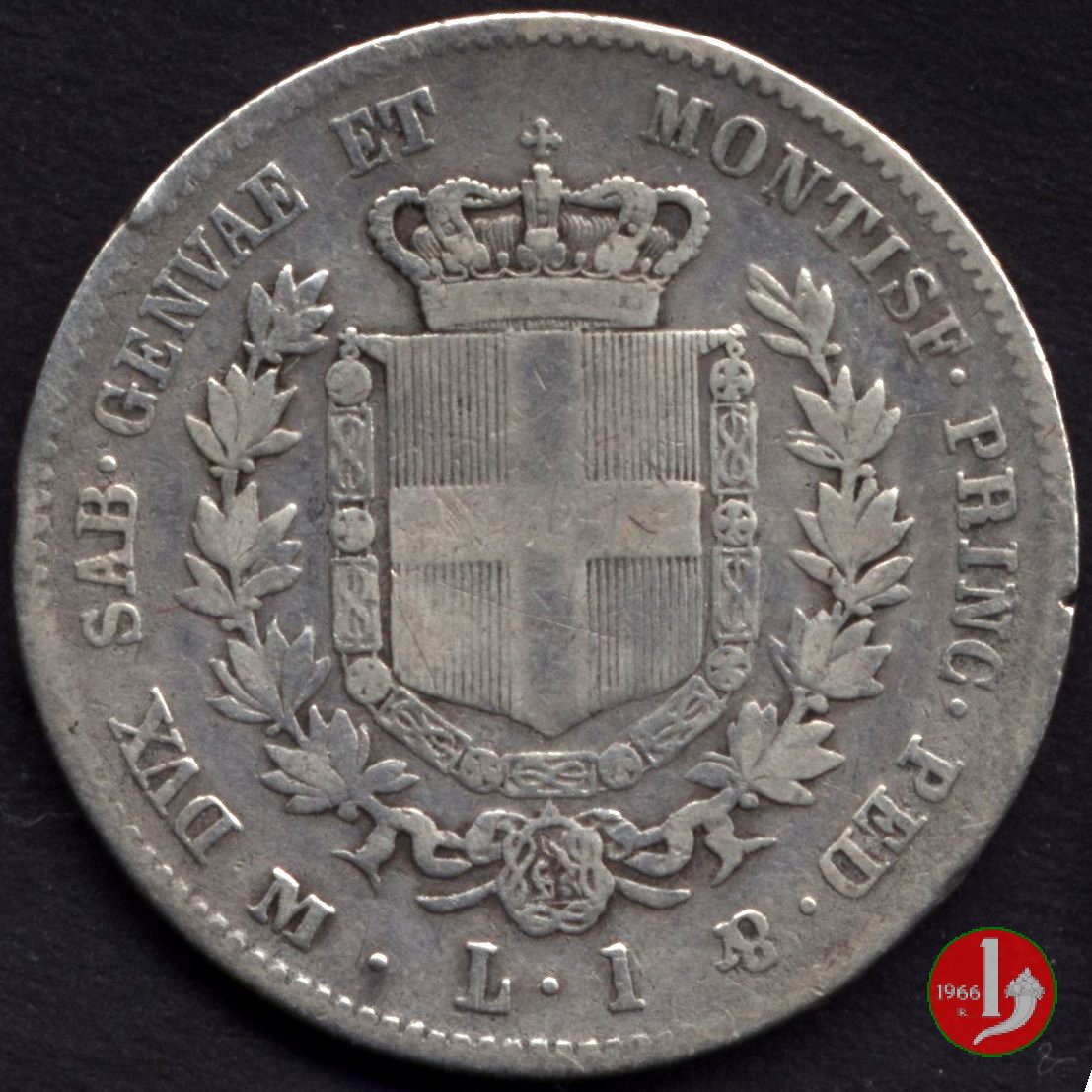 Testa del Re a destra, al di sotto della quale si trova il millesimo. Lungo il bordo, VICTORIUS EMANVEL II D • G • REX SARD • CYP • ET HIER • Sul taglio del collo indicazione dell'autore (F • per Ferraris). Stemma con croce Sabauda sovrastato da Corona Reale e fregiato dal collare dell'Annunziata tra rami di lauro. Lungo il bordo: DVX SAB • GENVAE ET MONTISF • PRINC • PED • &. In basso, da sinistra a destra, segno di zecca e indicazione del valore (L • 1).