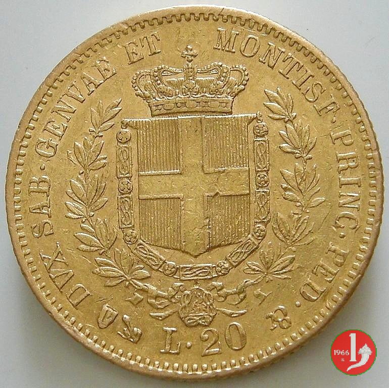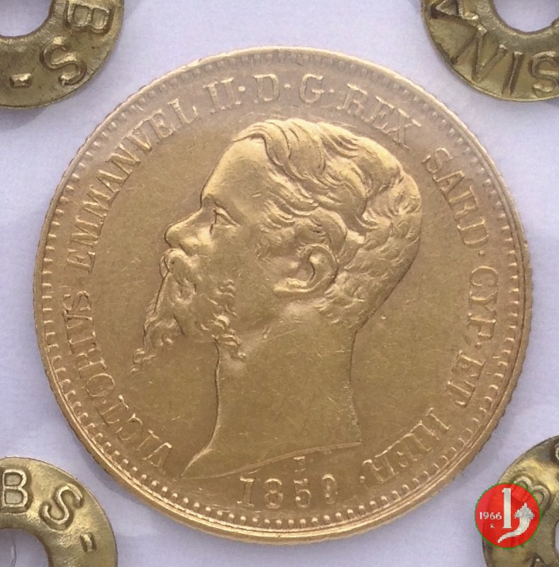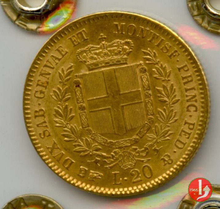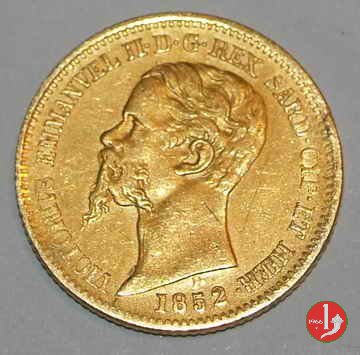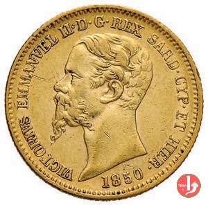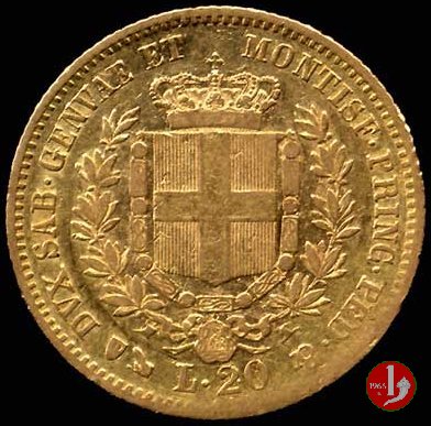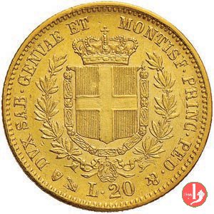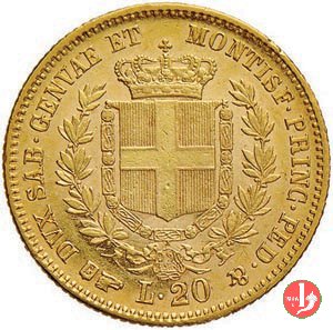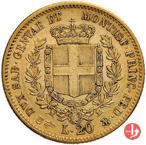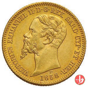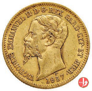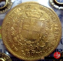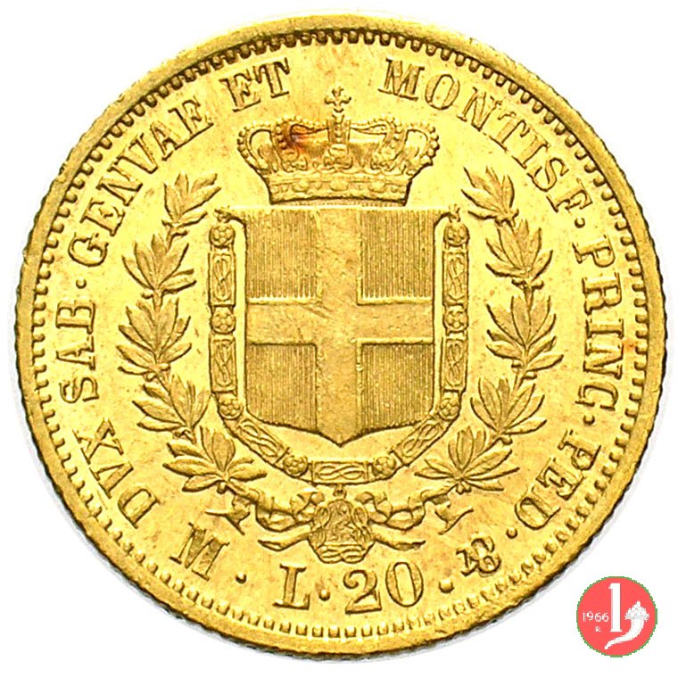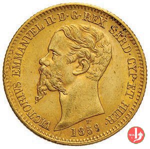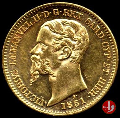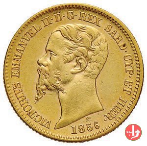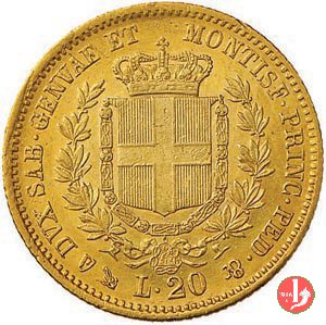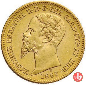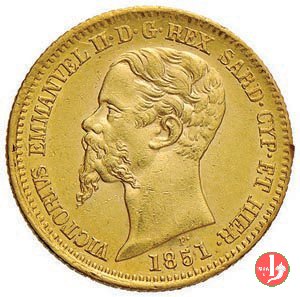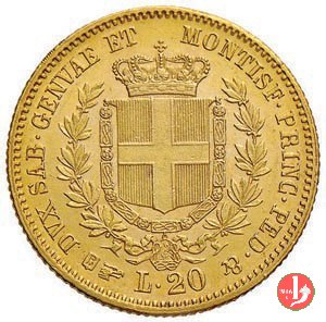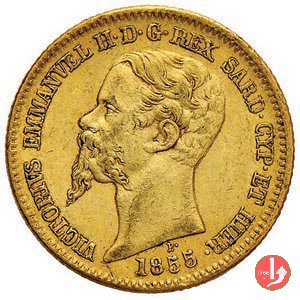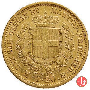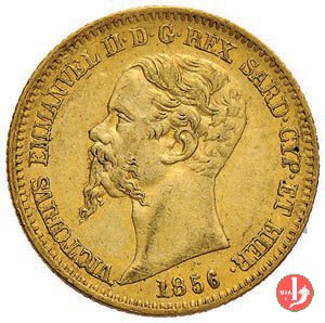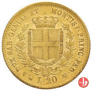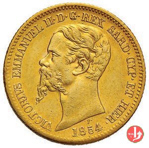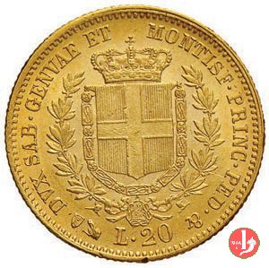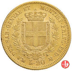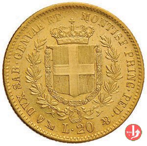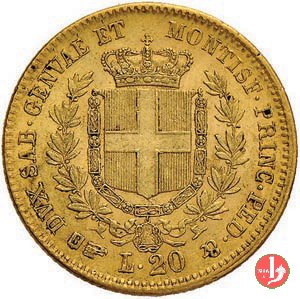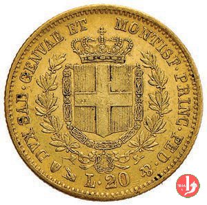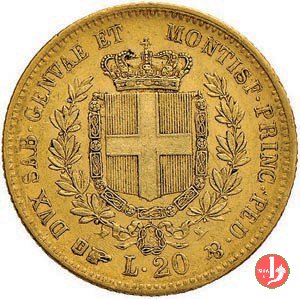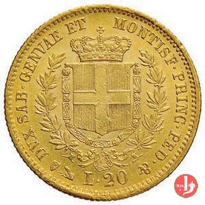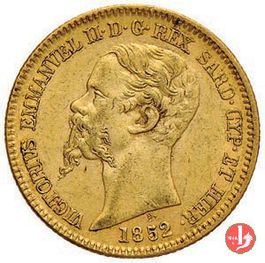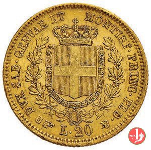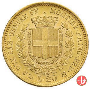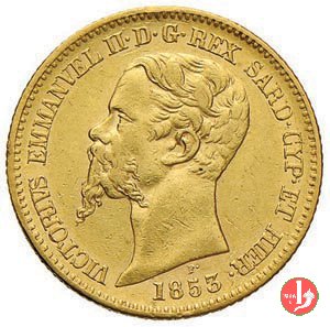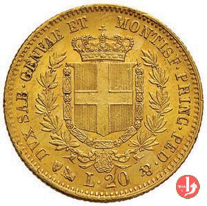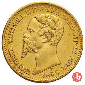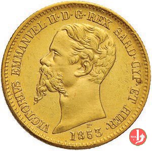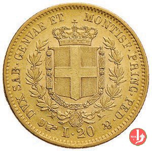dal successivo Marengo del Regno d'Italia. Segno di zecca per Genova, P in incuso all'interno di uno scudetto e ancora. Segno di zecca per Torino, B in incuso all'interno di uno scudetto (iniziale di Tommaso Battilana direttore della zecca di Torino) e testa d'aquila. Segno di zecca per Milano, M •. Il Pagani segnala anche esemplari con millesimi 1853 e 1854 (quest'ultimo teoricamente coniato in 45.670 esemplari) per Torino, tuttavia non risultano apparsi sul mercato.1 | |||||||||||||