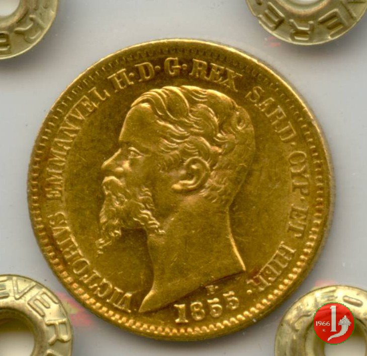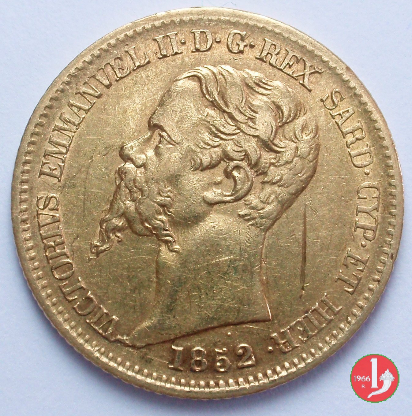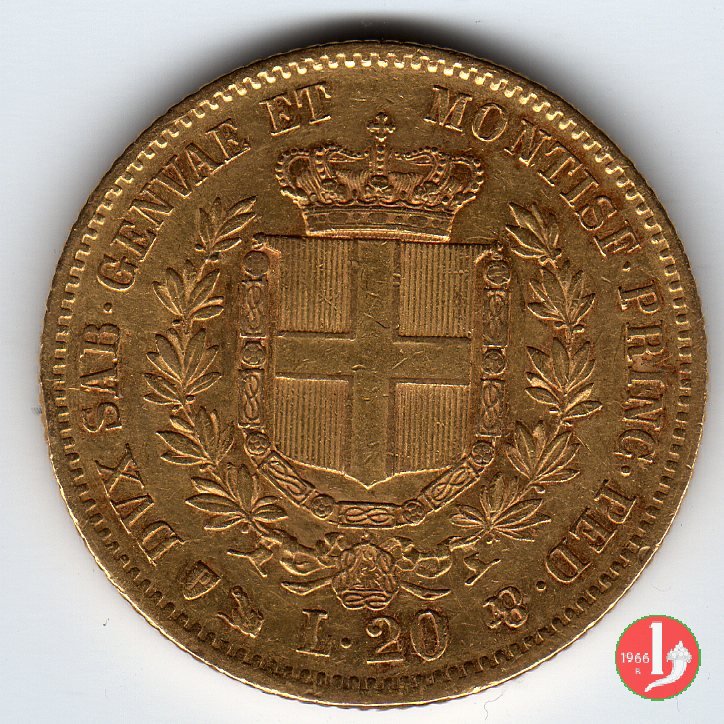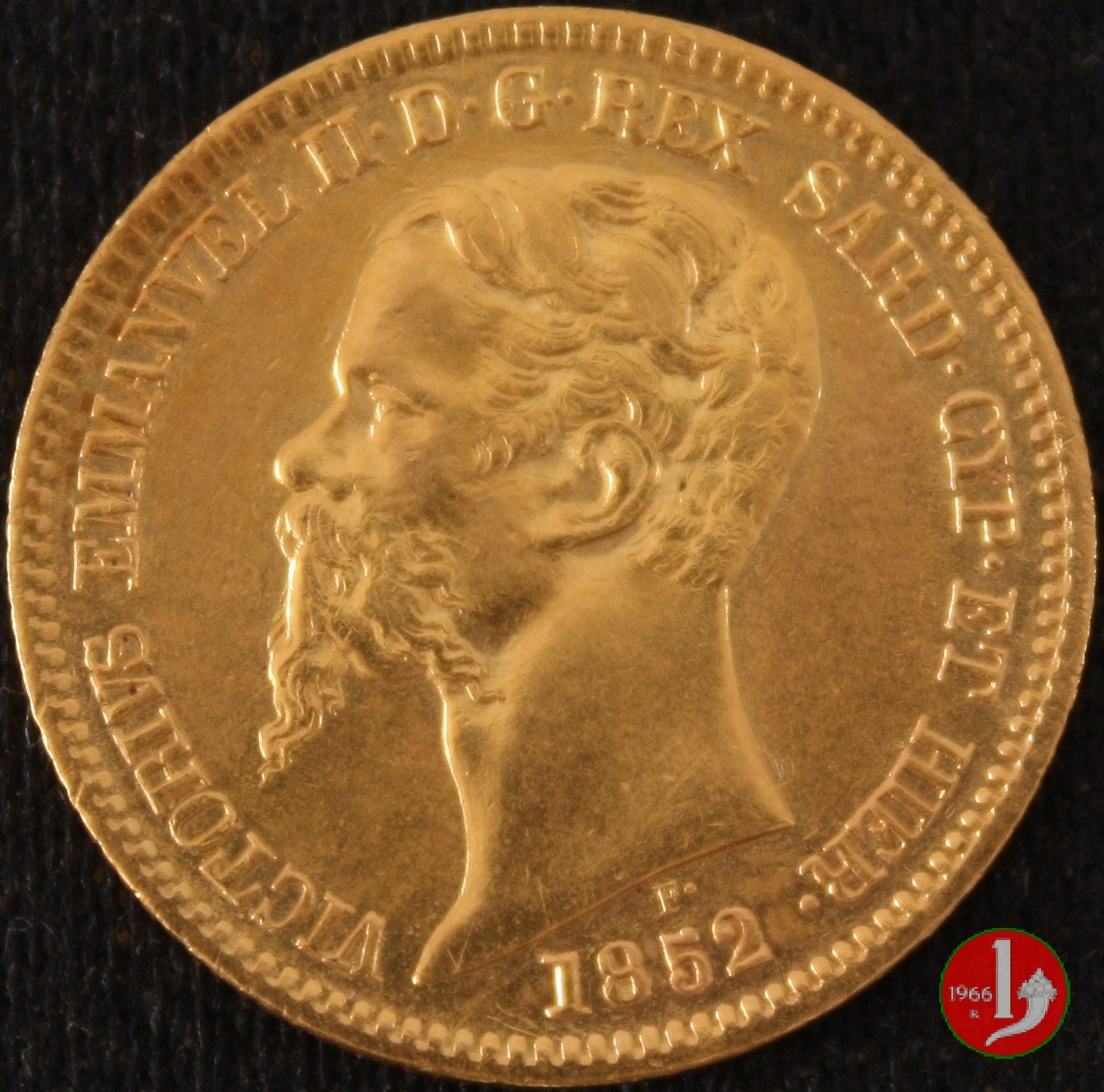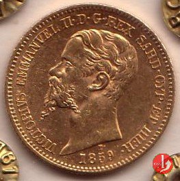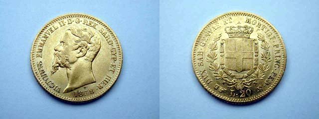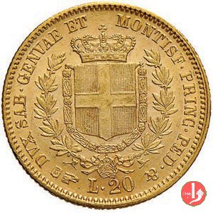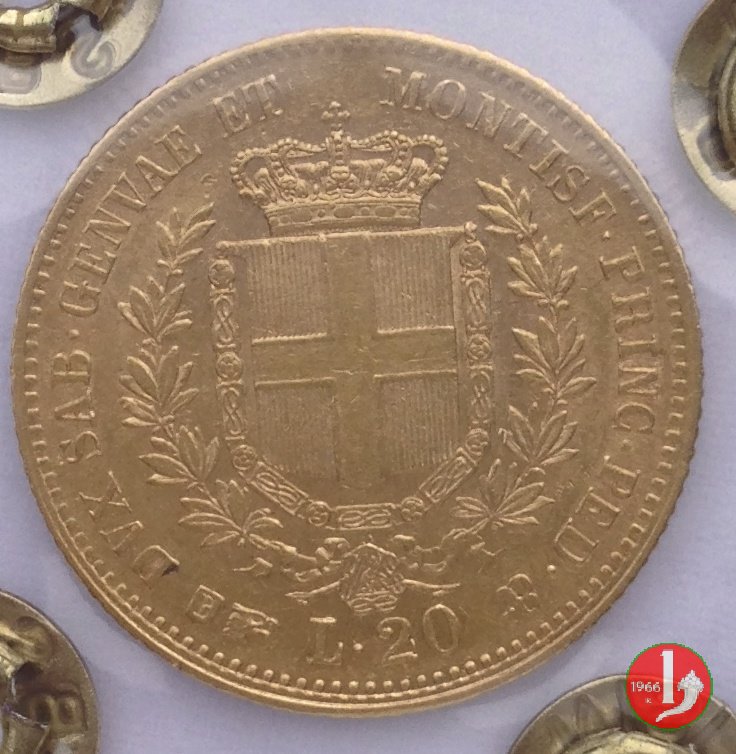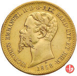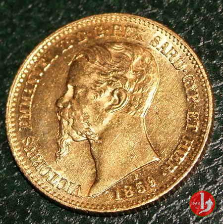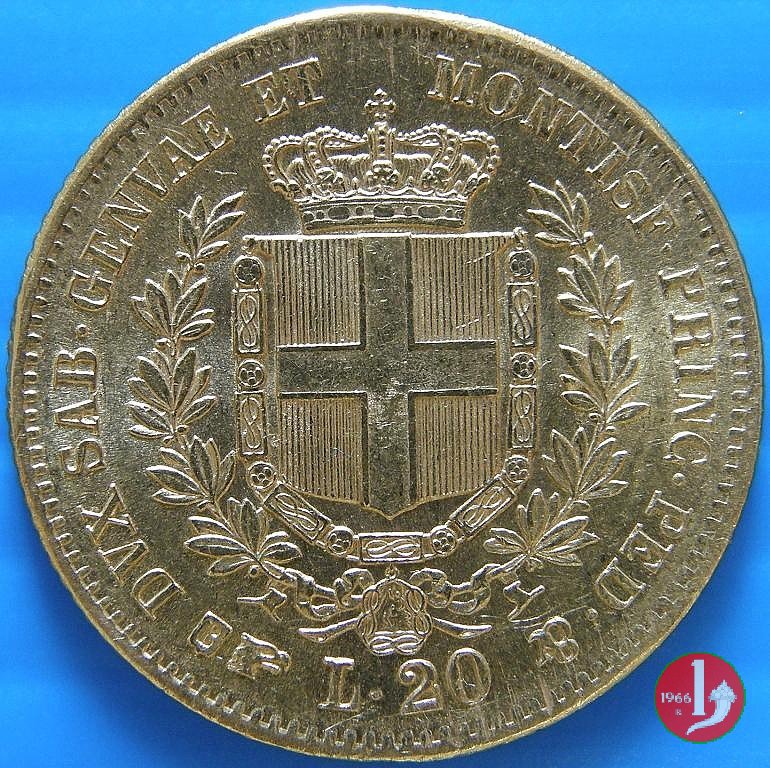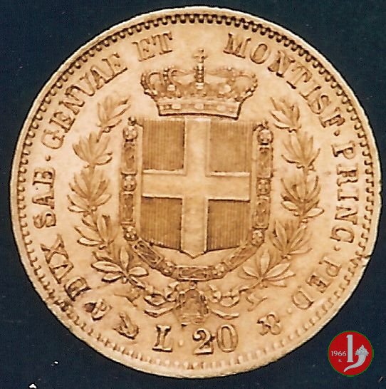 dal successivo Marengo del Regno d'Italia. Segno di zecca per Genova, P in incuso all'interno di uno scudetto e ancora. Segno di zecca per Torino, B in incuso all'interno di uno scudetto (iniziale di Tommaso Battilana direttore della zecca di Torino) e testa d'aquila. Segno di zecca per Milano, M •. Il Pagani segnala anche esemplari con millesimi 1853 e 1854 (quest'ultimo teoricamente coniato in 45.670 esemplari) per Torino, tuttavia non risultano apparsi sul mercato.1 | |||||||||||||