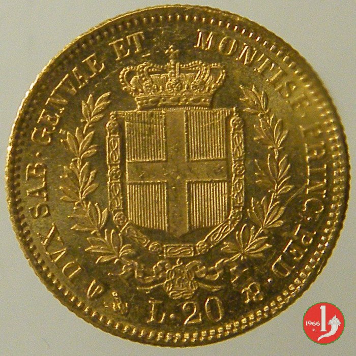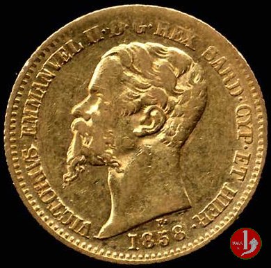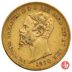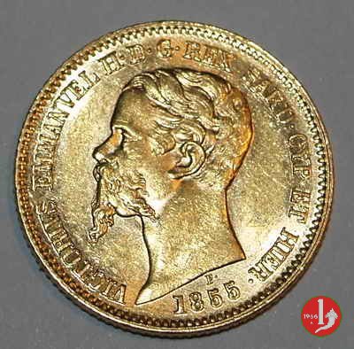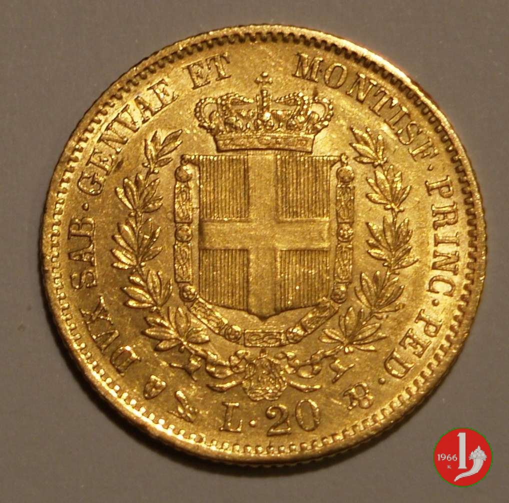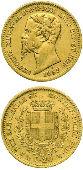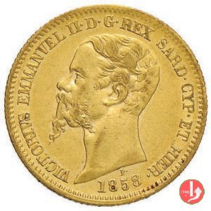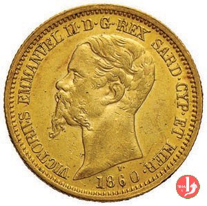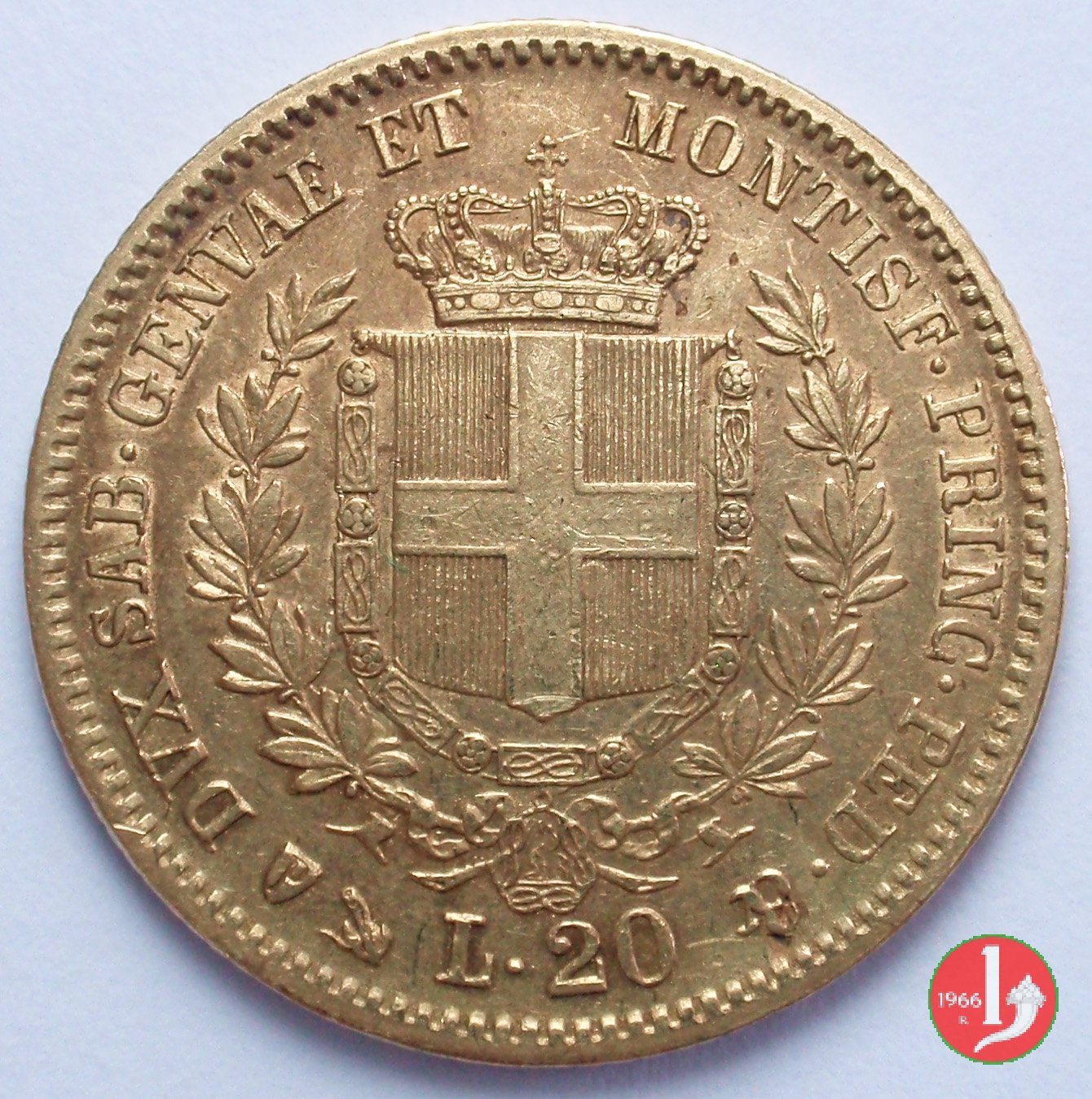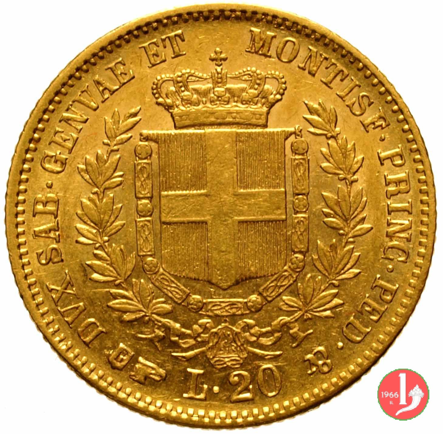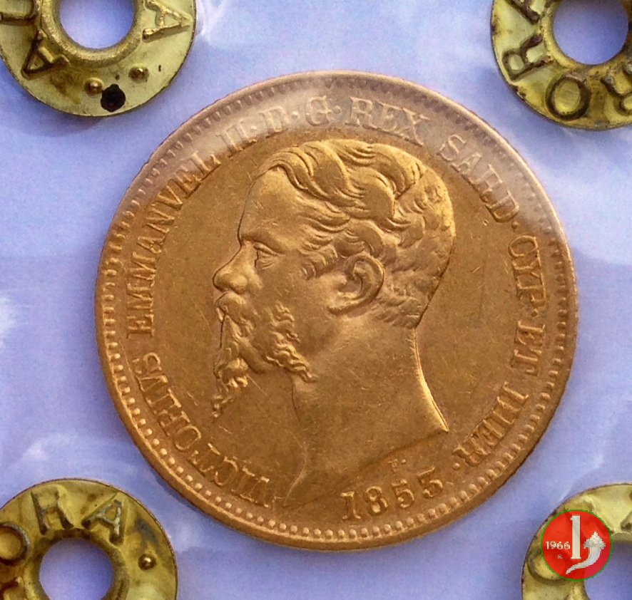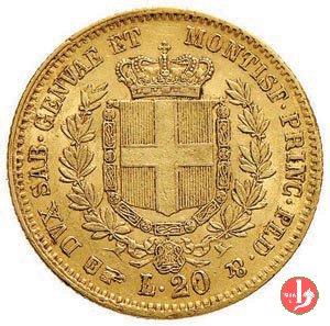 dal successivo Marengo del Regno d'Italia. Segno di zecca per Genova, P in incuso all'interno di uno scudetto e ancora. Segno di zecca per Torino, B in incuso all'interno di uno scudetto (iniziale di Tommaso Battilana direttore della zecca di Torino) e testa d'aquila. Segno di zecca per Milano, M •. Il Pagani segnala anche esemplari con millesimi 1853 e 1854 (quest'ultimo teoricamente coniato in 45.670 esemplari) per Torino, tuttavia non risultano apparsi sul mercato.1 | |||||||||||||