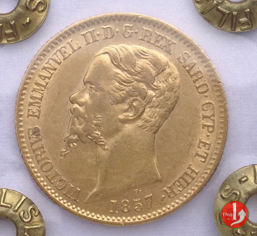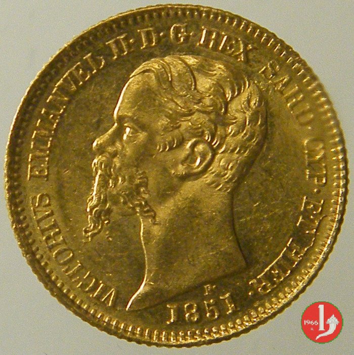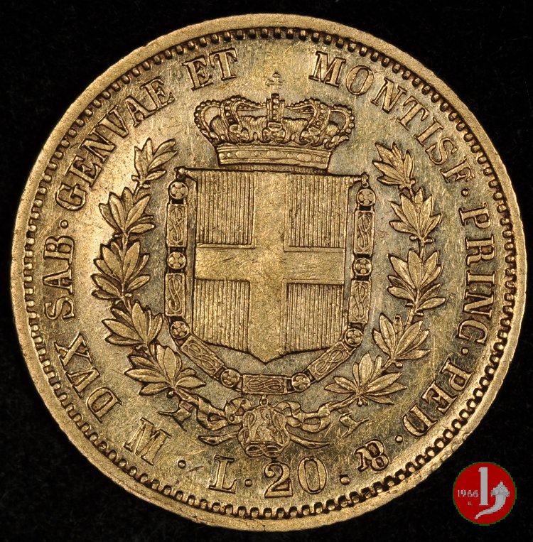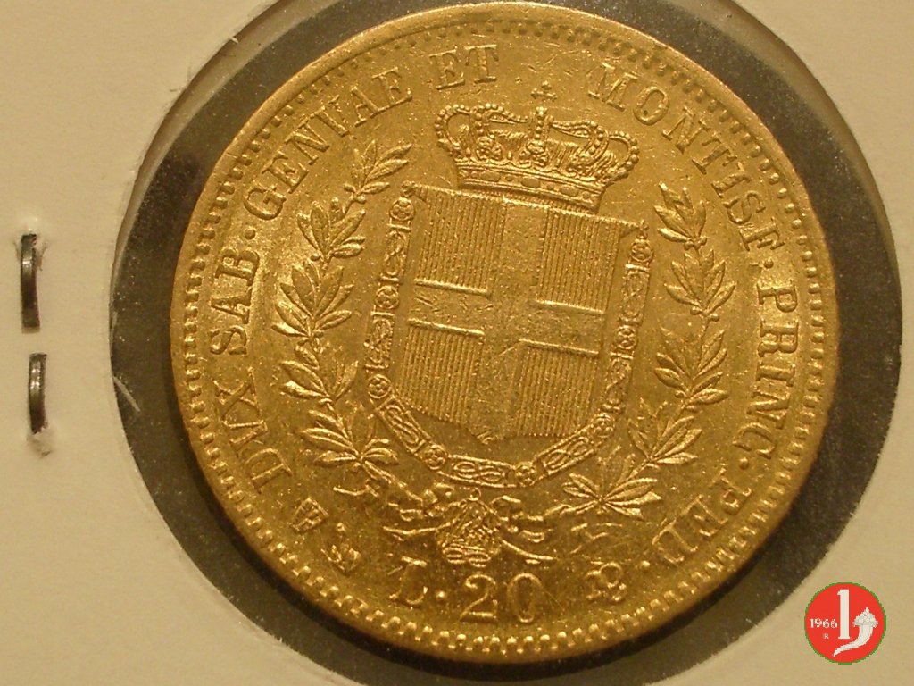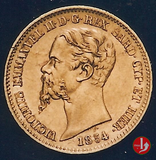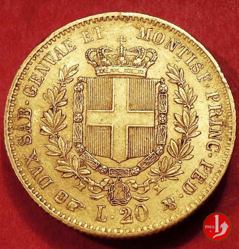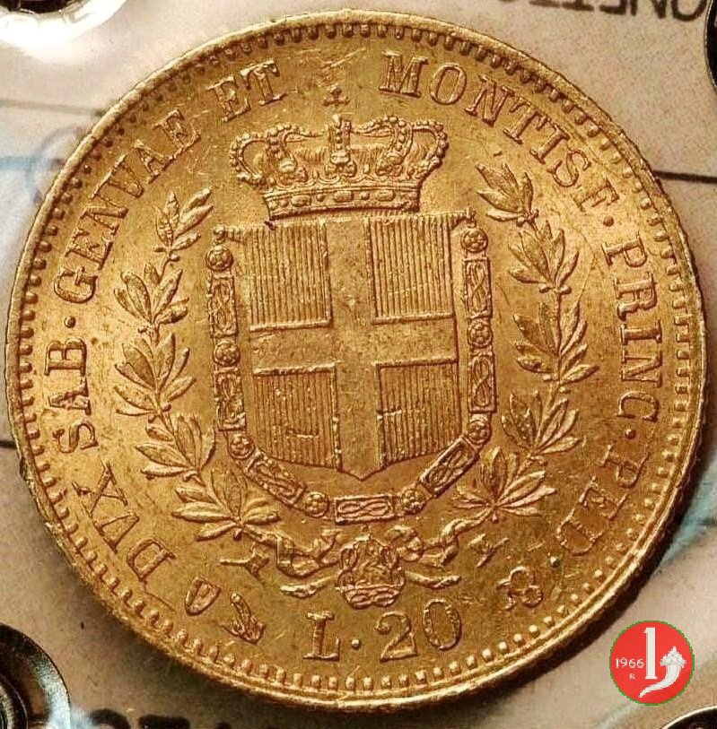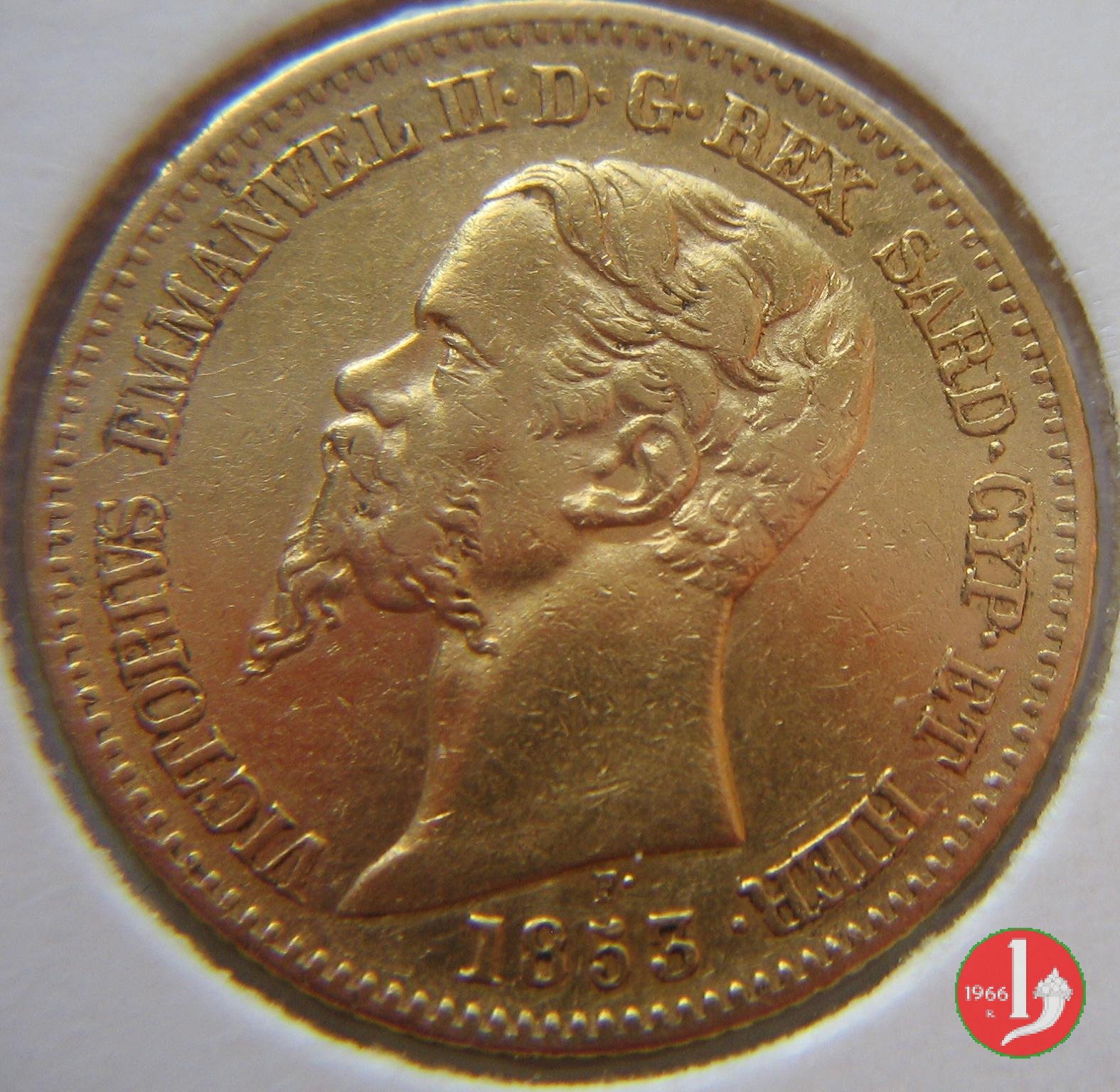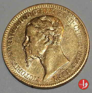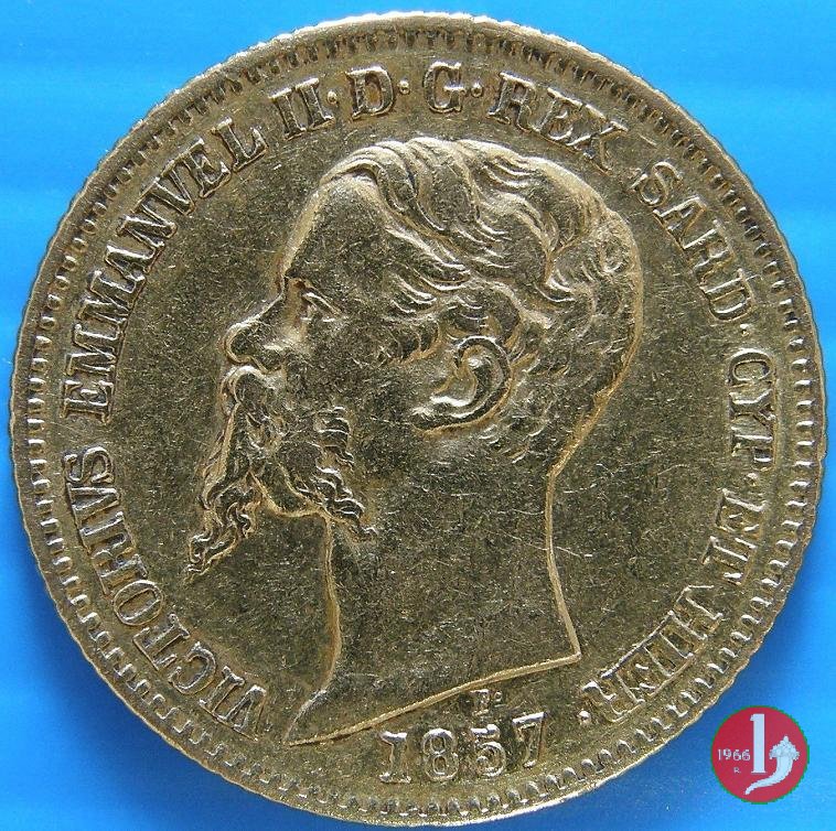 dal successivo Marengo del Regno d'Italia. Segno di zecca per Genova, P in incuso all'interno di uno scudetto e ancora. Segno di zecca per Torino, B in incuso all'interno di uno scudetto (iniziale di Tommaso Battilana direttore della zecca di Torino) e testa d'aquila. Segno di zecca per Milano, M •. Il Pagani segnala anche esemplari con millesimi 1853 e 1854 (quest'ultimo teoricamente coniato in 45.670 esemplari) per Torino, tuttavia non risultano apparsi sul mercato.1 | |||||||||||||