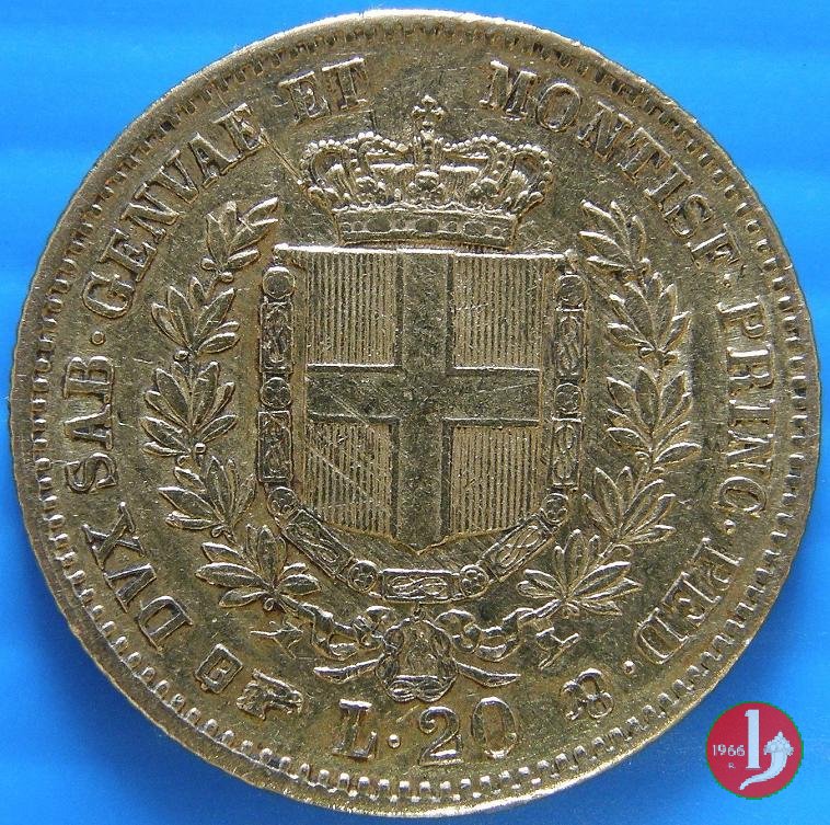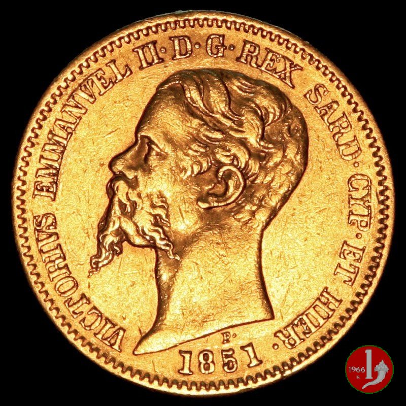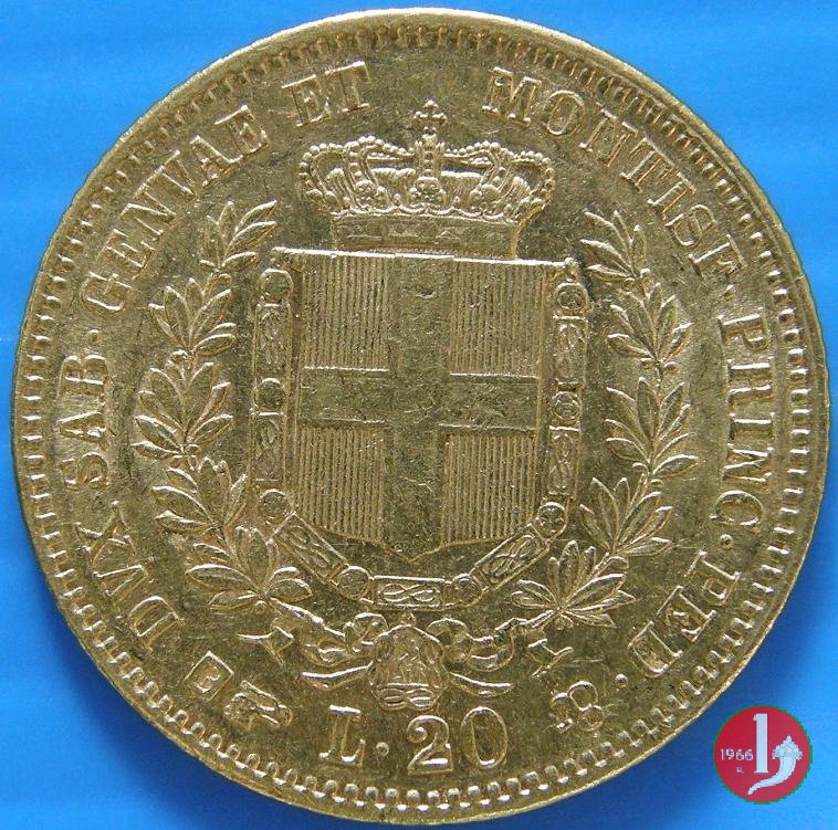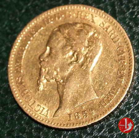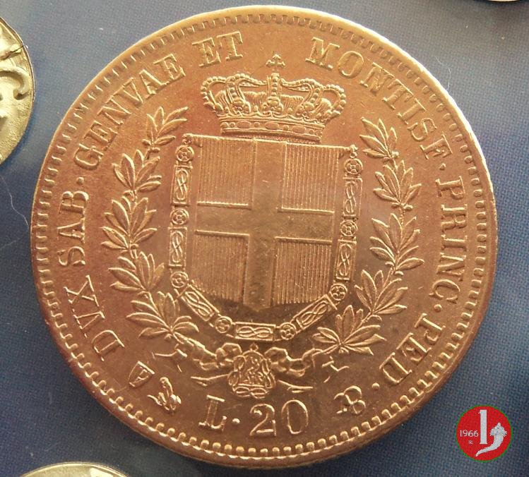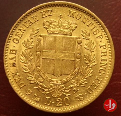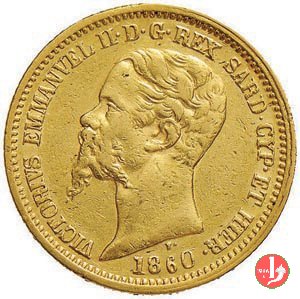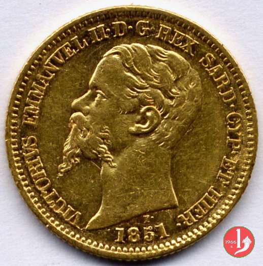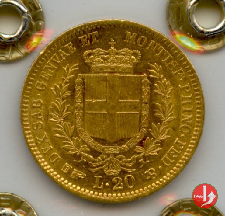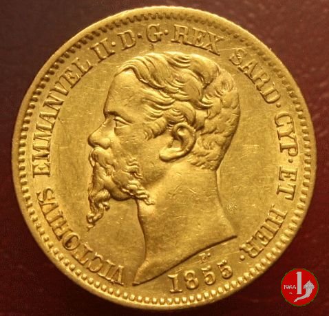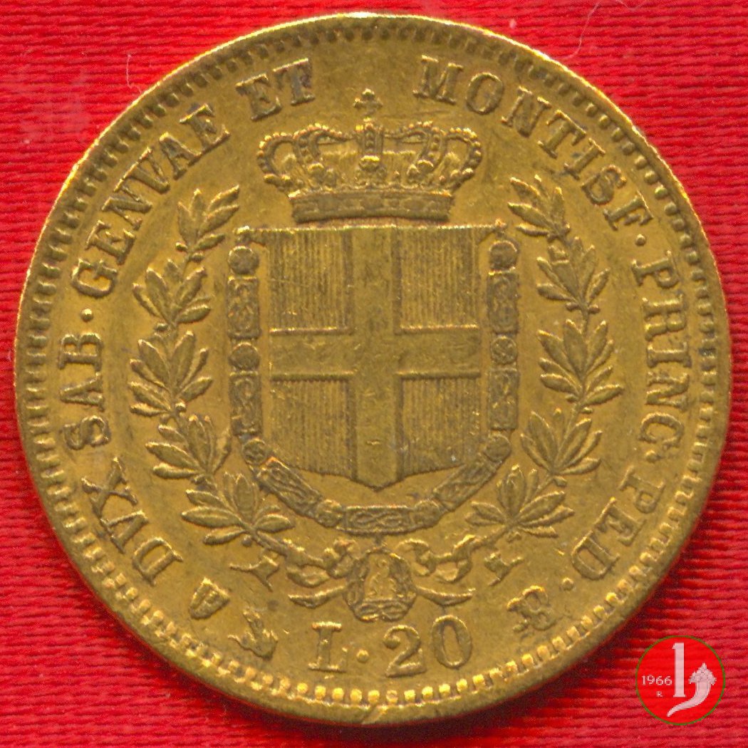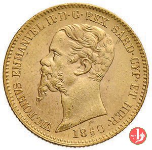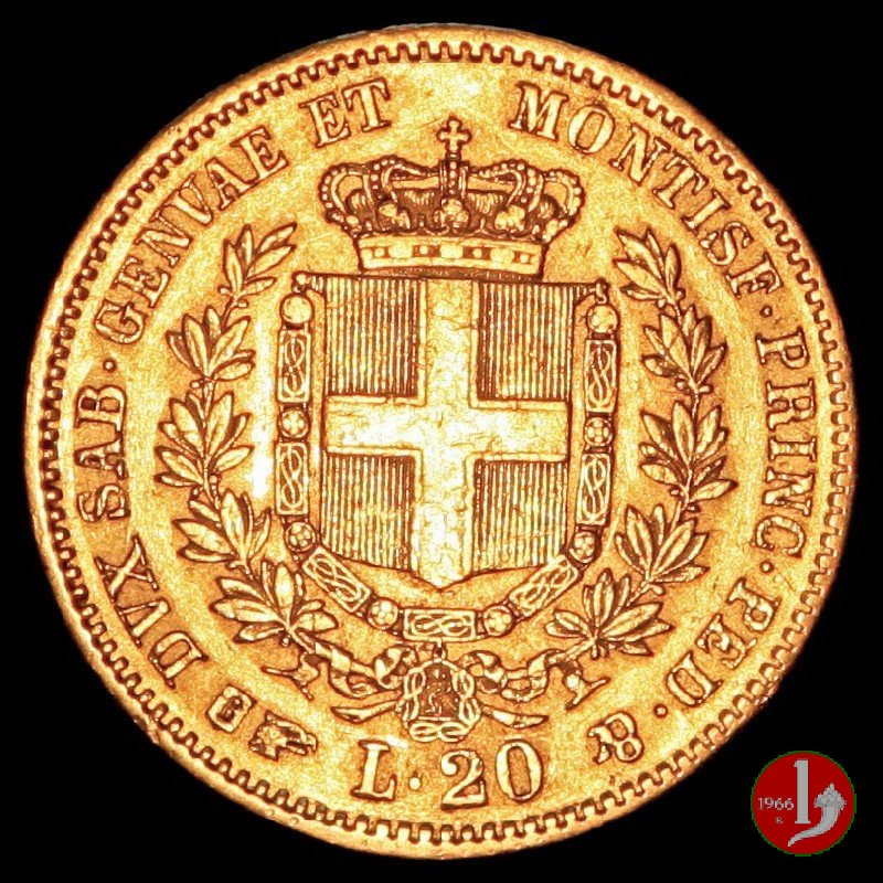 dal successivo Marengo del Regno d'Italia. Segno di zecca per Genova, P in incuso all'interno di uno scudetto e ancora. Segno di zecca per Torino, B in incuso all'interno di uno scudetto (iniziale di Tommaso Battilana direttore della zecca di Torino) e testa d'aquila. Segno di zecca per Milano, M •. Il Pagani segnala anche esemplari con millesimi 1853 e 1854 (quest'ultimo teoricamente coniato in 45.670 esemplari) per Torino, tuttavia non risultano apparsi sul mercato.1 | |||||||||||||