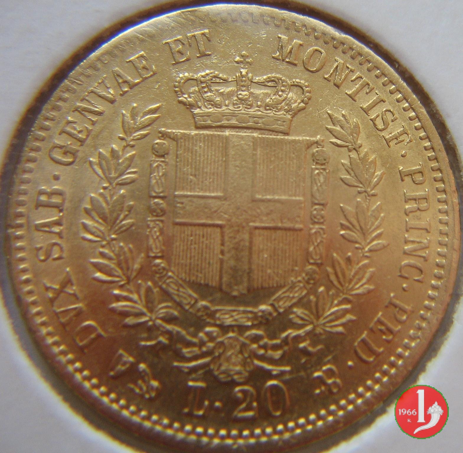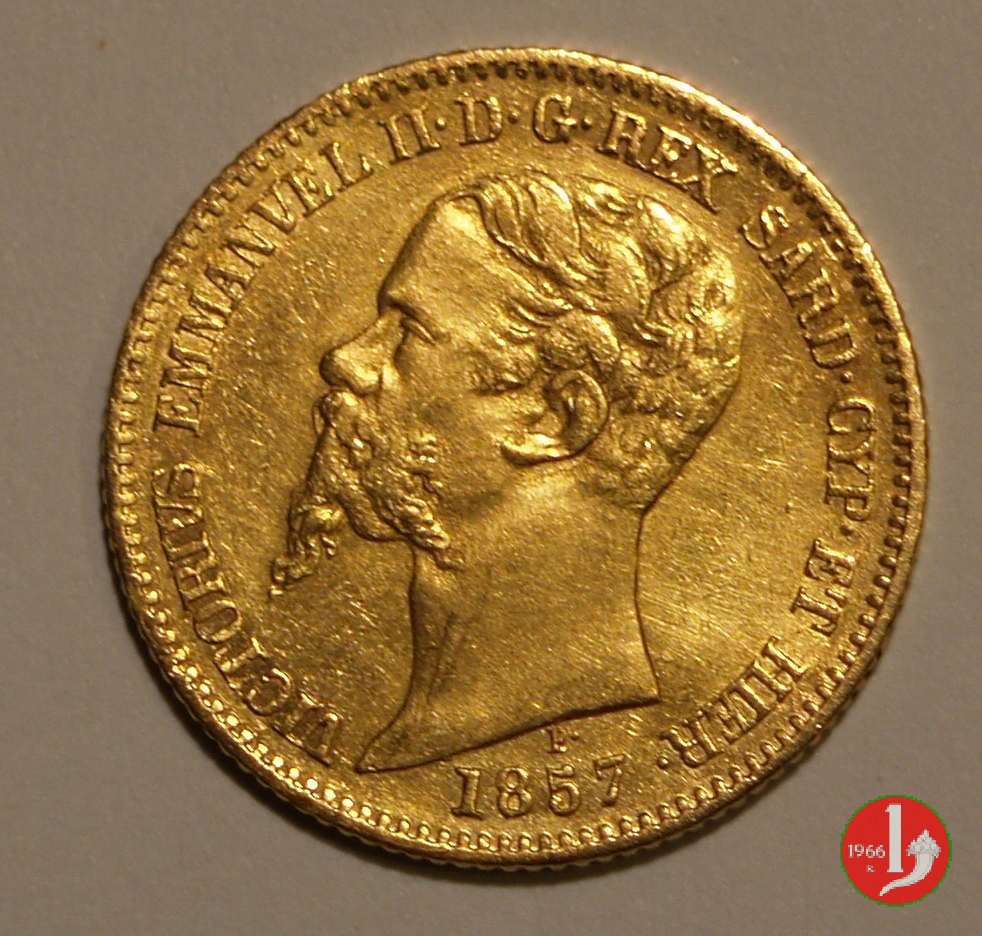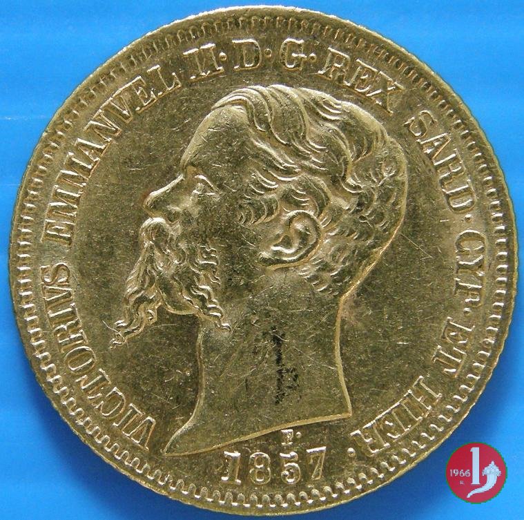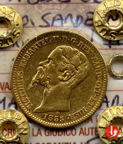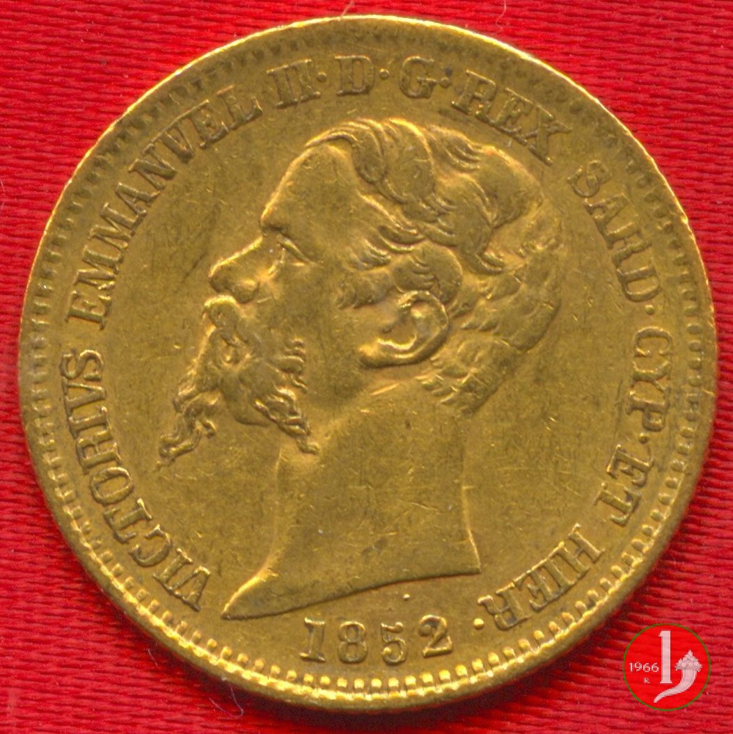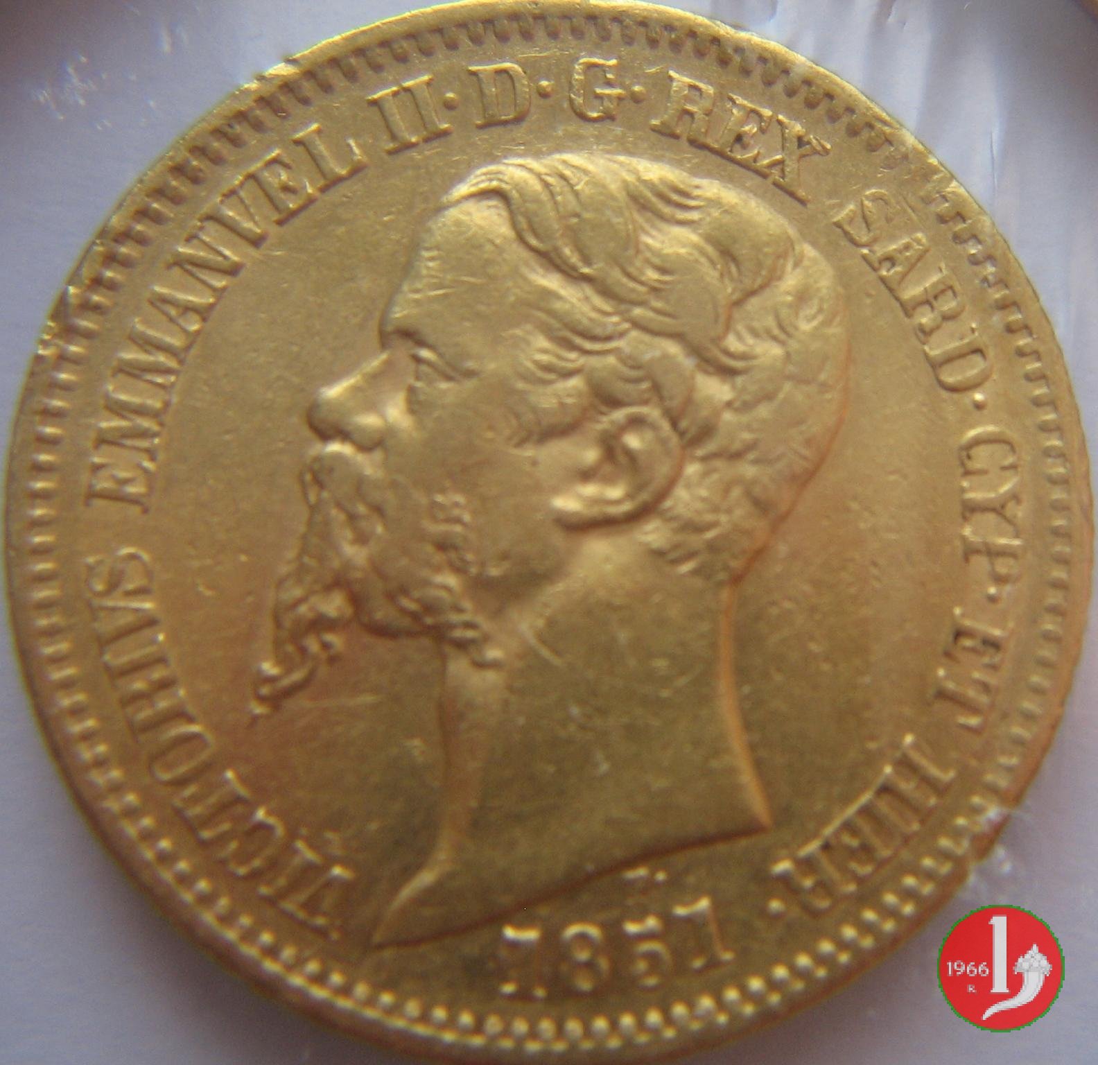 dal successivo Marengo del Regno d'Italia. Segno di zecca per Genova, P in incuso all'interno di uno scudetto e ancora. Segno di zecca per Torino, B in incuso all'interno di uno scudetto (iniziale di Tommaso Battilana direttore della zecca di Torino) e testa d'aquila. Segno di zecca per Milano, M •. Il Pagani segnala anche esemplari con millesimi 1853 e 1854 (quest'ultimo teoricamente coniato in 45.670 esemplari) per Torino, tuttavia non risultano apparsi sul mercato.1 | |||||||||||||