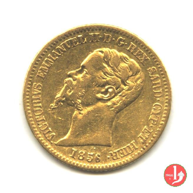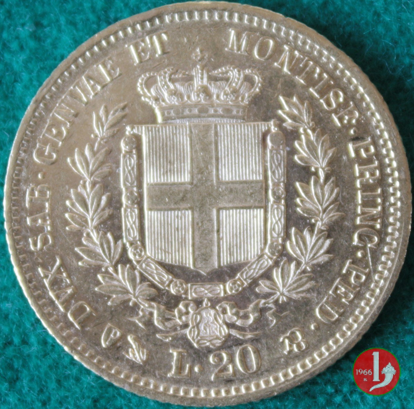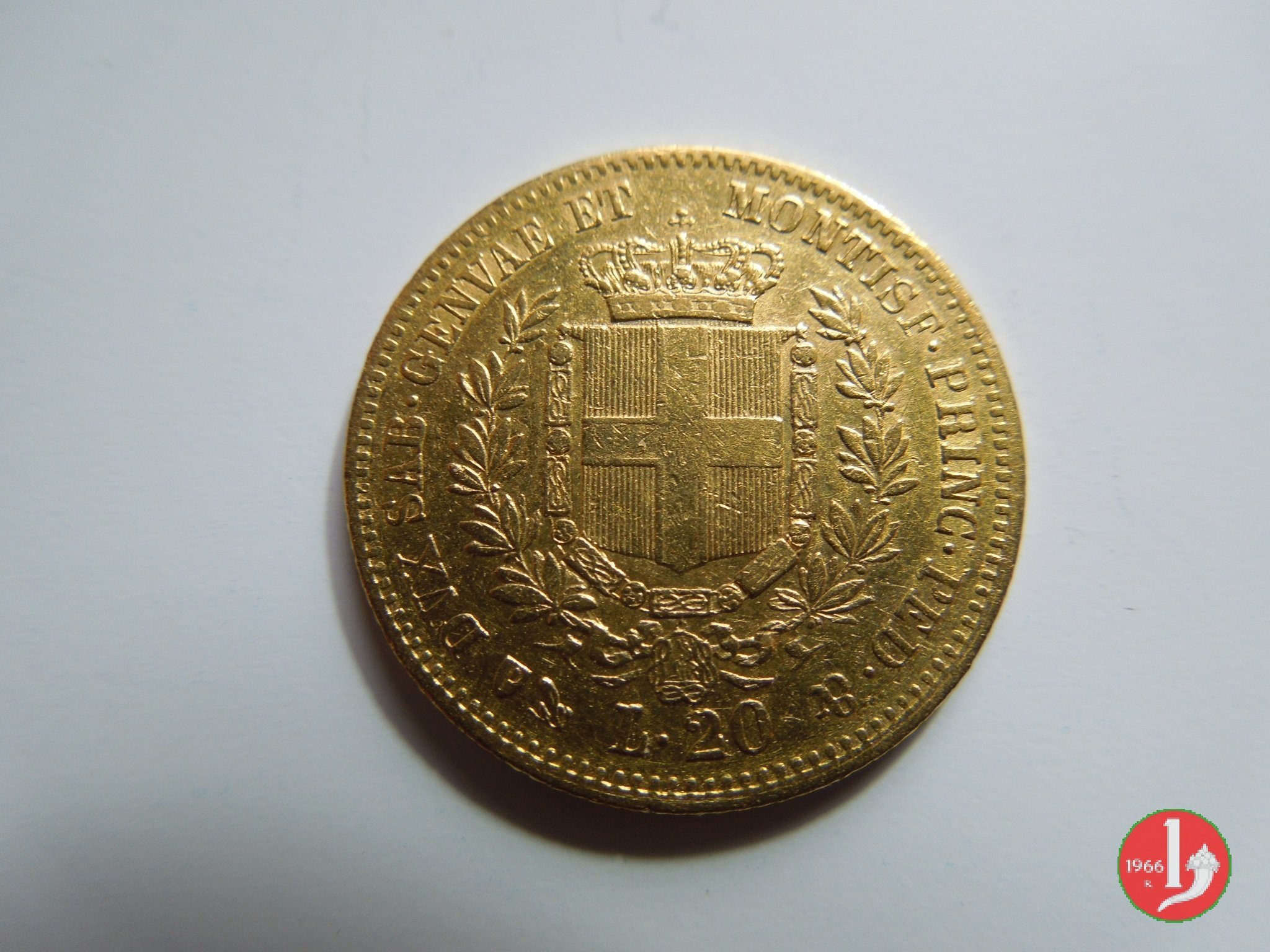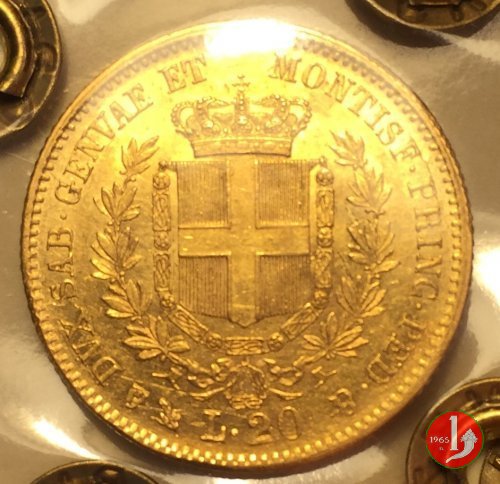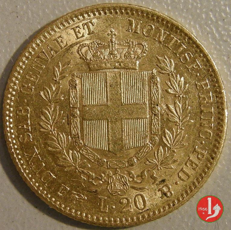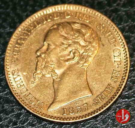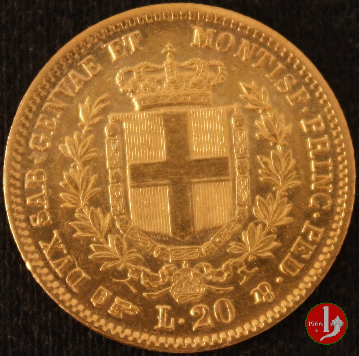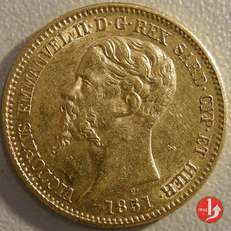dal successivo Marengo del Regno d'Italia. Segno di zecca per Genova, P in incuso all'interno di uno scudetto e ancora. Segno di zecca per Torino, B in incuso all'interno di uno scudetto (iniziale di Tommaso Battilana direttore della zecca di Torino) e testa d'aquila. Segno di zecca per Milano, M •. Il Pagani segnala anche esemplari con millesimi 1853 e 1854 (quest'ultimo teoricamente coniato in 45.670 esemplari) per Torino, tuttavia non risultano apparsi sul mercato.1 | |||||||||||||