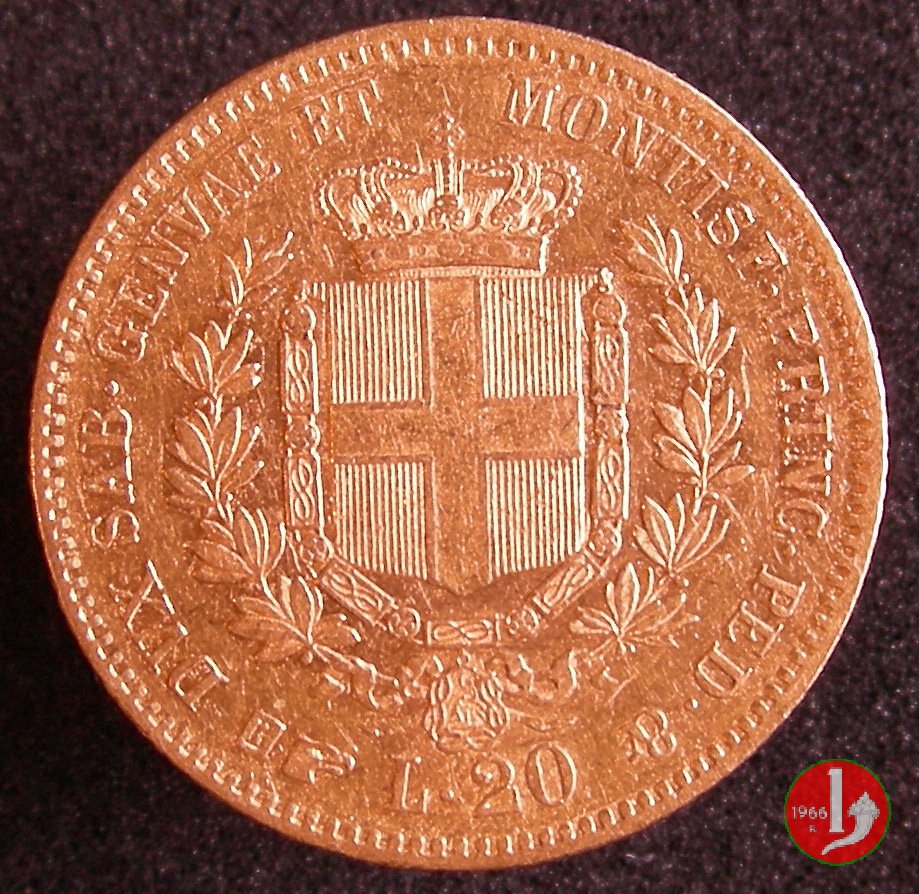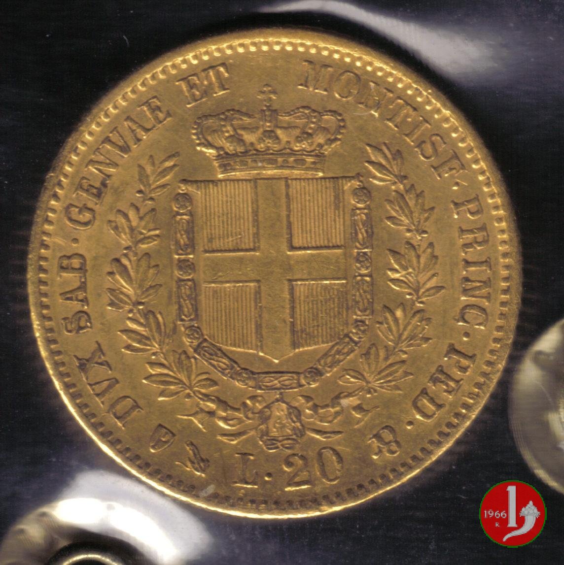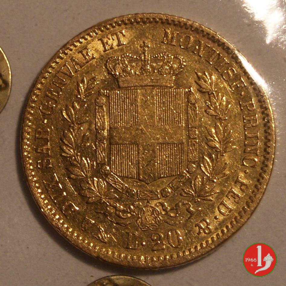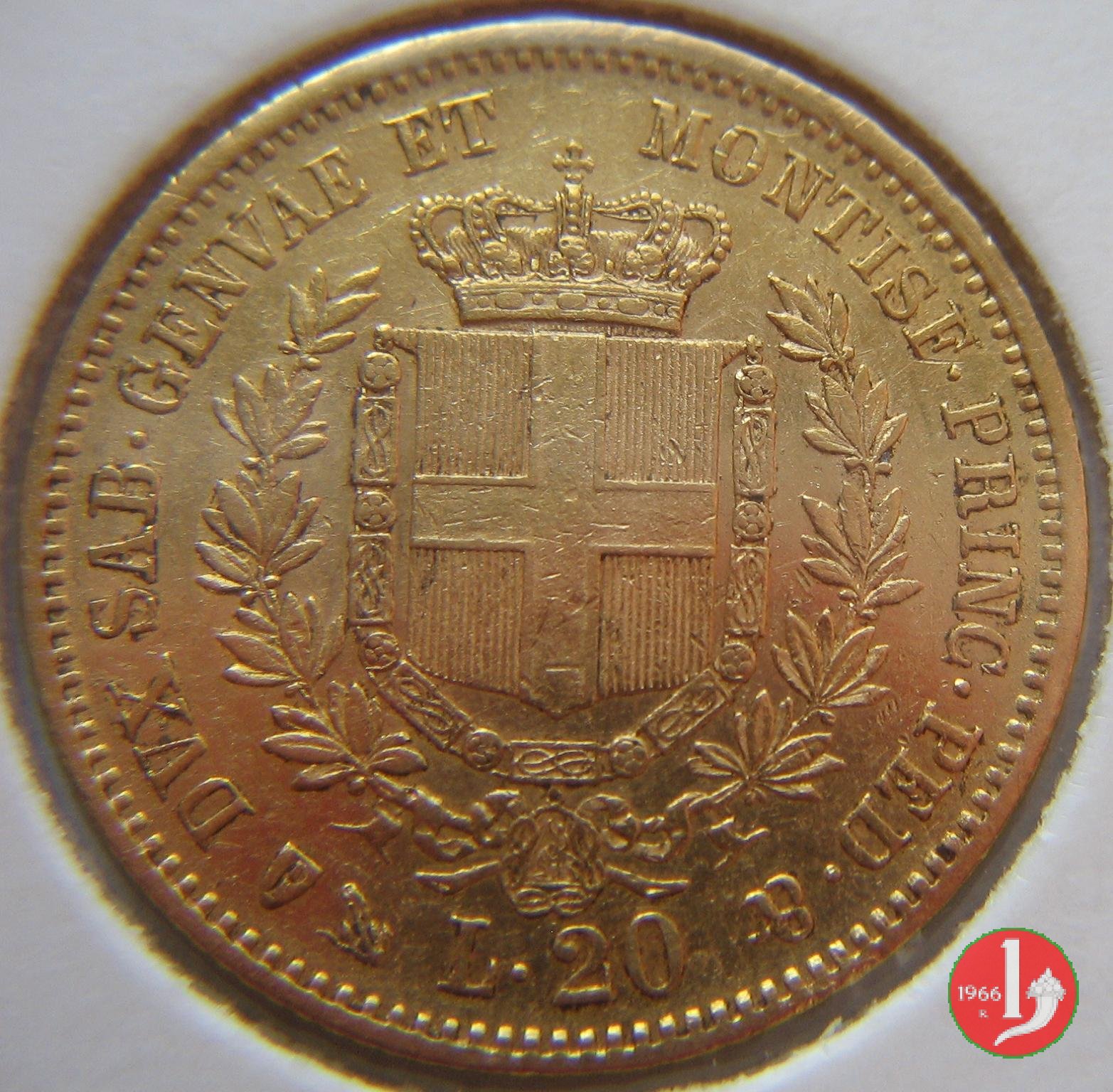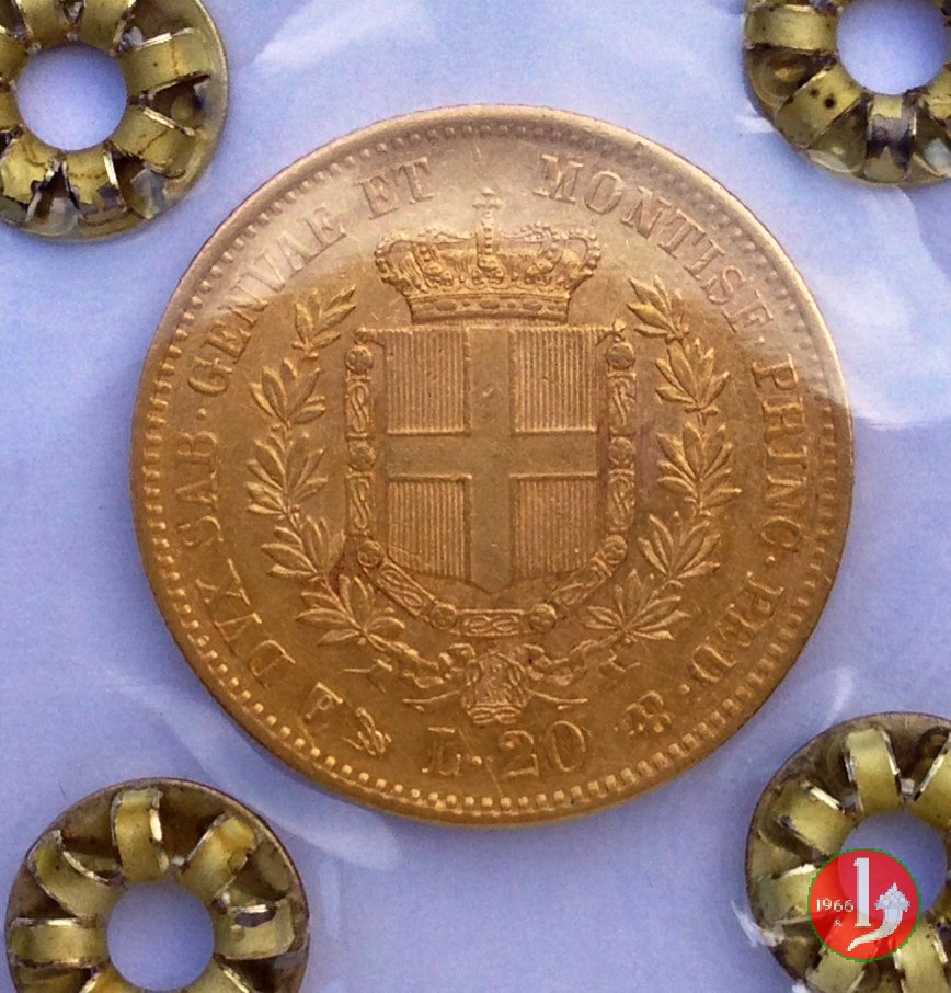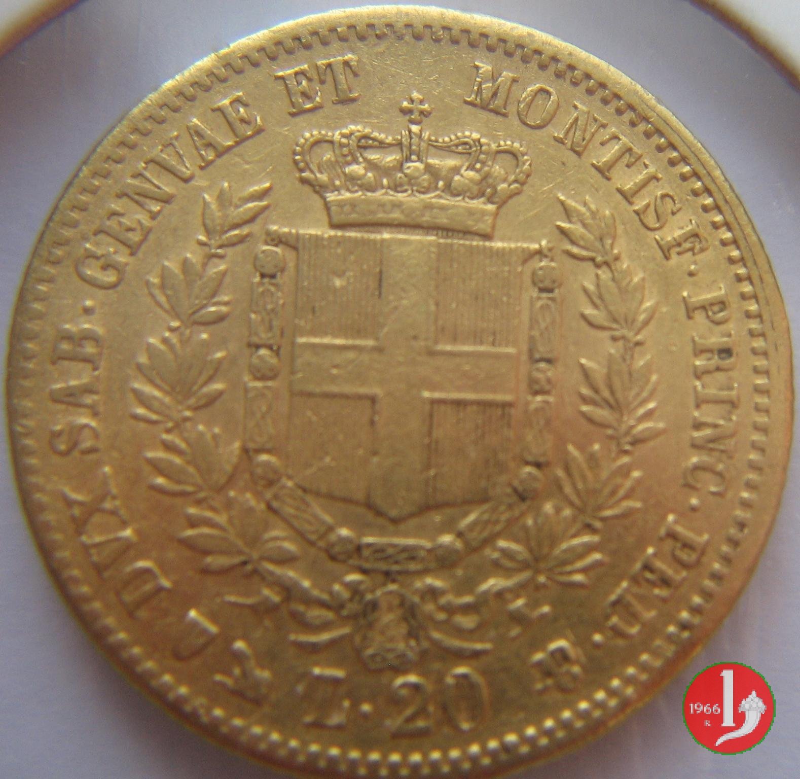 dal successivo Marengo del Regno d'Italia. Segno di zecca per Genova, P in incuso all'interno di uno scudetto e ancora. Segno di zecca per Torino, B in incuso all'interno di uno scudetto (iniziale di Tommaso Battilana direttore della zecca di Torino) e testa d'aquila. Segno di zecca per Milano, M •. Il Pagani segnala anche esemplari con millesimi 1853 e 1854 (quest'ultimo teoricamente coniato in 45.670 esemplari) per Torino, tuttavia non risultano apparsi sul mercato.1 | |||||||||||||