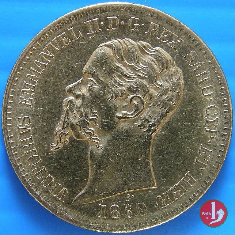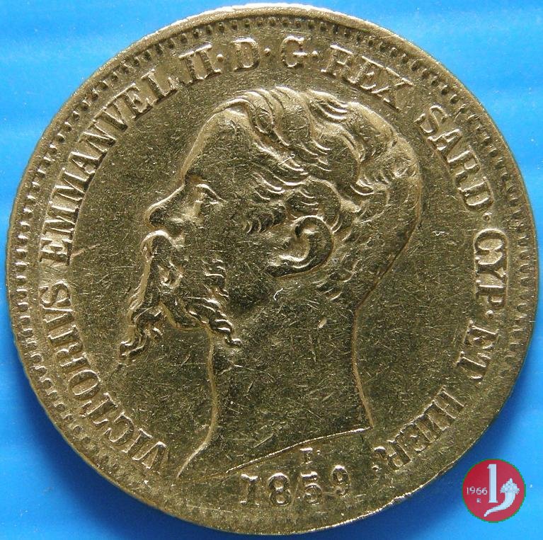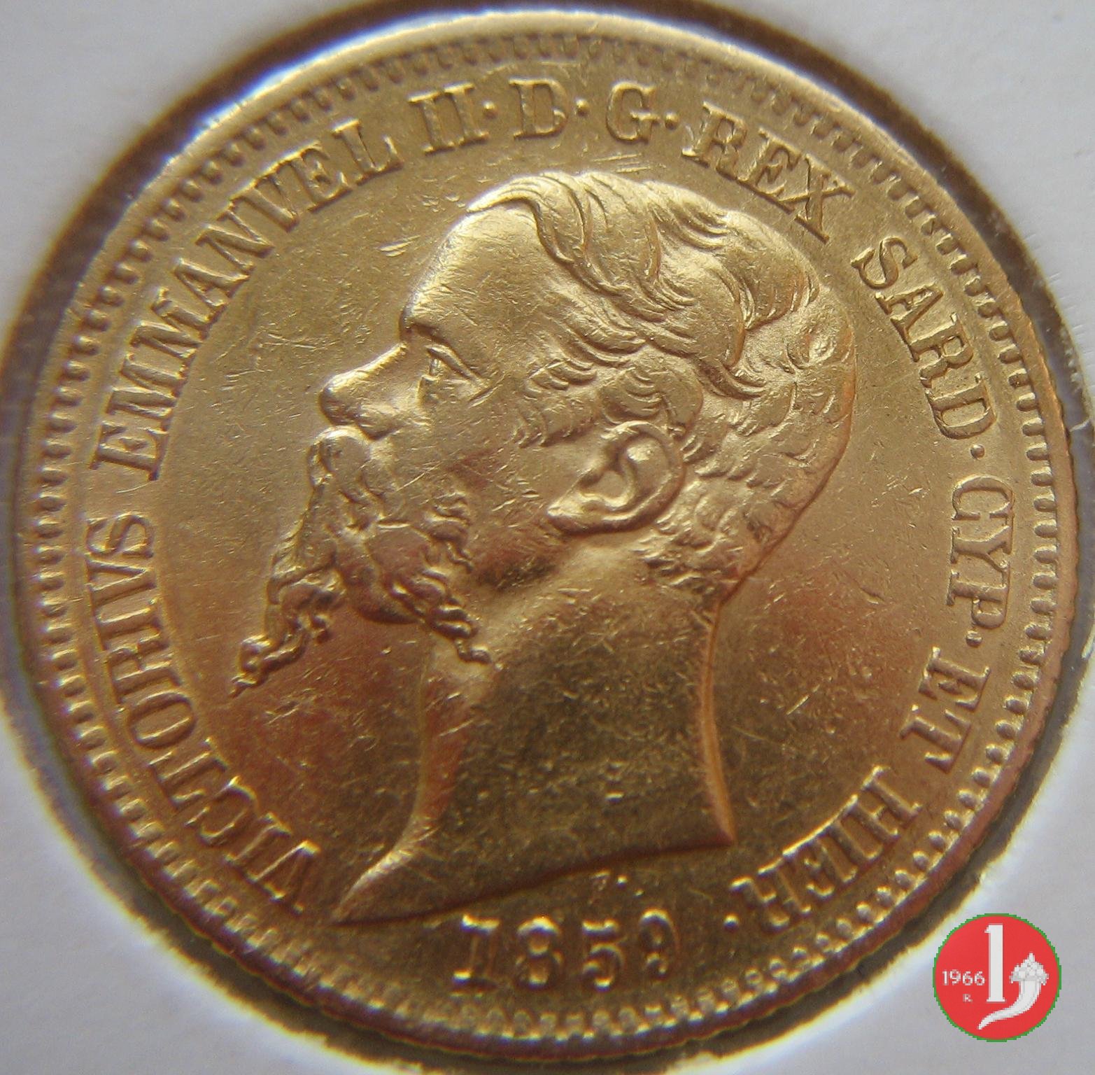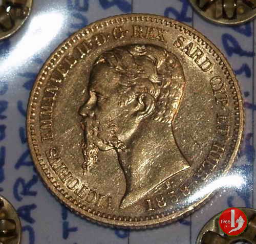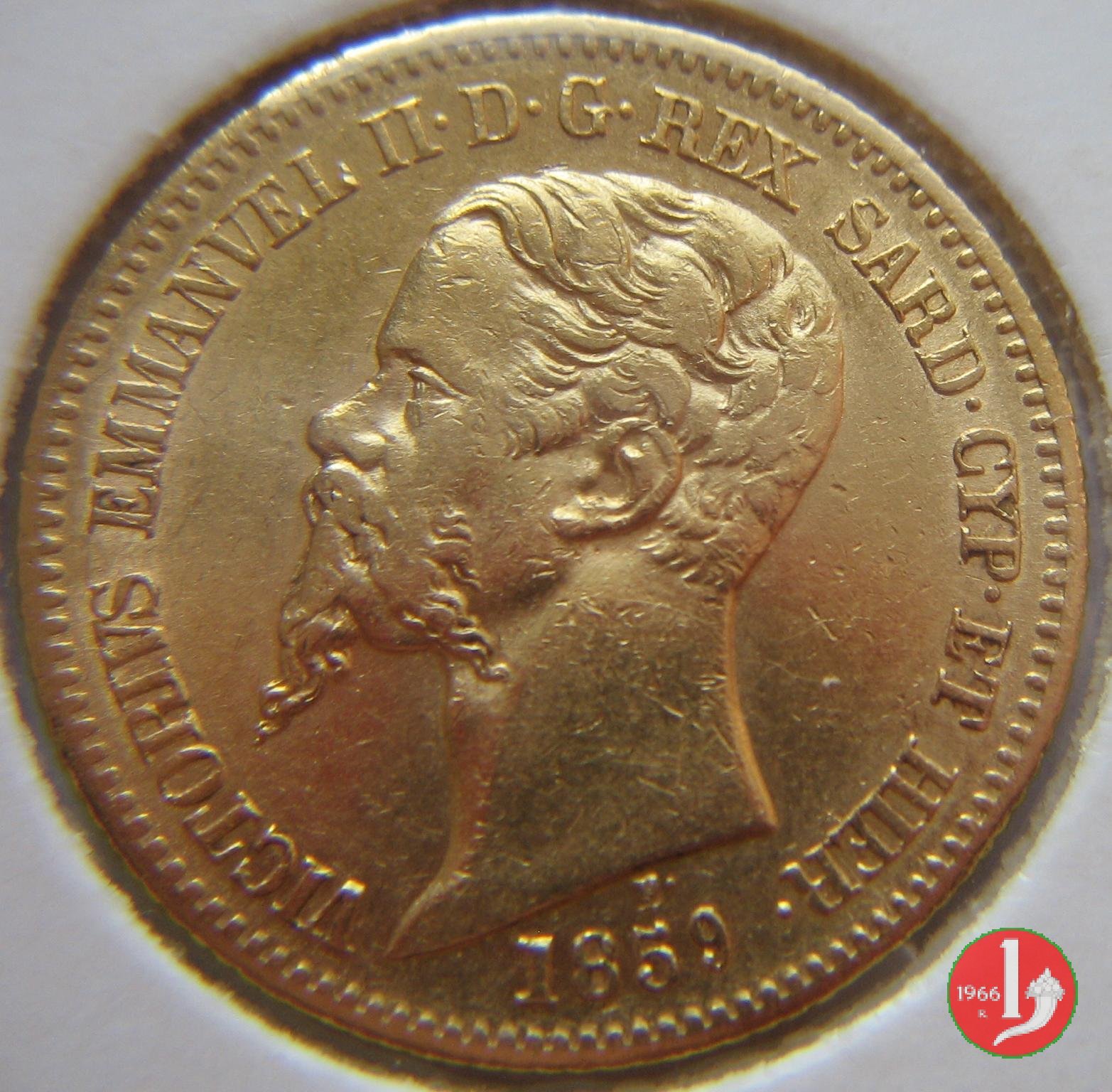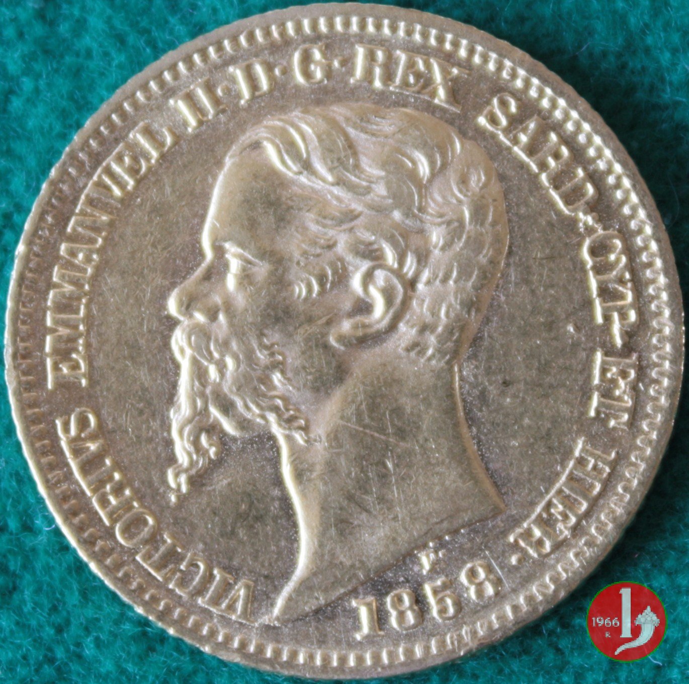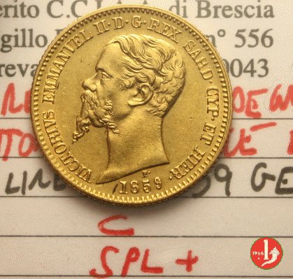 dal successivo Marengo del Regno d'Italia. Segno di zecca per Genova, P in incuso all'interno di uno scudetto e ancora. Segno di zecca per Torino, B in incuso all'interno di uno scudetto (iniziale di Tommaso Battilana direttore della zecca di Torino) e testa d'aquila. Segno di zecca per Milano, M •. Il Pagani segnala anche esemplari con millesimi 1853 e 1854 (quest'ultimo teoricamente coniato in 45.670 esemplari) per Torino, tuttavia non risultano apparsi sul mercato.1 | |||||||||||||