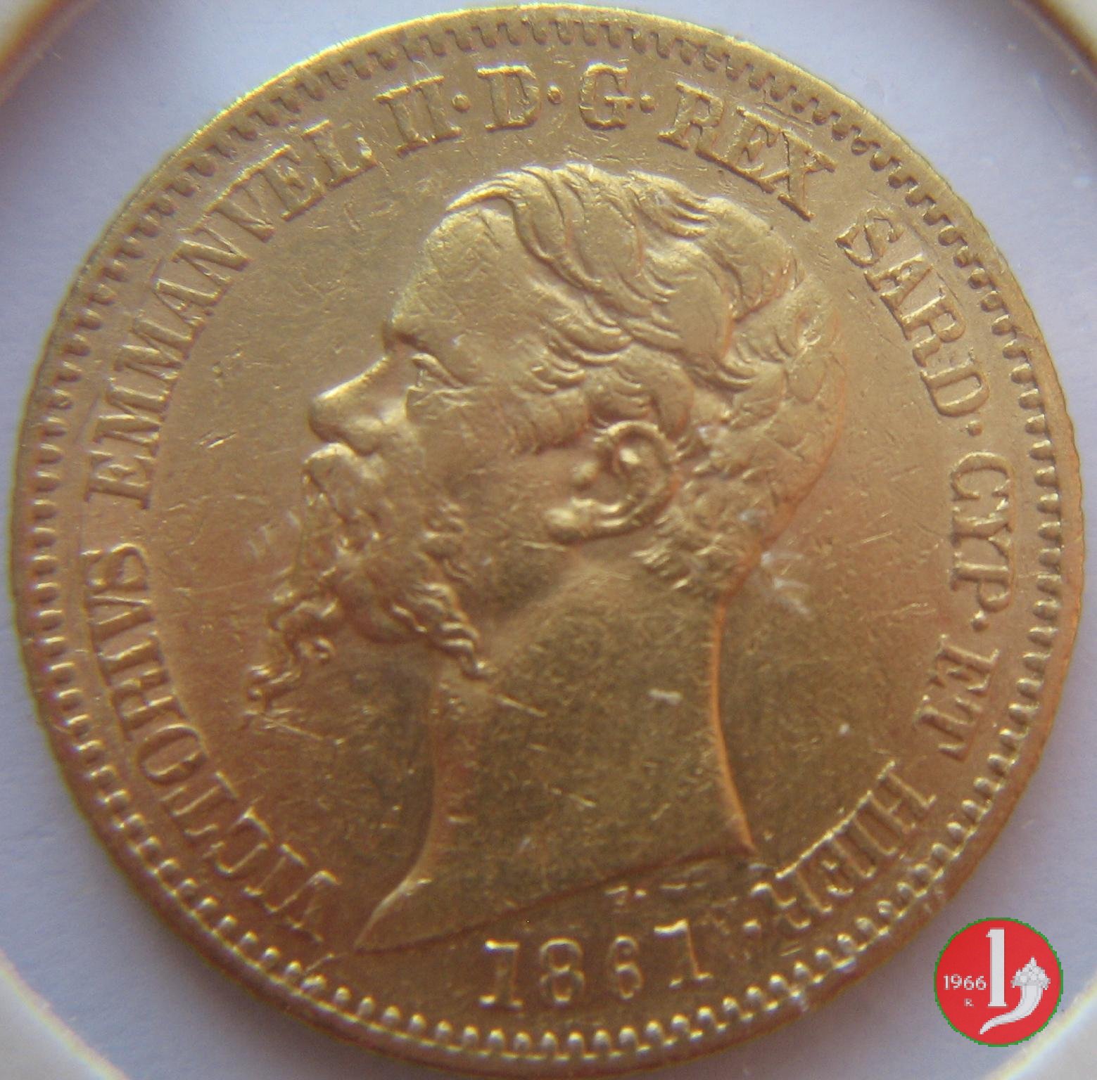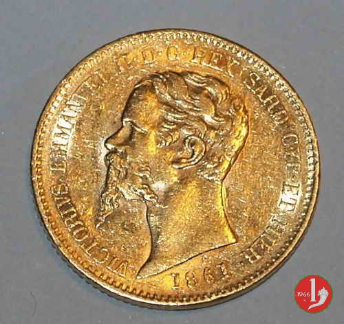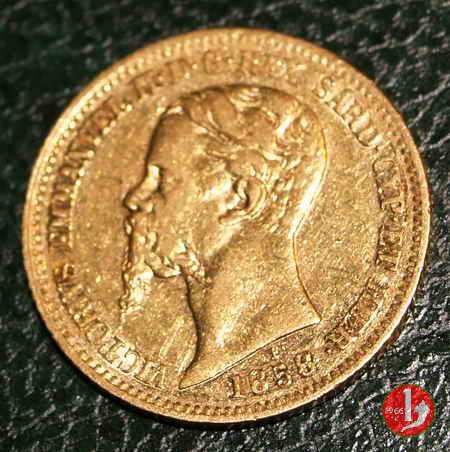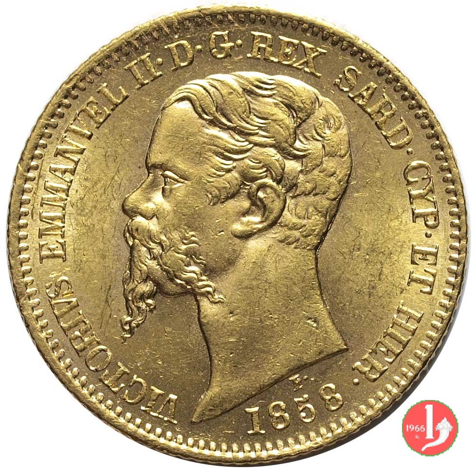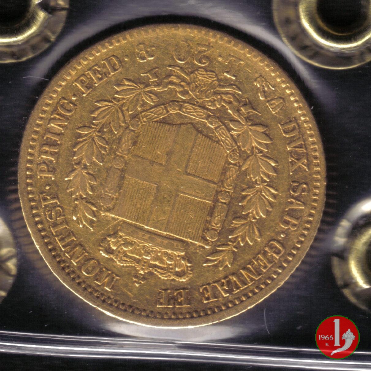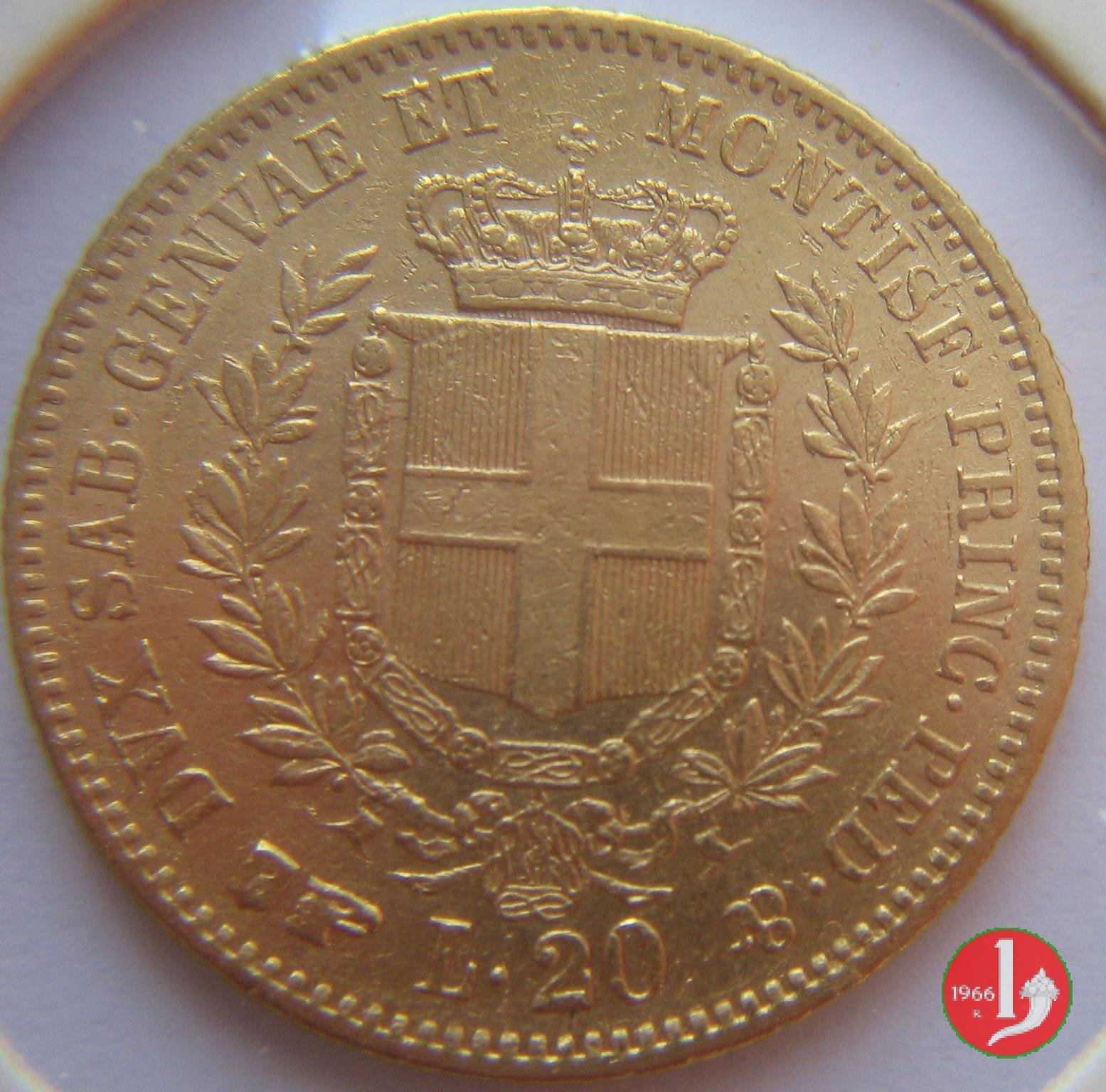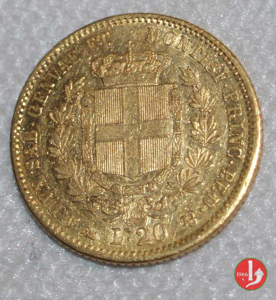 dal successivo Marengo del Regno d'Italia. Segno di zecca per Genova, P in incuso all'interno di uno scudetto e ancora. Segno di zecca per Torino, B in incuso all'interno di uno scudetto (iniziale di Tommaso Battilana direttore della zecca di Torino) e testa d'aquila. Segno di zecca per Milano, M •. Il Pagani segnala anche esemplari con millesimi 1853 e 1854 (quest'ultimo teoricamente coniato in 45.670 esemplari) per Torino, tuttavia non risultano apparsi sul mercato.1 | |||||||||||||