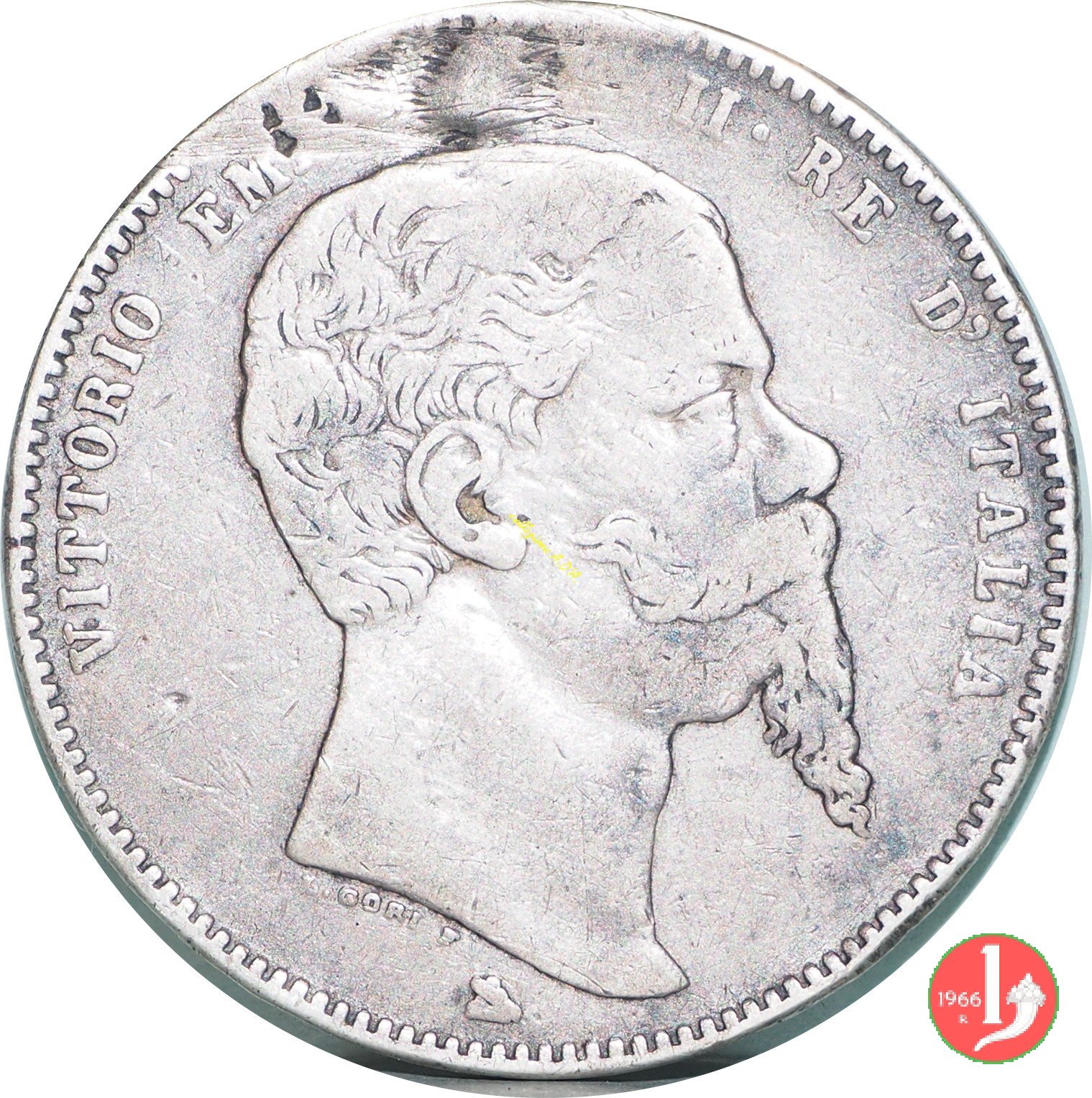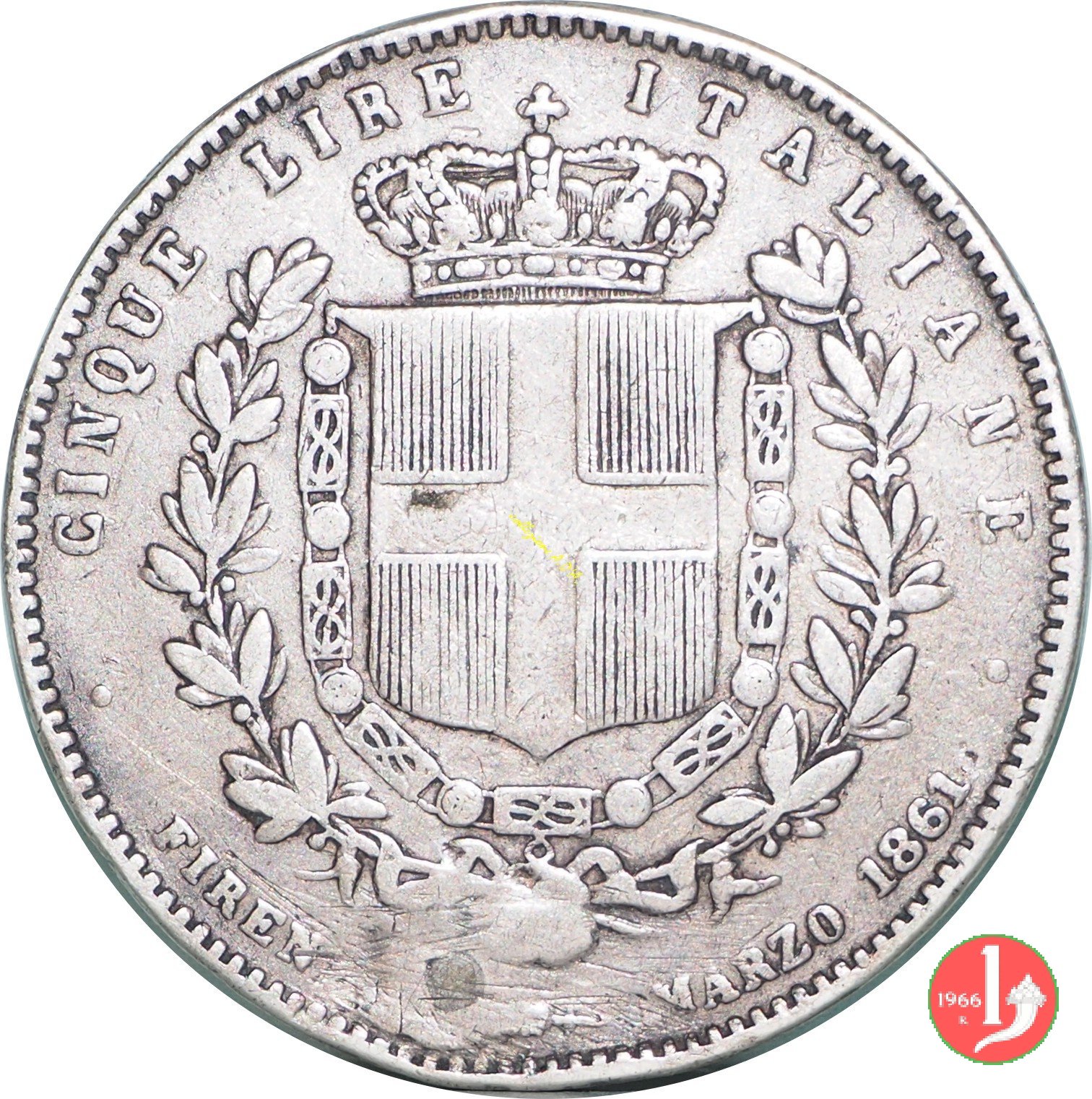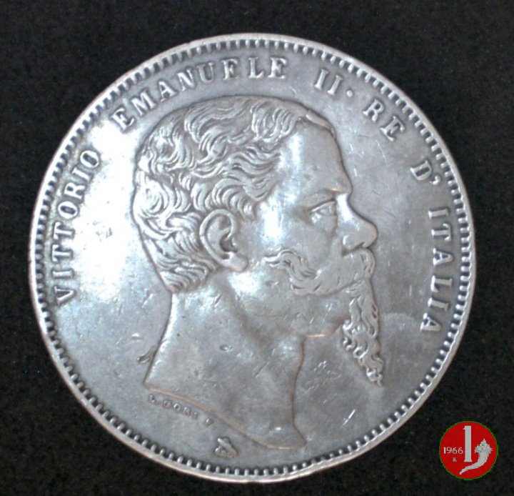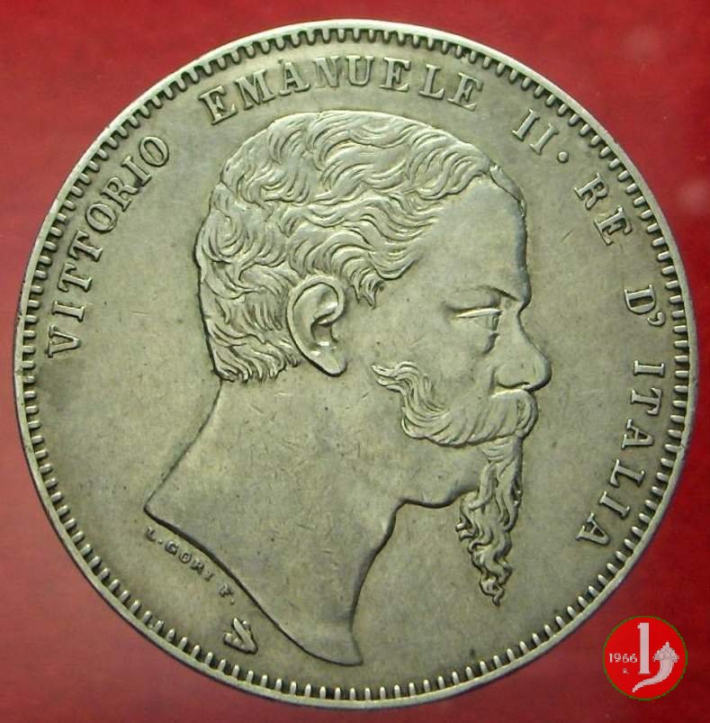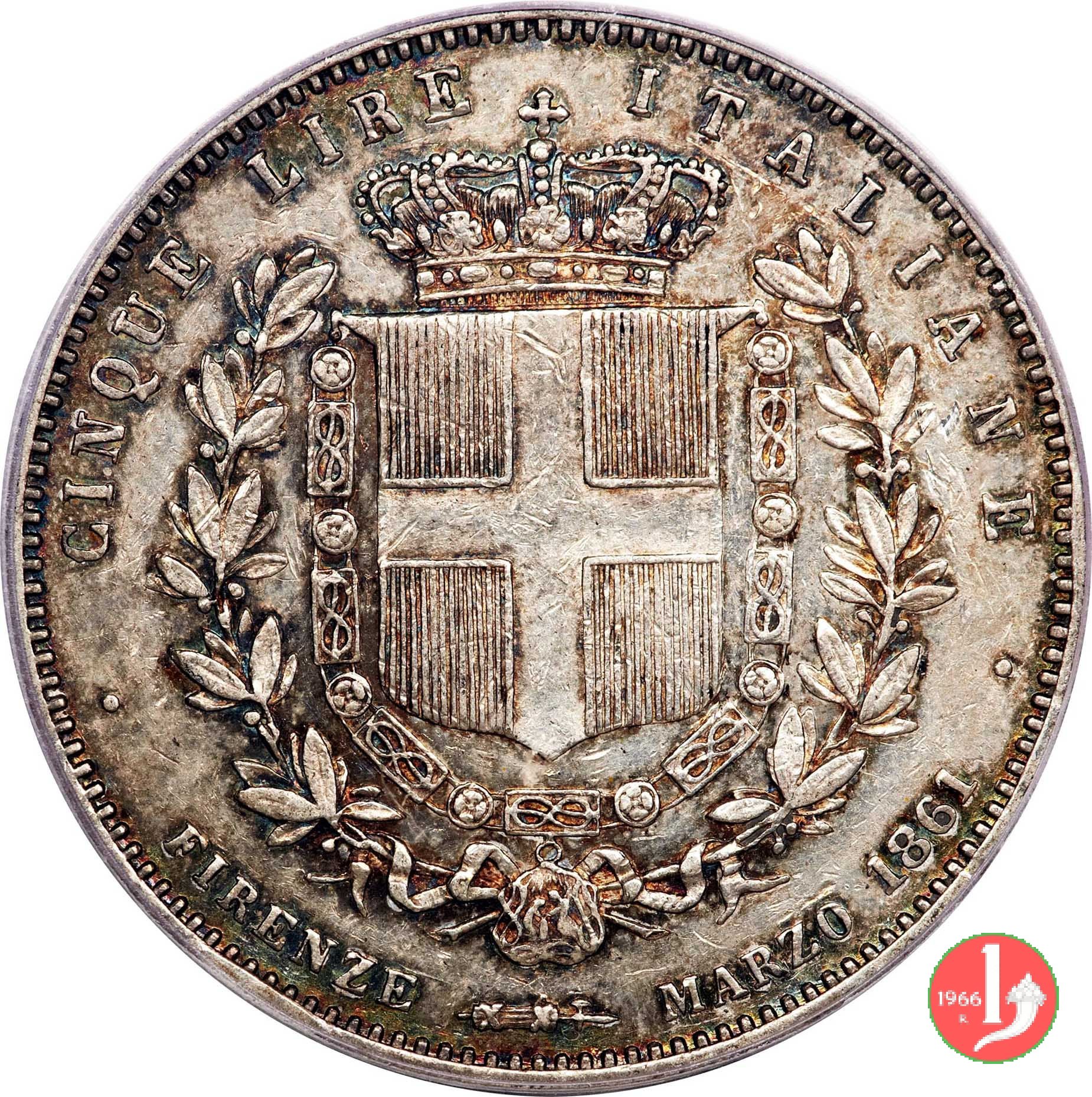 Stemma crociato sabaudo sormontato da corona Reale e circondato dal collare dell'Annunziata tra un ramo di alloro e uno di quercia. Intorno nella parte superiore CINQUE LIRE ITALIANE, nella parte inferiore in senso antiorario FIRENZE, un fascio orizzontale e MARZO 1861. Testa del Re volta a destra, intorno nella parte superiore VITTORIO EMANUELE II • RE D'ITALIA. Sotto il collo il nome dell'autore (L • GORI F •), nel basso punzone del direttore della zecca fiorentina fatto a monte.