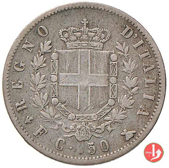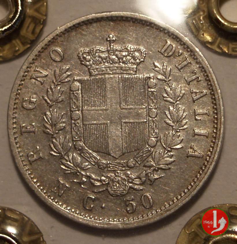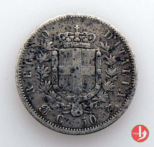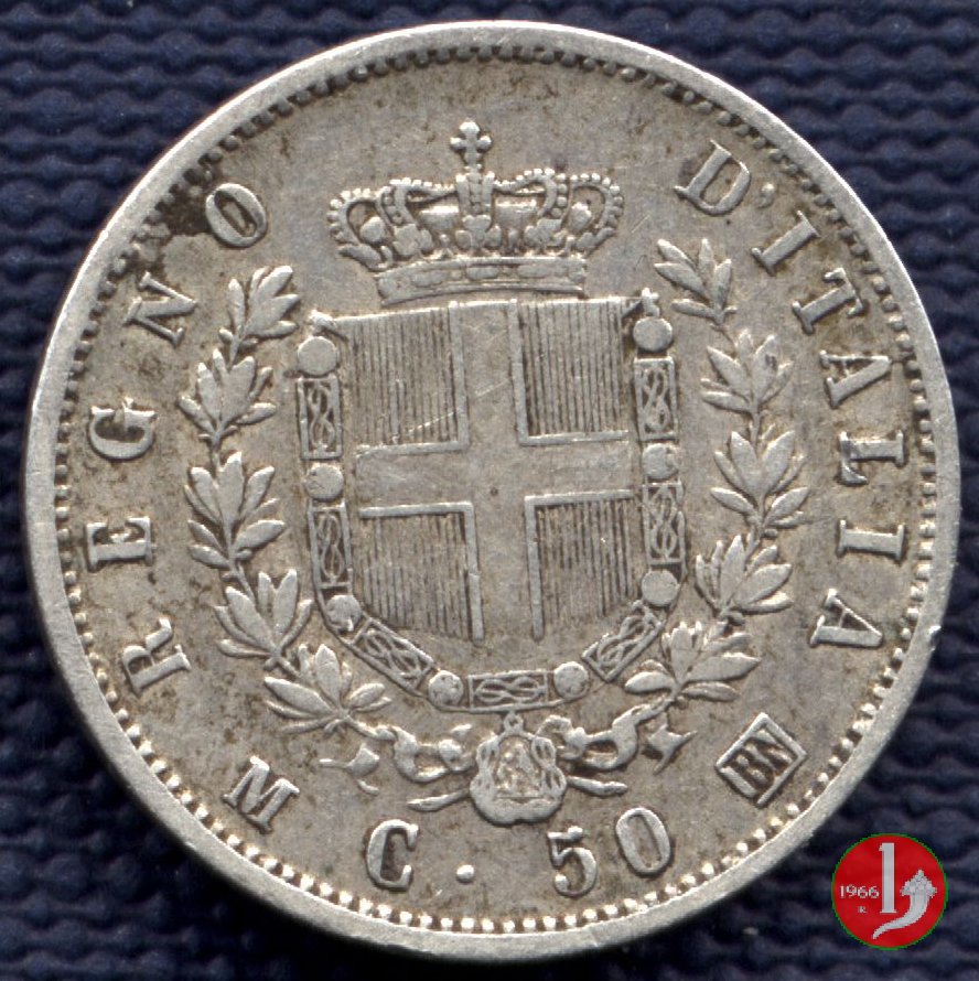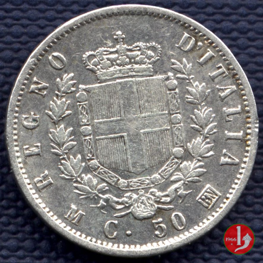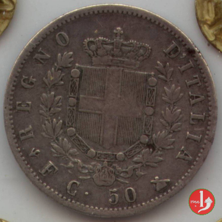 Testa del Re a destra, attorno VITTORIO EMANUELE II e il millesimo; nome dell'autore sotto il collo: FERRARIS • Stemma del casato Savoia tra rami di alloro, intorno: REGNO D'ITALIA, in basso il valore (C. 50) e il segno di zecca.
