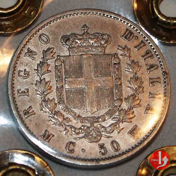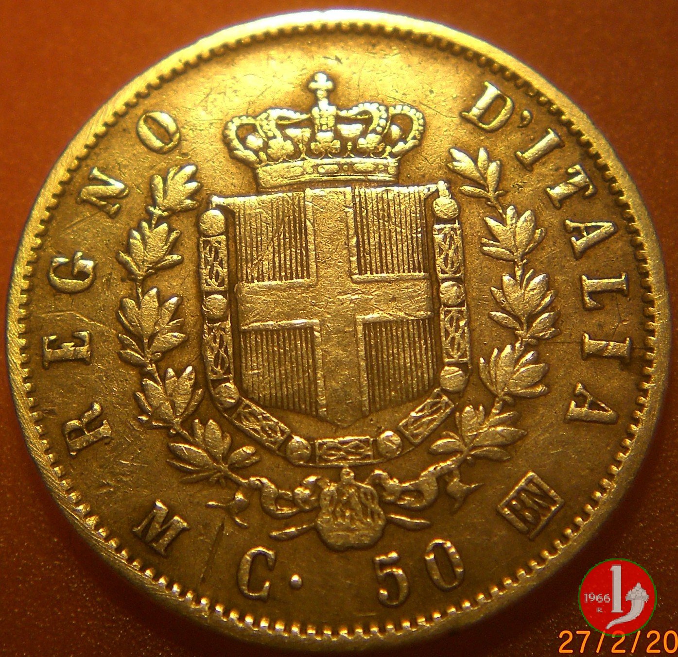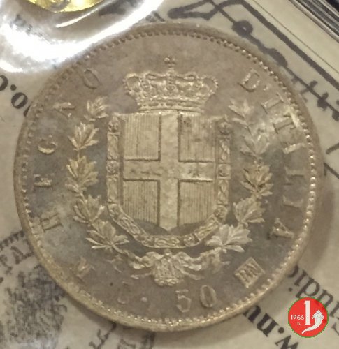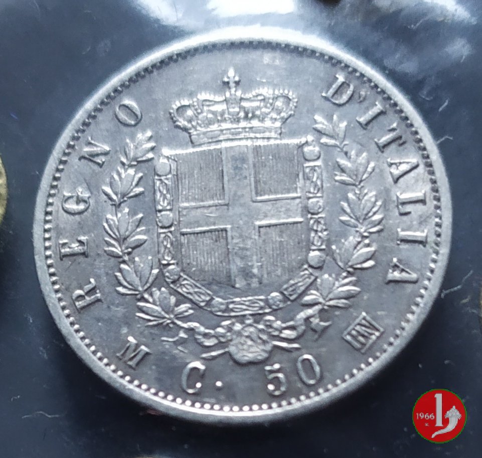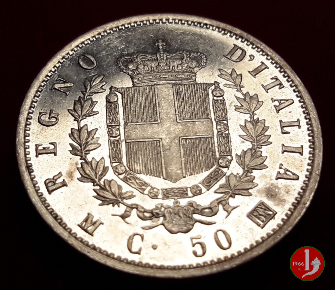 Testa del Re a destra, attorno VITTORIO EMANUELE II e il millesimo; nome dell'autore sotto il collo: FERRARIS • Stemma del casato Savoia tra rami di alloro, intorno: REGNO D'ITALIA, in basso il valore (C. 50) e il segno di zecca.
