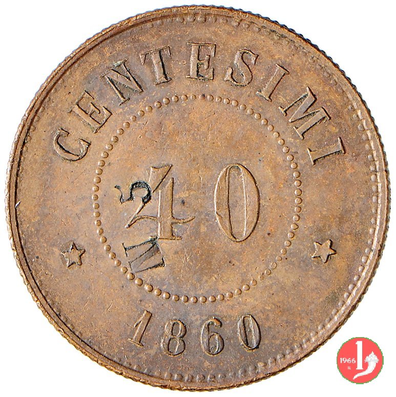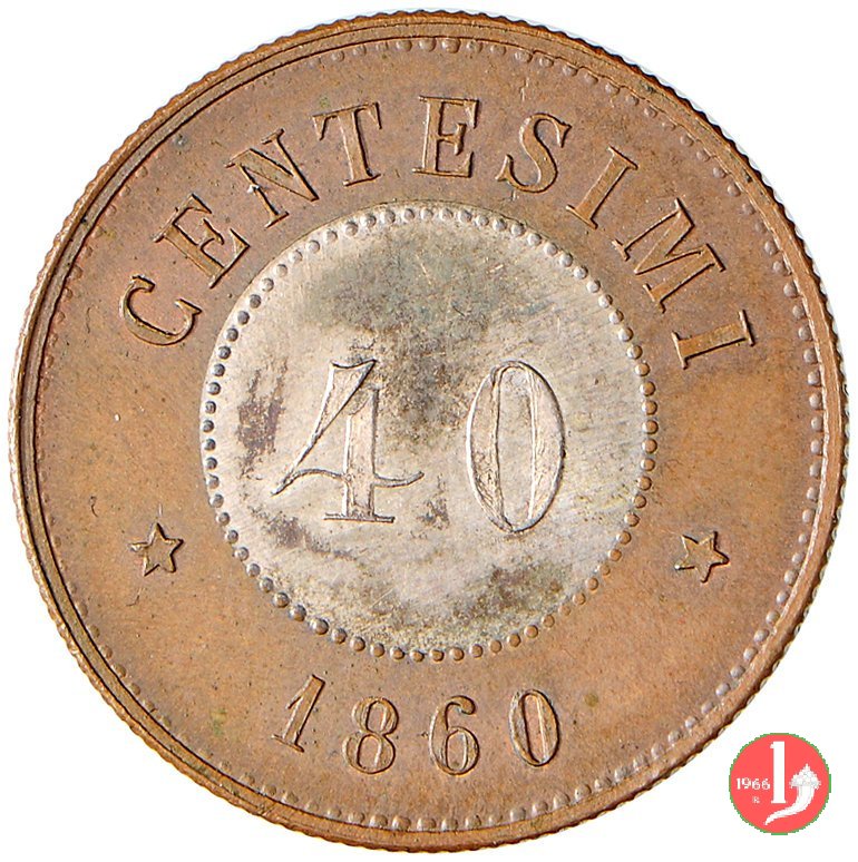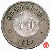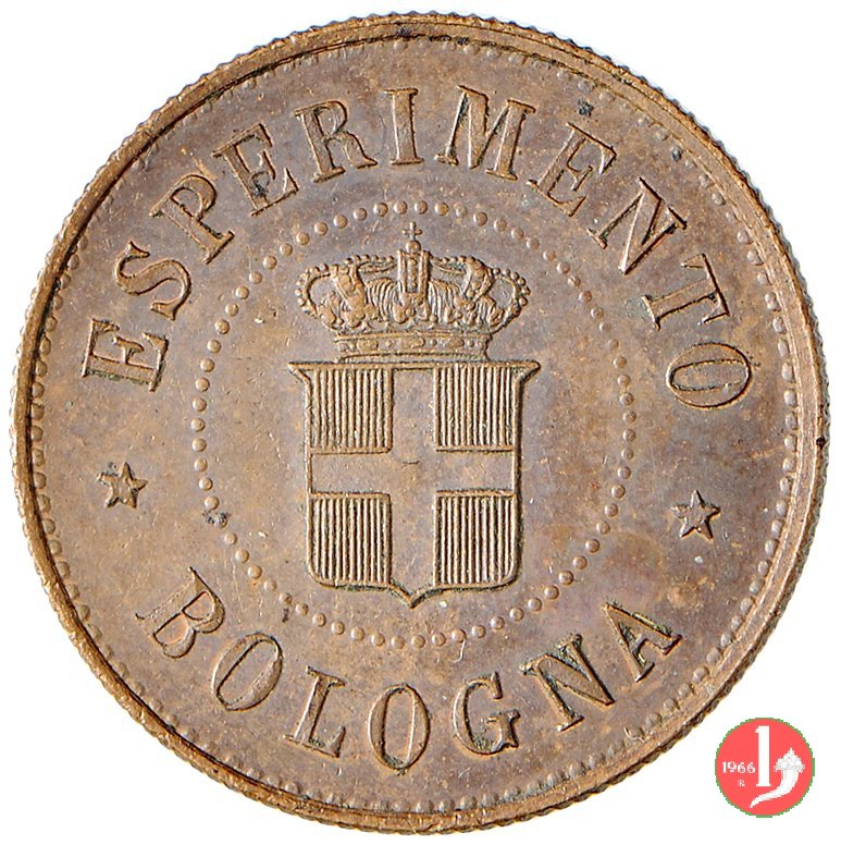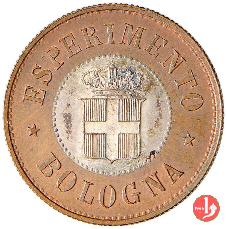 Nel campo, scudo Savoia nel tondino d'argento. Intorno nella corona di rame, * ESPERIMENTO * e sotto BOLOGNA. Nel campo, sul tondino d'argento 40. Intorno nella corona di rame, * CENTESIMI *. In basso 1860.
