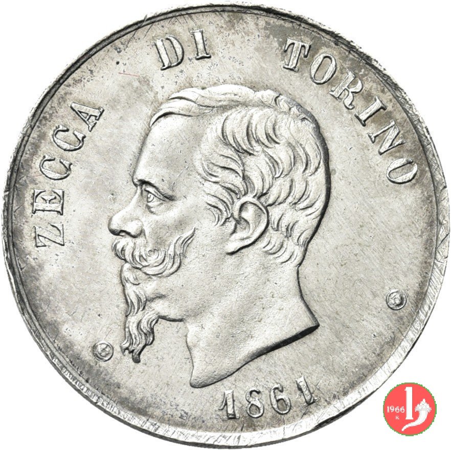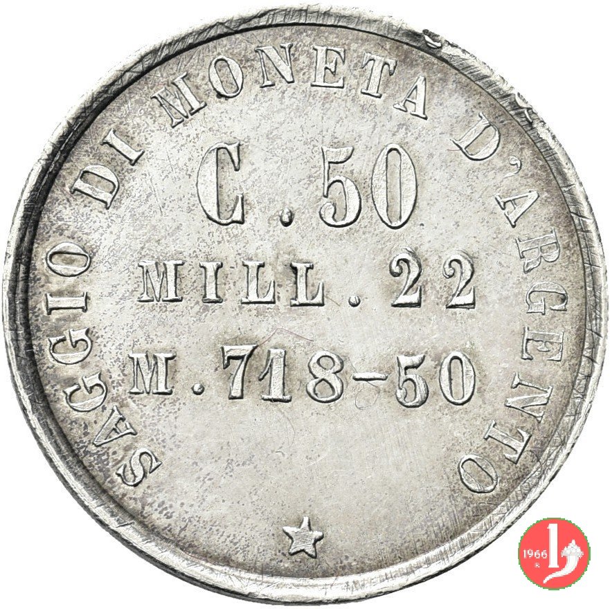 Testa di Vittorio Emanuele I volta a sinistra. Intorno * ZECCA DI TORINO *. In basso 1861. Su tre righe: C • 50 | MILL • 22 | M • 718-50. Intorno, SAGGIO DI MONETA D'ARGENTO. Sotto stella a cinque punte.