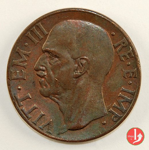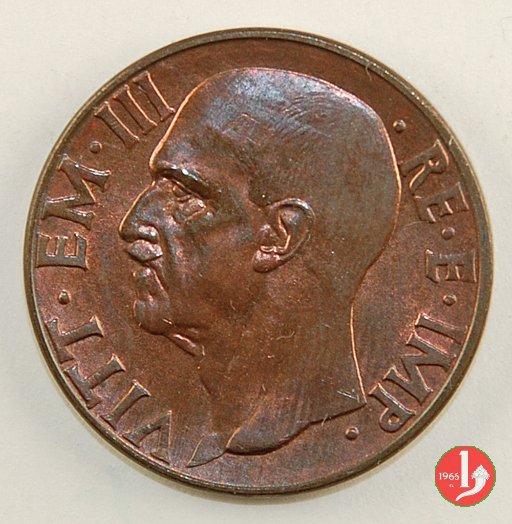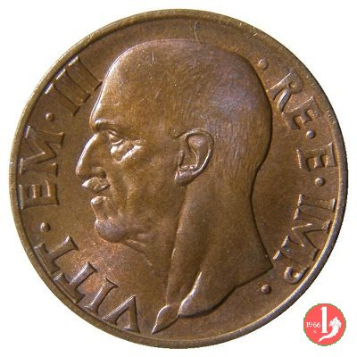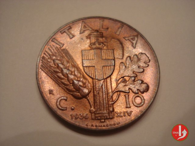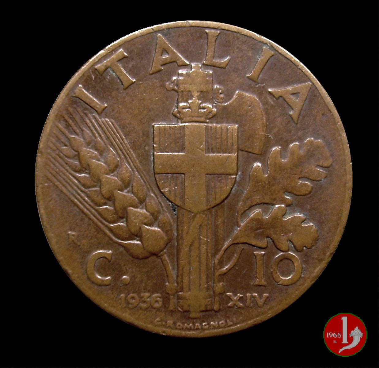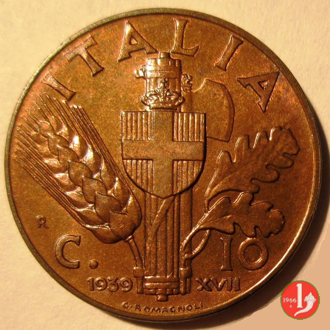 Stemma sabaudo con corona reale sovrapposto ad un fascio. A destra una foglia di quercia a sinistra una spiga di grano. Ai lati della base del fascio millesimo e anno dell'Era Fascista; sopra l'indicazione del valore (C. 10). In alto lungo il bordo la scritta ITALIA, a ore 4 l'indicazione dell'autore (G. ROMAGNOLI) e a ore 8 il segno di zecca (R). Volto del Re a sinistra, intorno la scritta VITT. EM. III. RE. E. IMP.