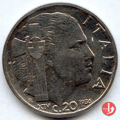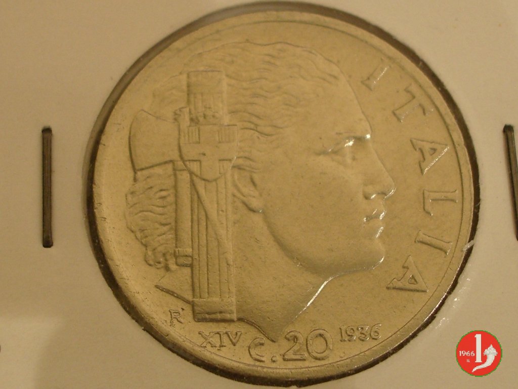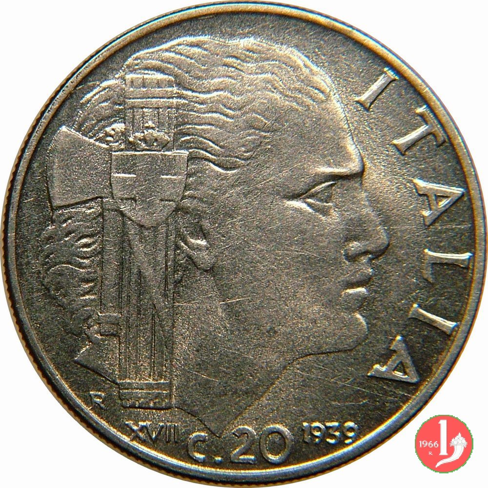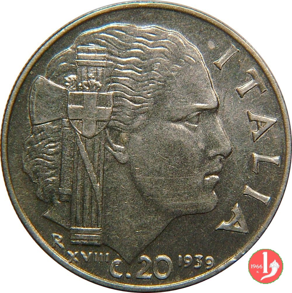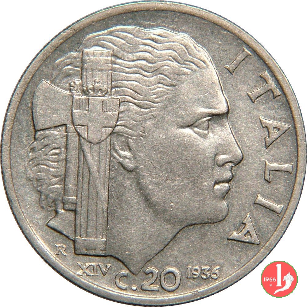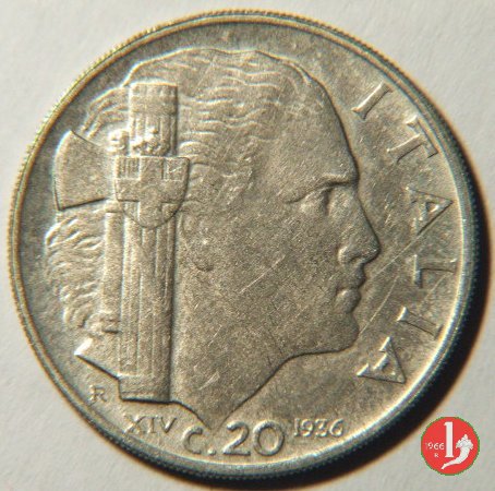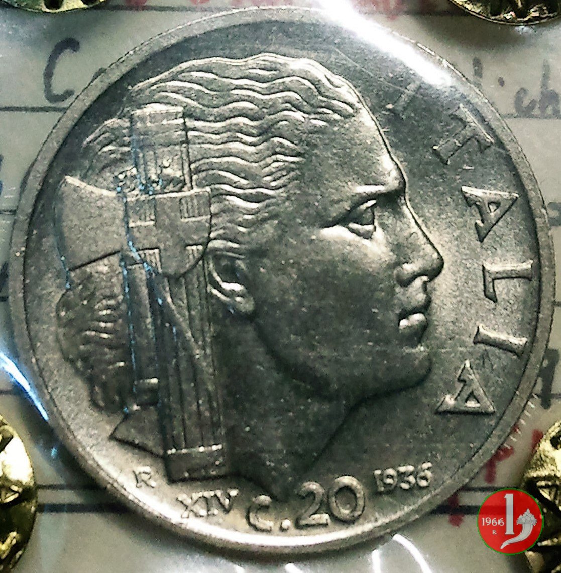 Testa nuda di donna (allegoria dell'Italia) che guarda verso destra dietro ad un fascio adornato dallo scudo Sabaudo. Lungo il bordo a destra ITALIA, alla base del collo dell'Italia a sinistra rispetto la base del fascio il segno di zecca (R). In esergo indicazione del valore (C. 20) tra millesimo a destra e anno dell'Era Fascista a sinistra. Testa del Re a sinistra, intorno: VITT • EM • III • RE • E • IMP •, in basso lungo il bordo: G. ROMAGNOLI.
