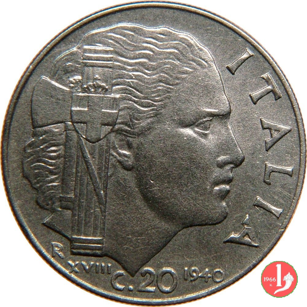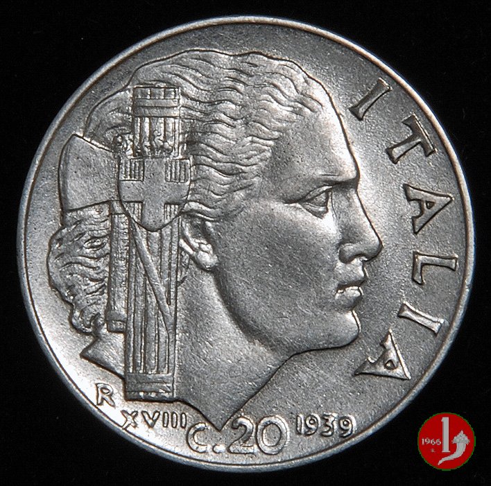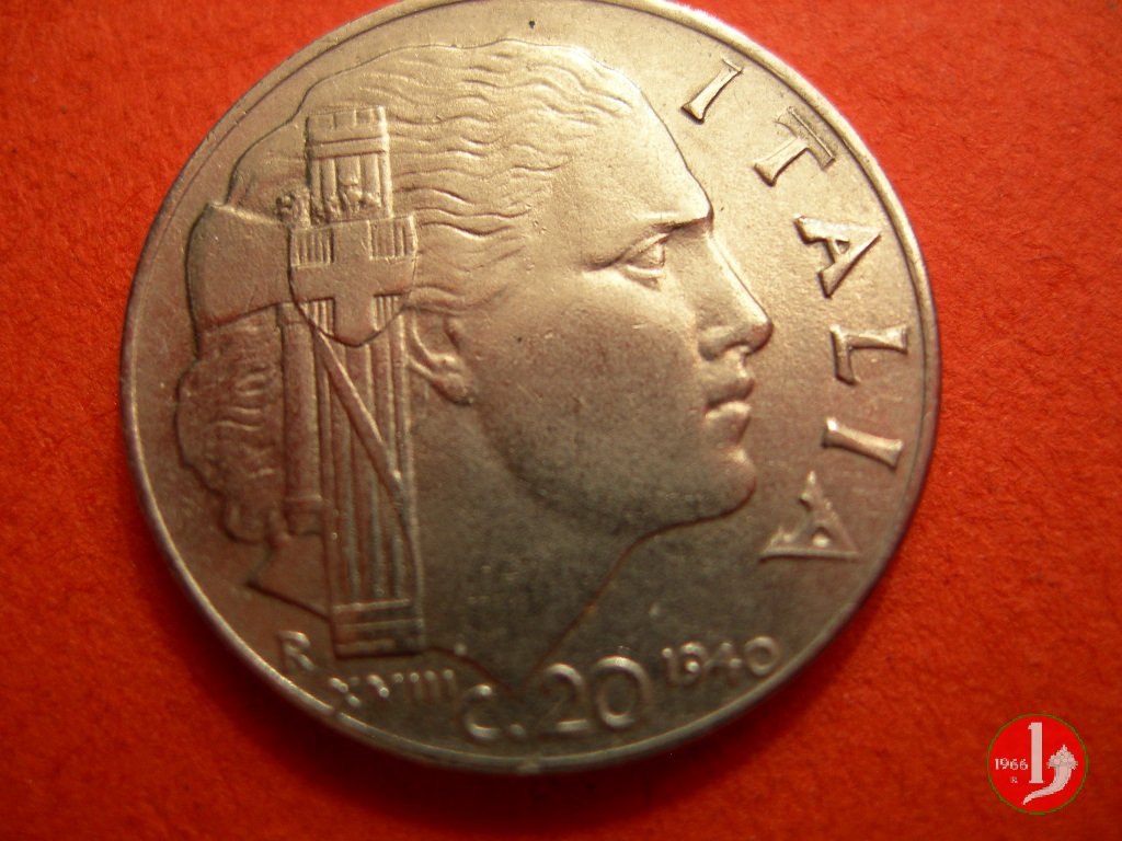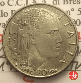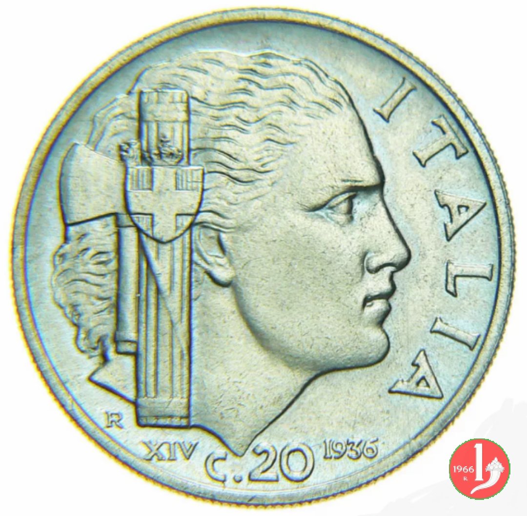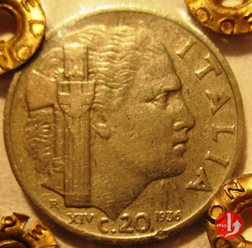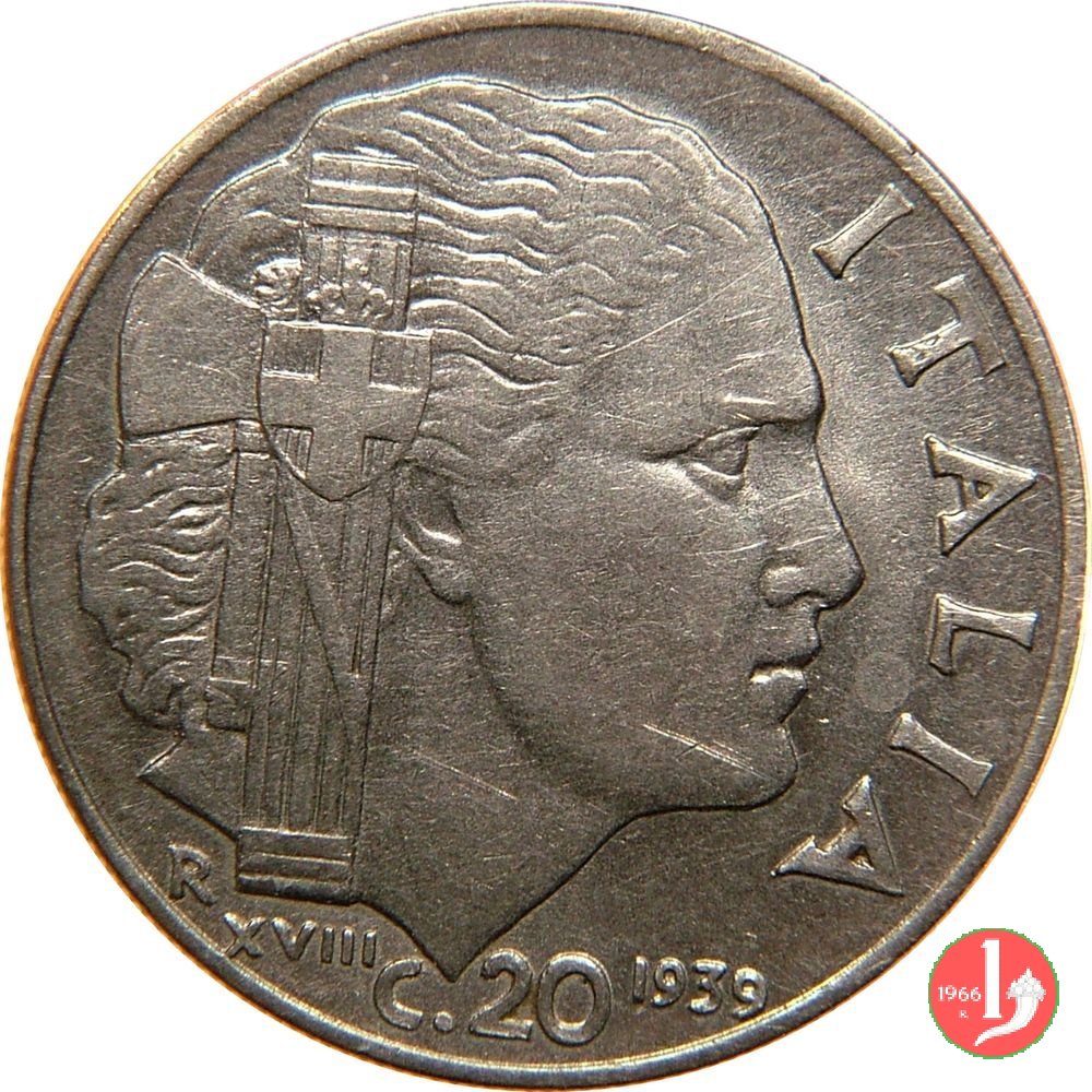 Testa nuda di donna (allegoria dell'Italia) che guarda verso destra dietro ad un fascio adornato dallo scudo Sabaudo. Lungo il bordo a destra ITALIA, alla base del collo dell'Italia a sinistra rispetto la base del fascio il segno di zecca (R). In esergo indicazione del valore (C. 20) tra millesimo a destra e anno dell'Era Fascista a sinistra. Testa del Re a sinistra, intorno: VITT • EM • III • RE • E • IMP •, in basso lungo il bordo: G. ROMAGNOLI.