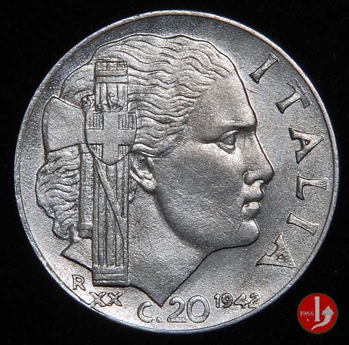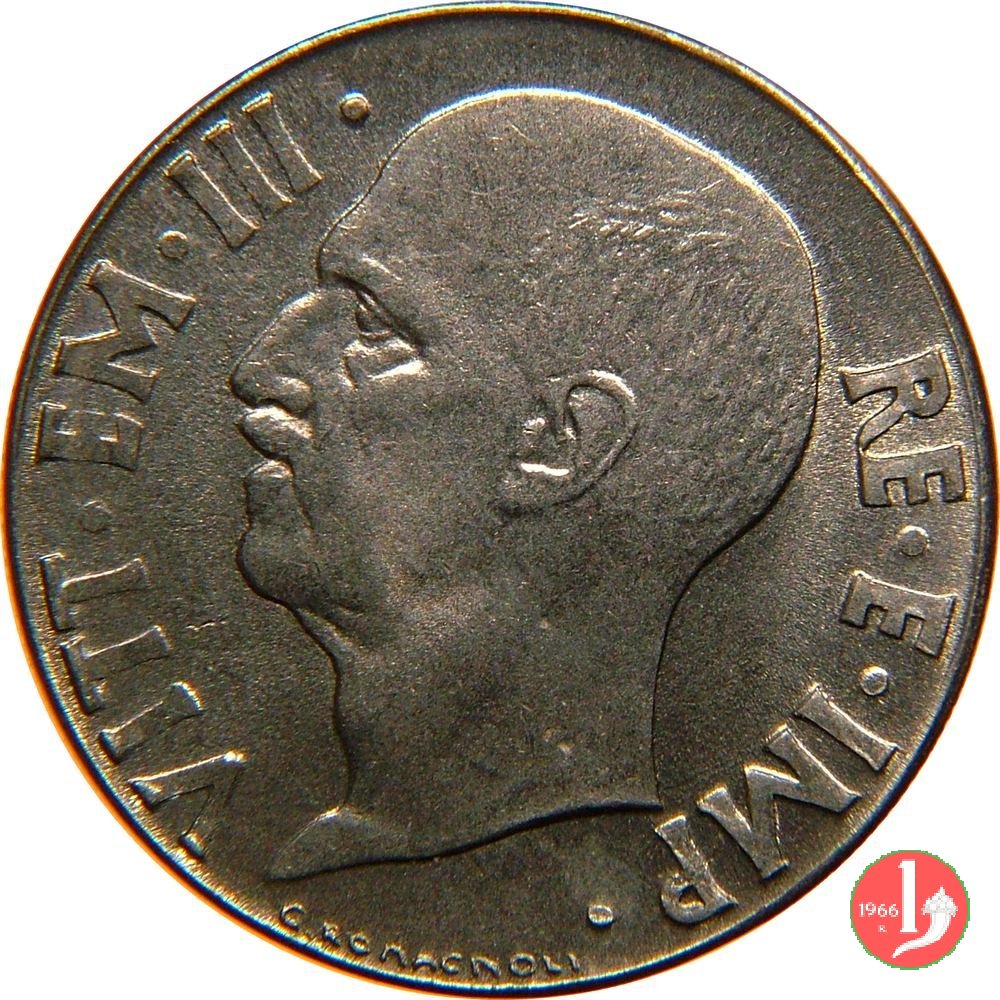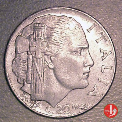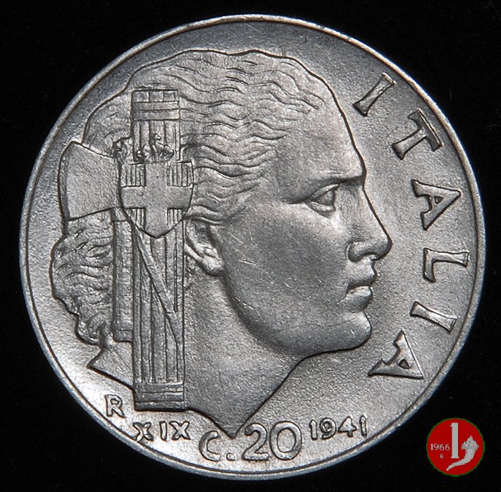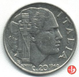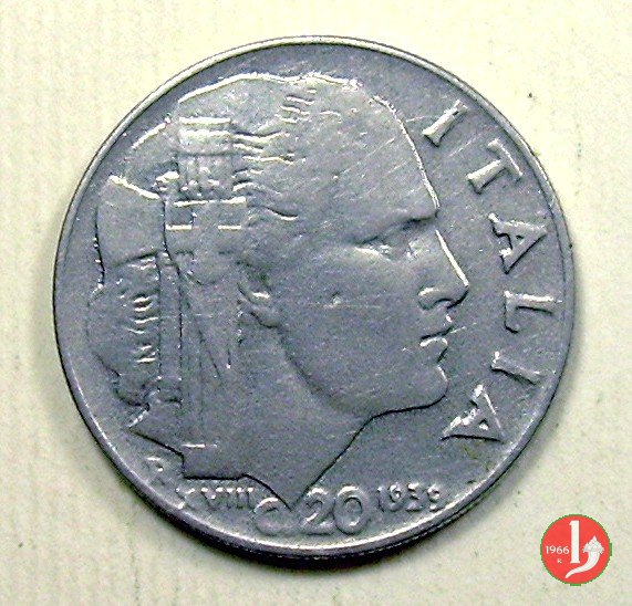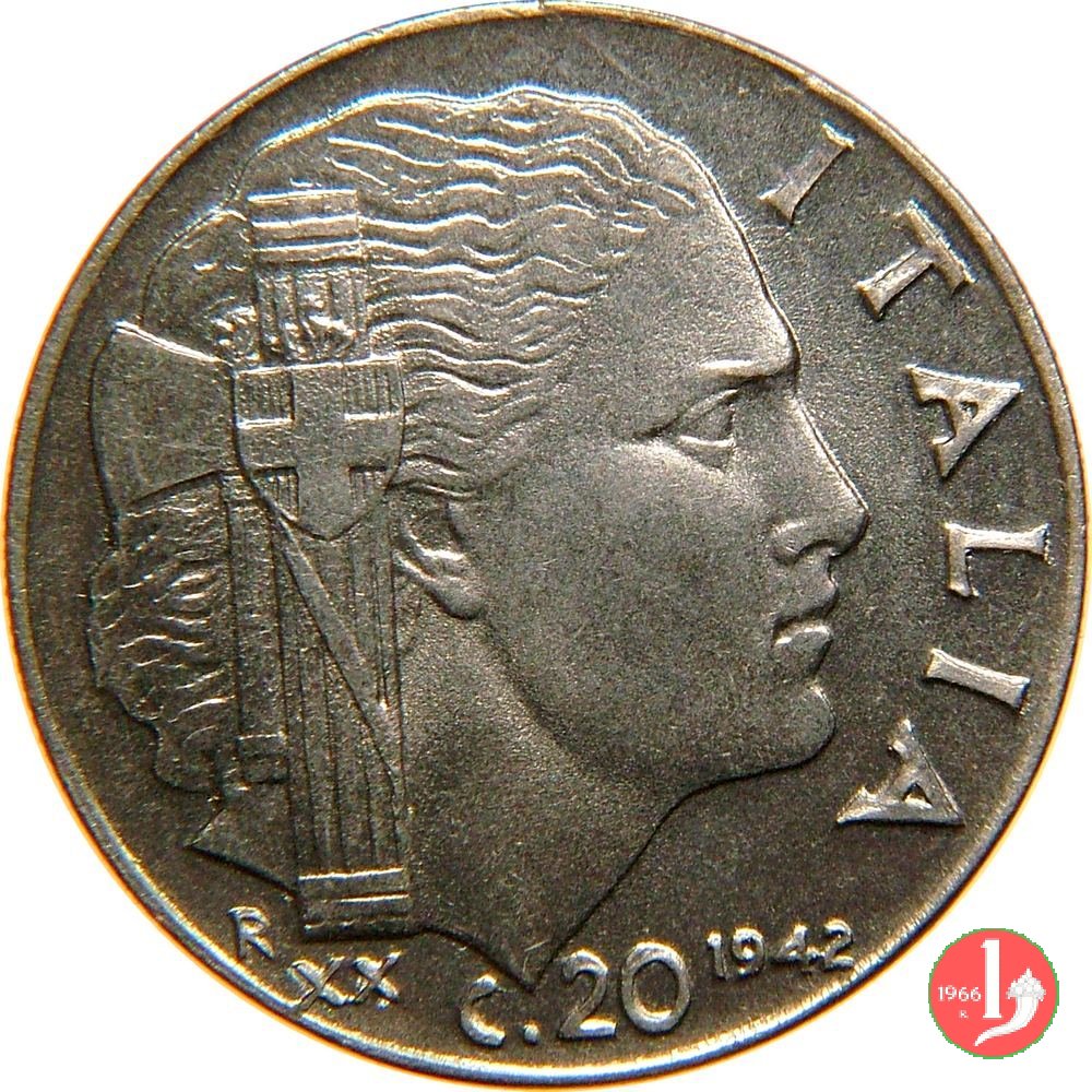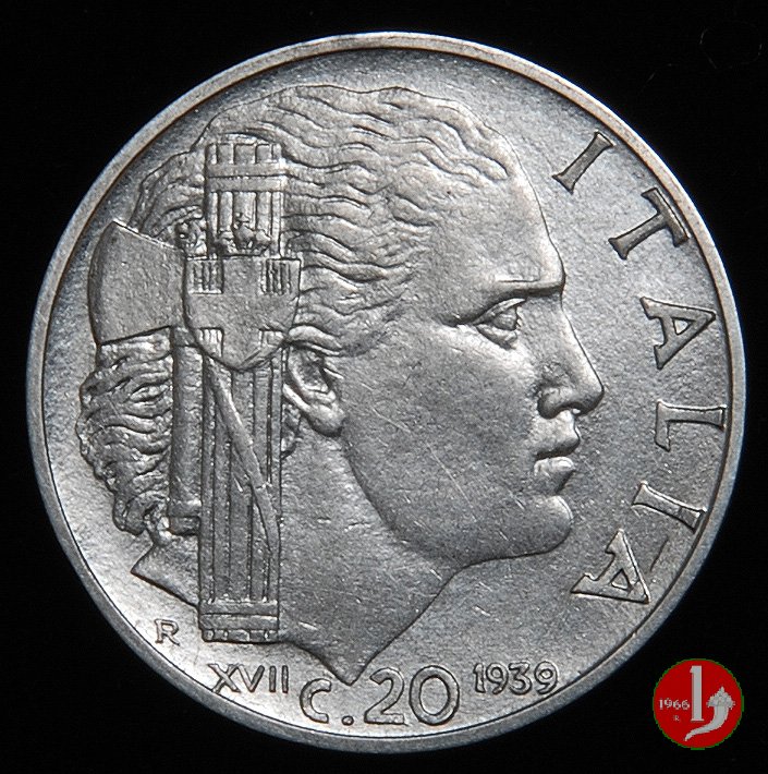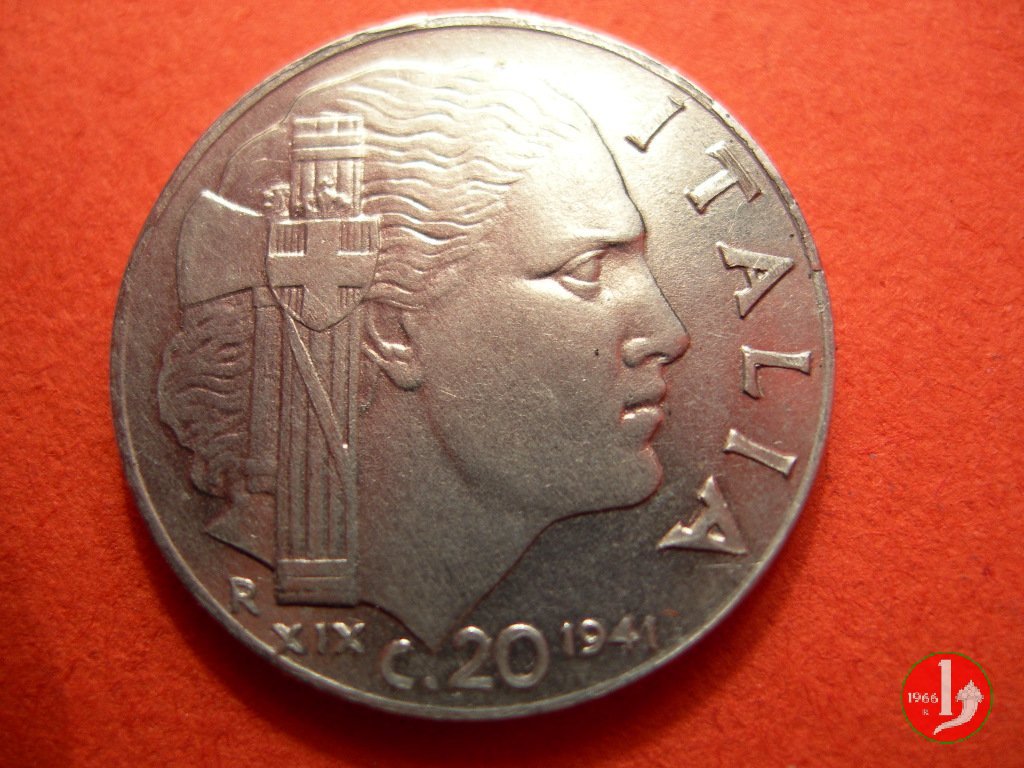 Testa nuda di donna (allegoria dell'Italia) che guarda verso destra dietro ad un fascio adornato dallo scudo Sabaudo. Lungo il bordo a destra ITALIA, alla base del collo dell'Italia a sinistra rispetto la base del fascio il segno di zecca (R). In esergo indicazione del valore (C. 20) tra millesimo a destra e anno dell'Era Fascista a sinistra. Testa del Re a sinistra, intorno: VITT • EM • III • RE • E • IMP •, in basso lungo il bordo: G. ROMAGNOLI.