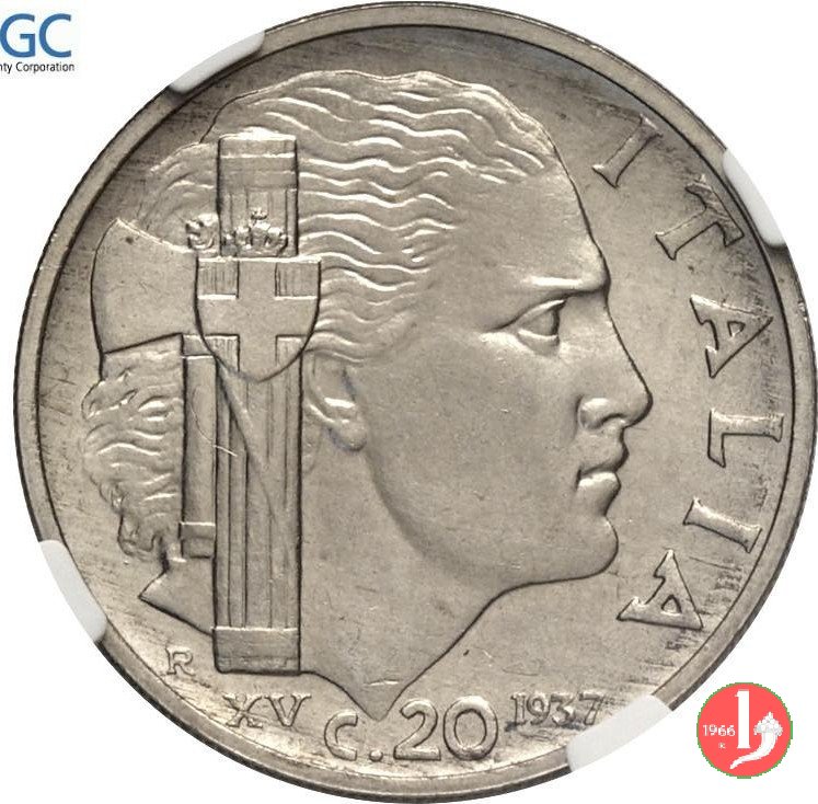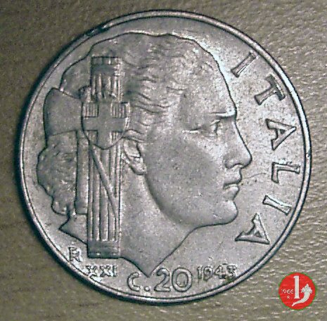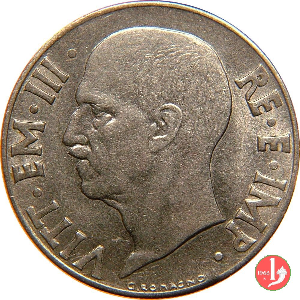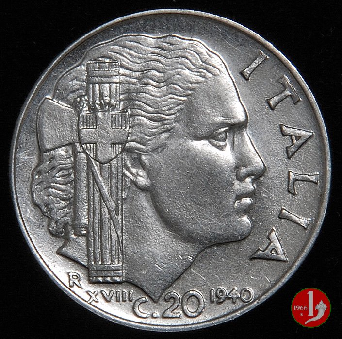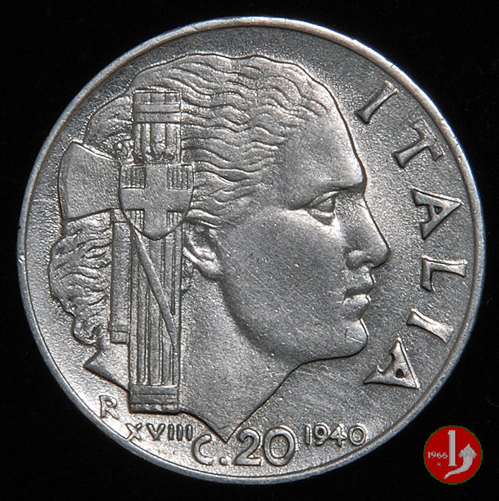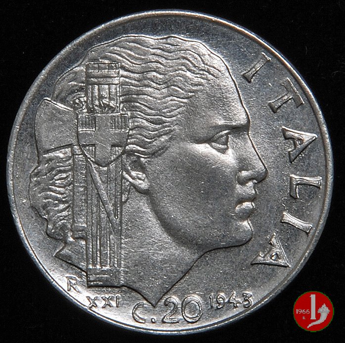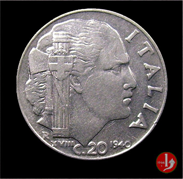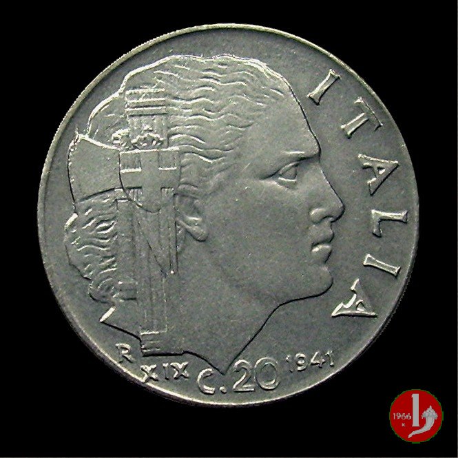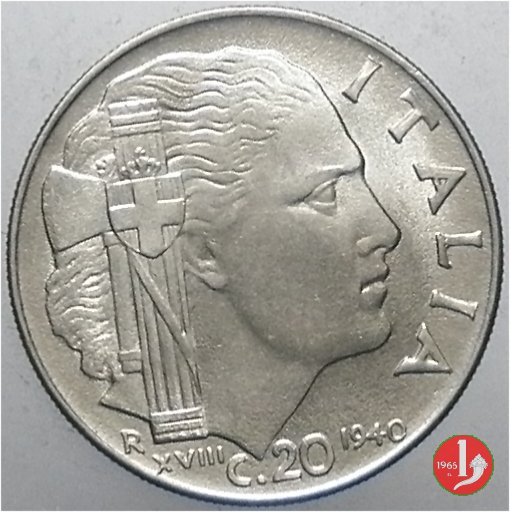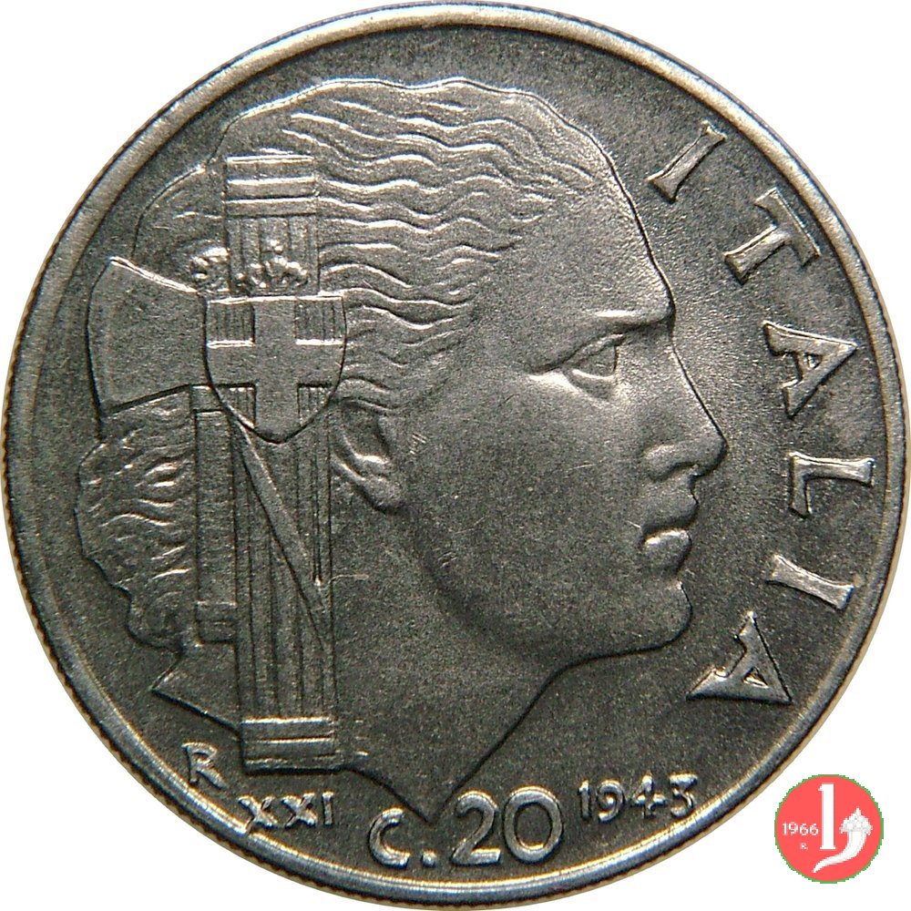 Testa nuda di donna (allegoria dell'Italia) che guarda verso destra dietro ad un fascio adornato dallo scudo Sabaudo. Lungo il bordo a destra ITALIA, alla base del collo dell'Italia a sinistra rispetto la base del fascio il segno di zecca (R). In esergo indicazione del valore (C. 20) tra millesimo a destra e anno dell'Era Fascista a sinistra. Testa del Re a sinistra, intorno: VITT • EM • III • RE • E • IMP •, in basso lungo il bordo: G. ROMAGNOLI.