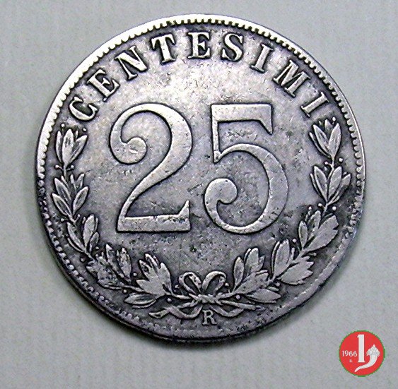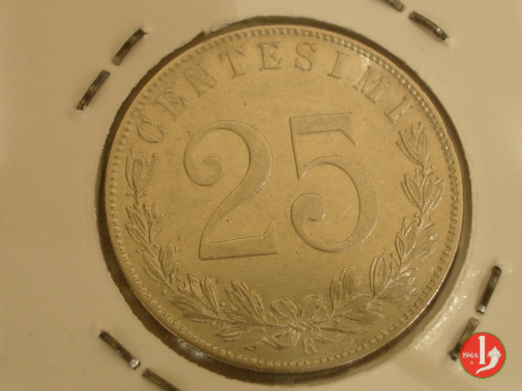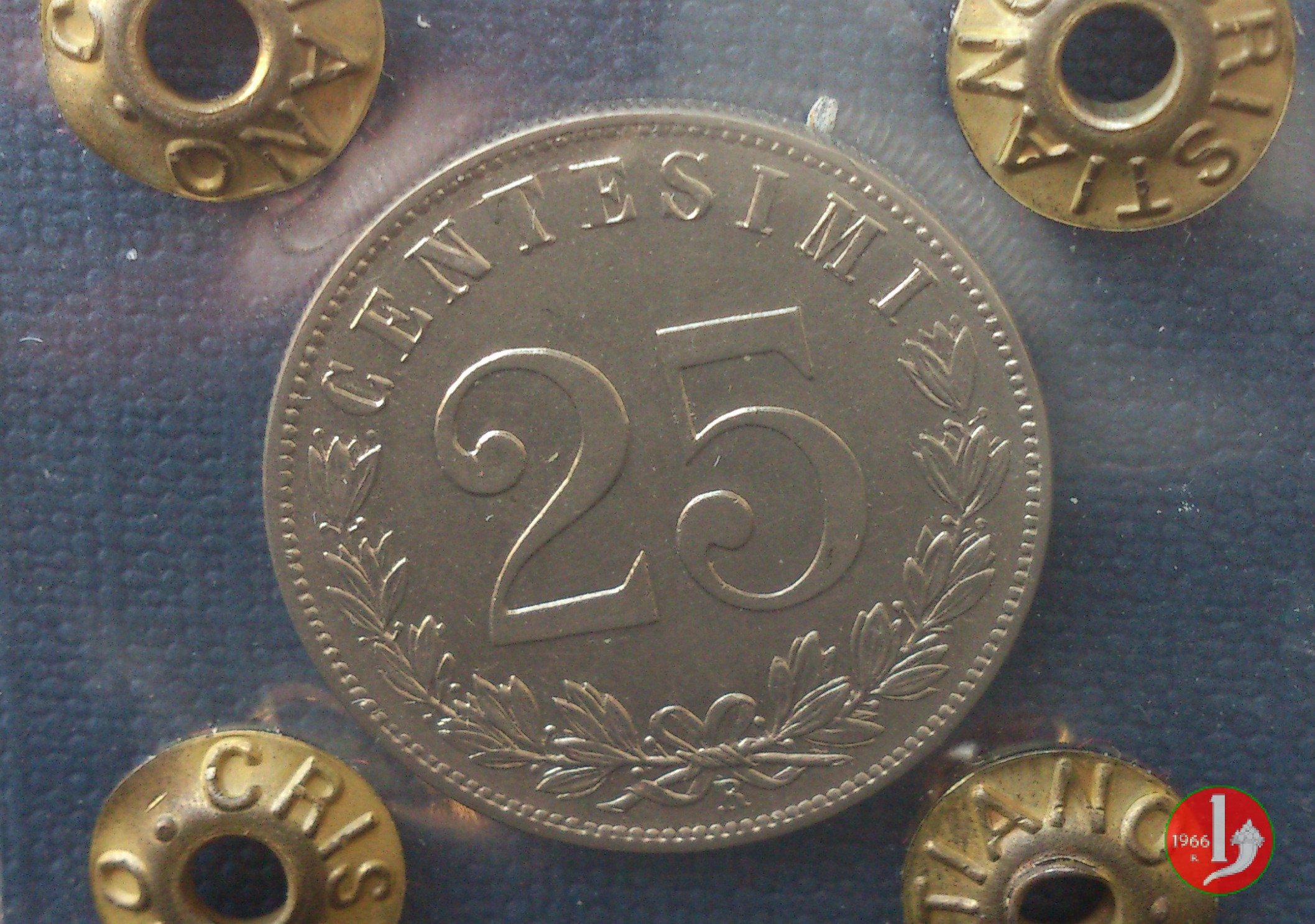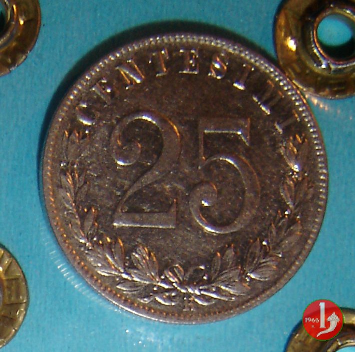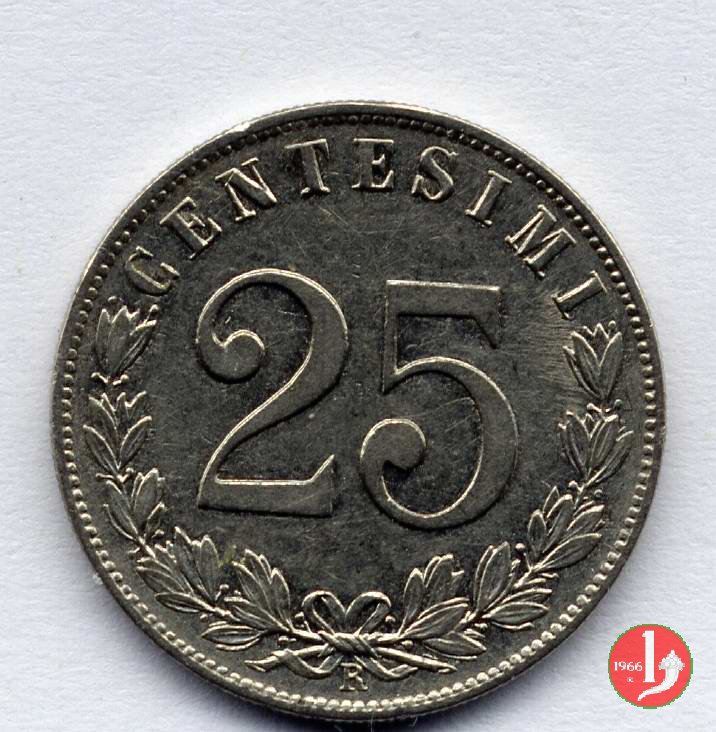 Moneta di taglio insolito, visto che era dal 1837 che non si coniavano piú monete da 25 centesimi. Date le simili dimensioni, disegno e colore si confondeva con la moneta da 1 lira oppure, qualora sottoposta a bagno di oro, con quella da 20.