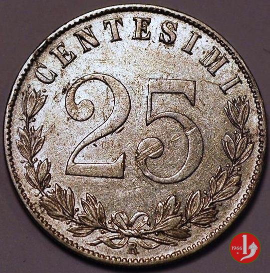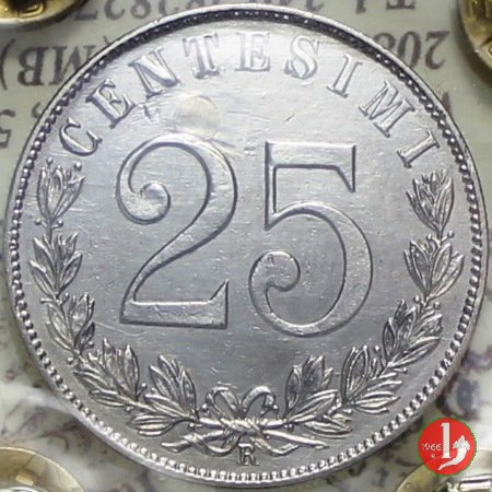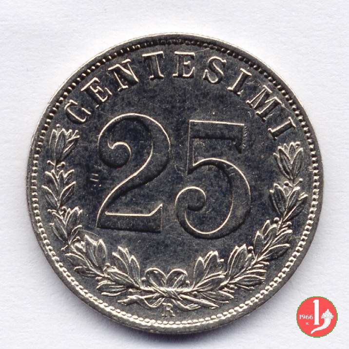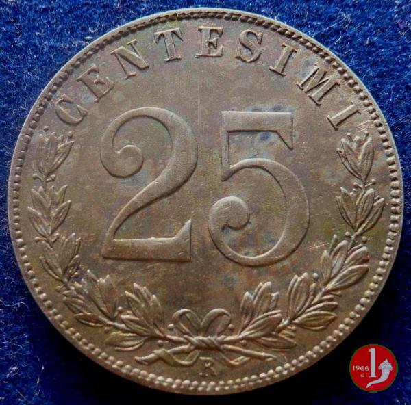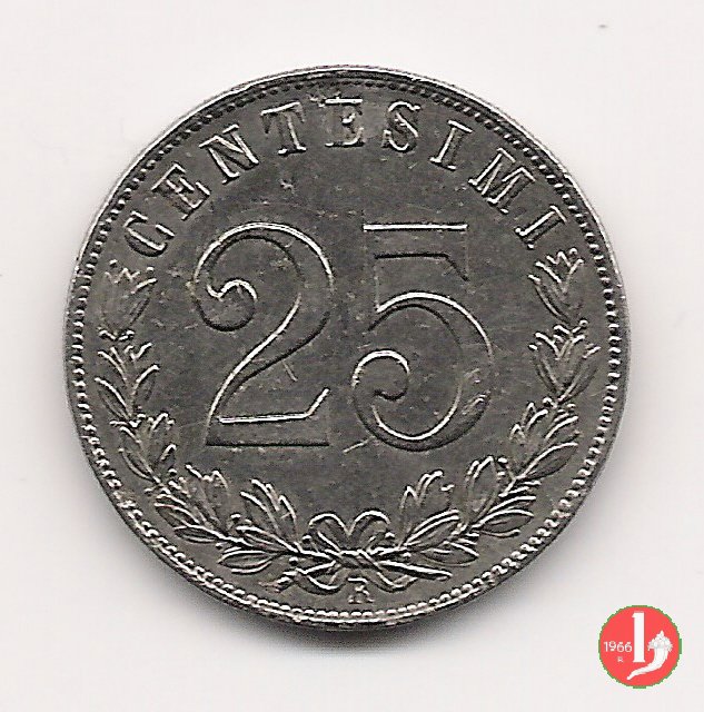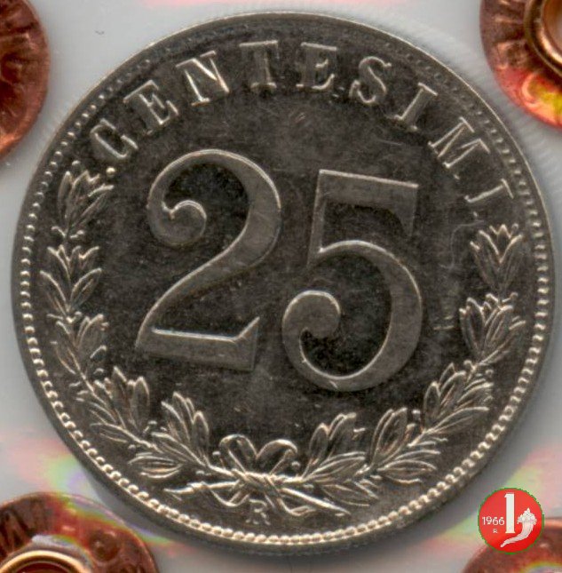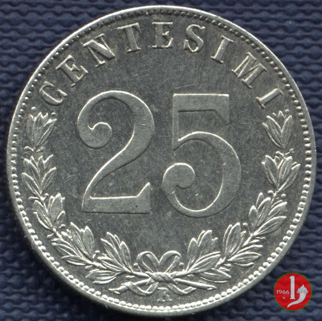 Moneta di taglio insolito, visto che era dal 1837 che non si coniavano piú monete da 25 centesimi. Date le simili dimensioni, disegno e colore si confondeva con la moneta da 1 lira oppure, qualora sottoposta a bagno di oro, con quella da 20.