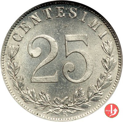 Aquila araldica con stemma di casa Savoia. Intorno la scritta VITTORIO EMANUELE III RE D'ITALIA e, sotto e separata da due stellette dalla scritta, la data. Nel campo e in alto indicazione del valore (CENTESIMI 25), intorno rami di alloro, sotto il segno di zecca (R).