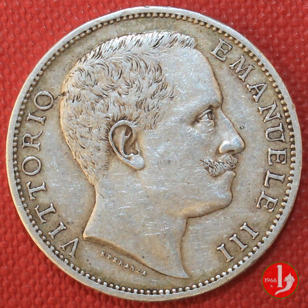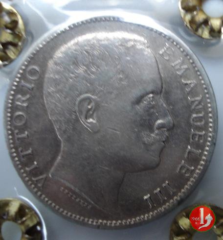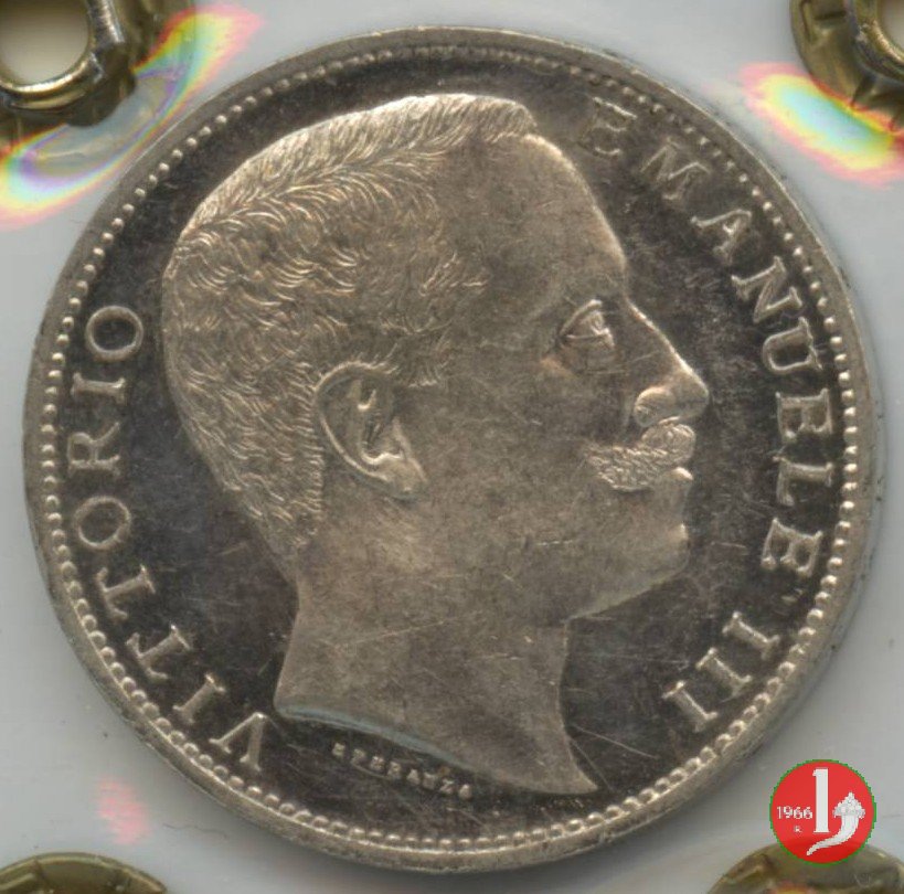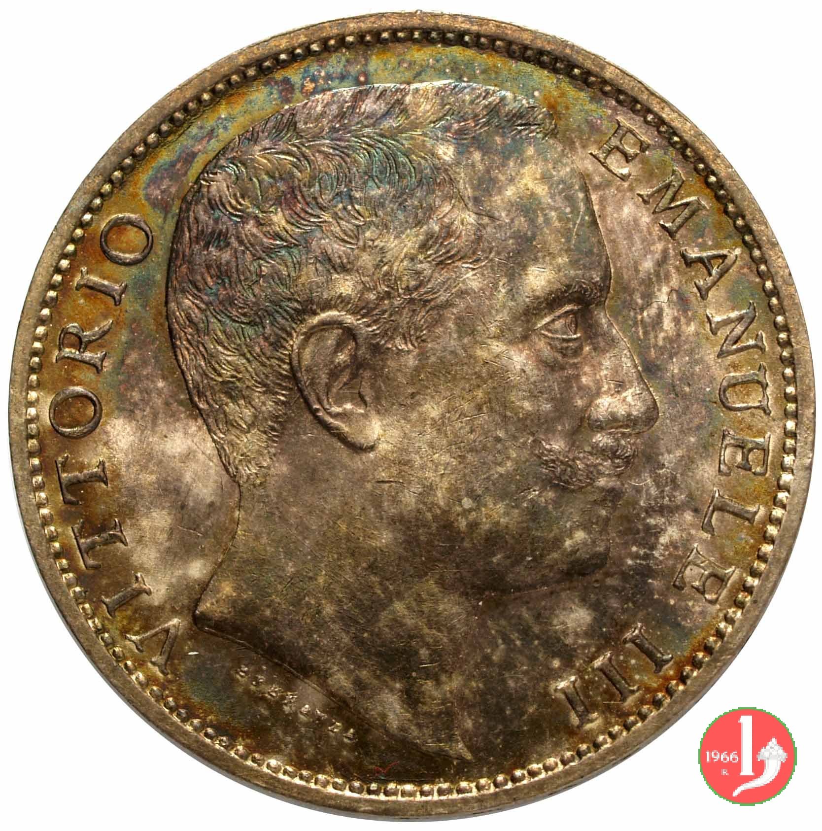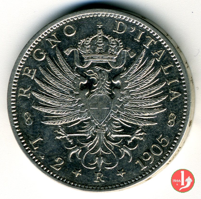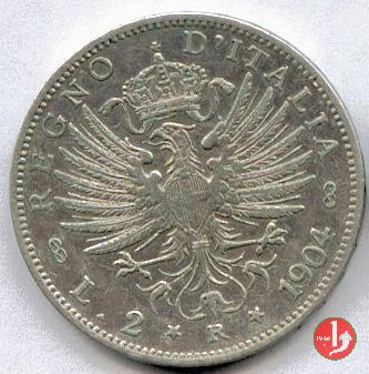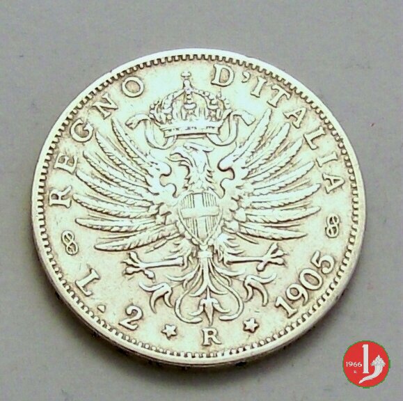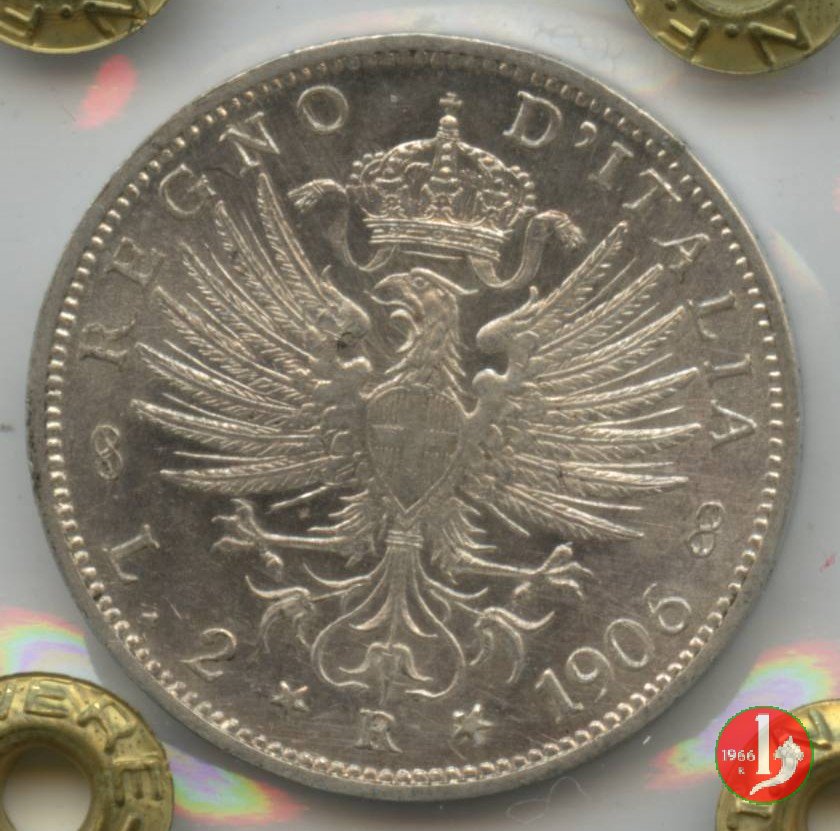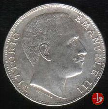 Testa del Re volto a destra contornato dalla scritta: VITTORIO EMANUELE III. Sotto il collo del Re, il nome dell'incisore SPERANZA. Aquila araldica con stemma di casa Savoia. Intorno la scritta: REGNO D'ITALIA, sotto l'indicazione del valore (L • 2), il segno di zecca (R) tra due stelle a 5 punte e il millesimo.