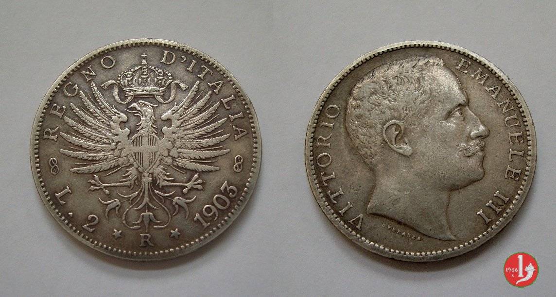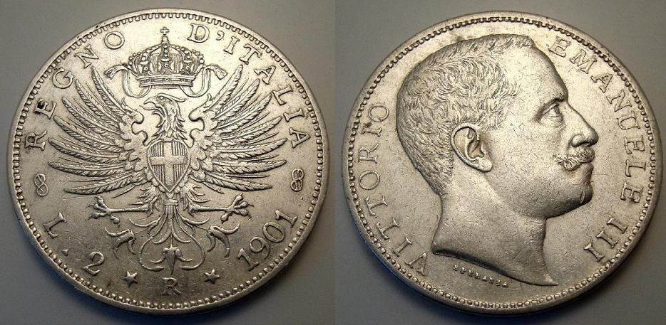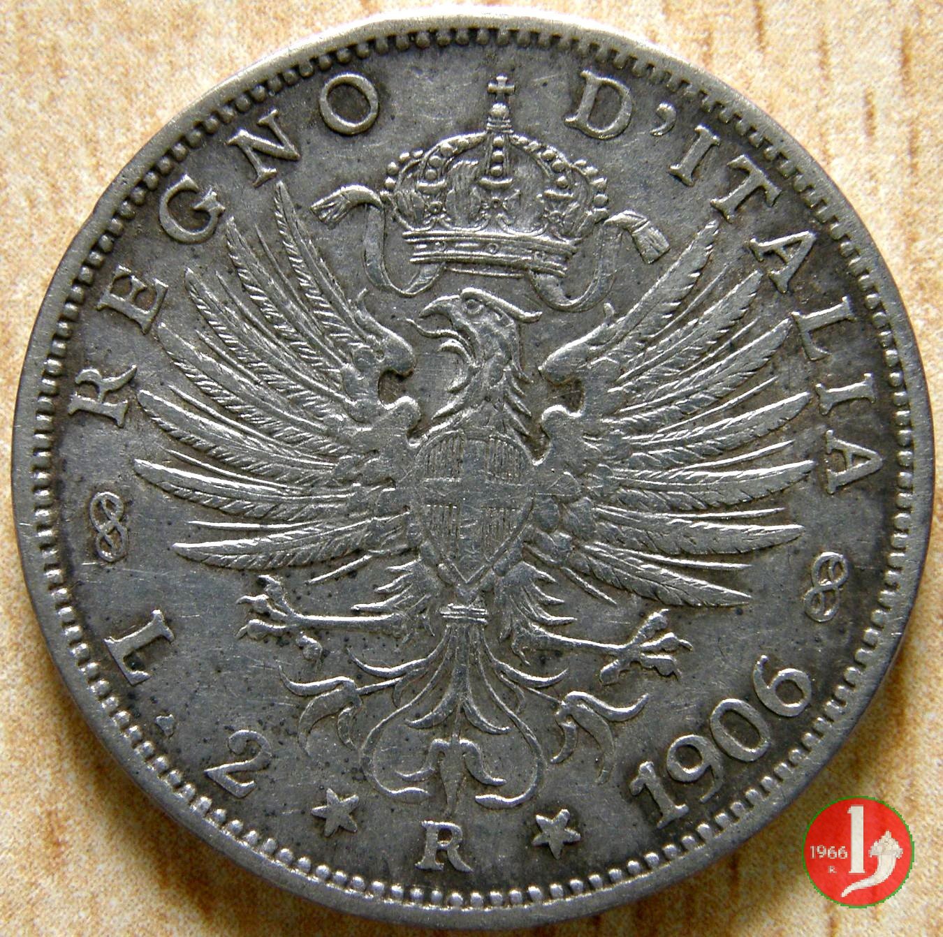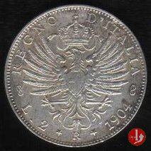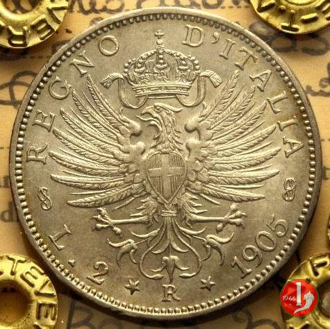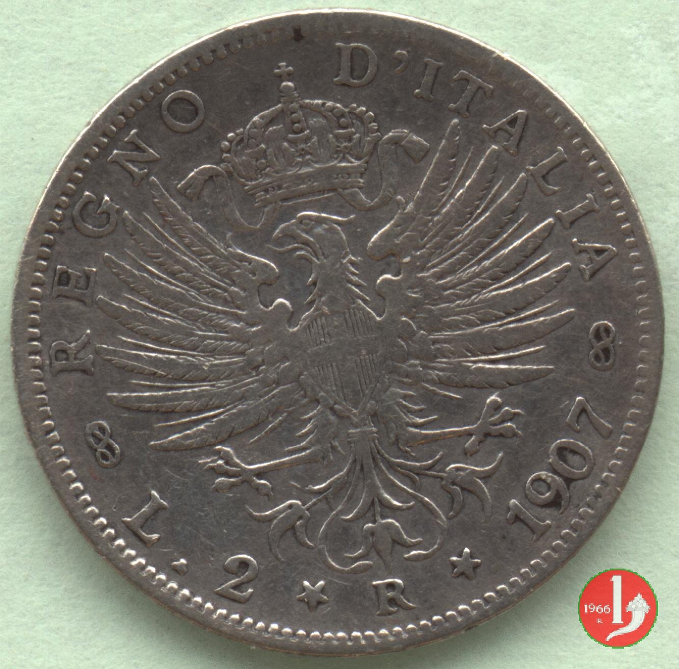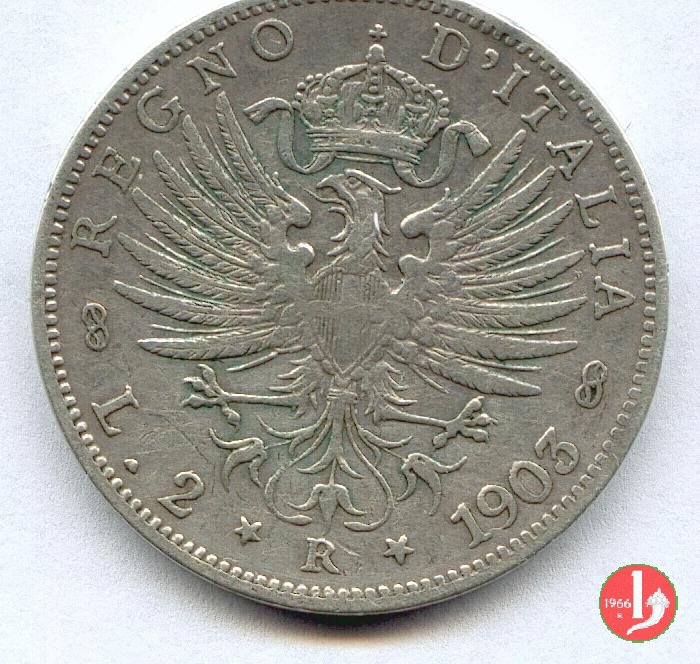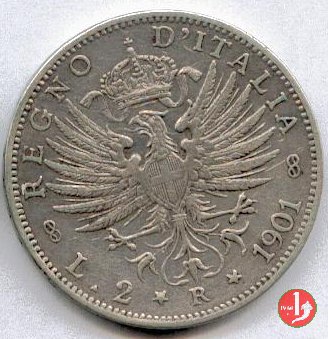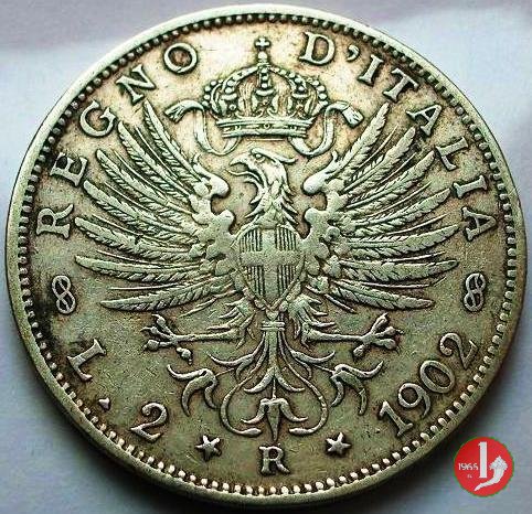 Testa del Re volto a destra contornato dalla scritta: VITTORIO EMANUELE III. Sotto il collo del Re, il nome dell'incisore SPERANZA. Aquila araldica con stemma di casa Savoia. Intorno la scritta: REGNO D'ITALIA, sotto l'indicazione del valore (L • 2), il segno di zecca (R) tra due stelle a 5 punte e il millesimo.