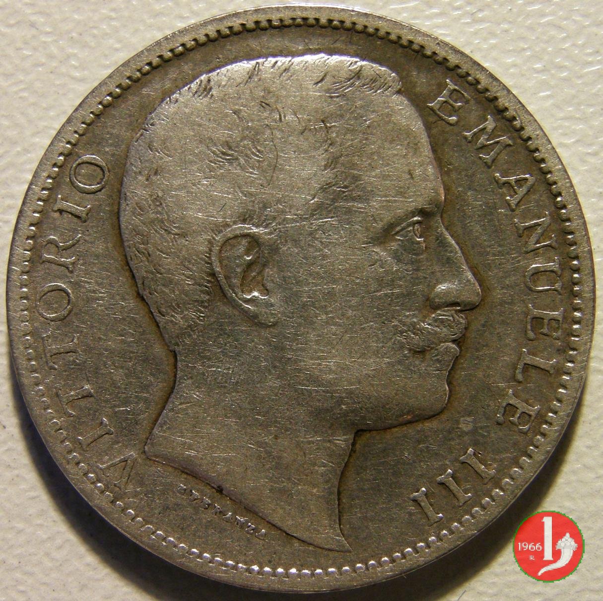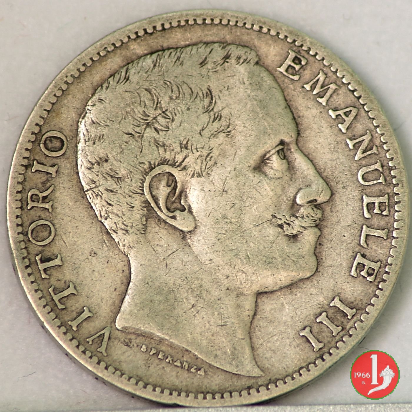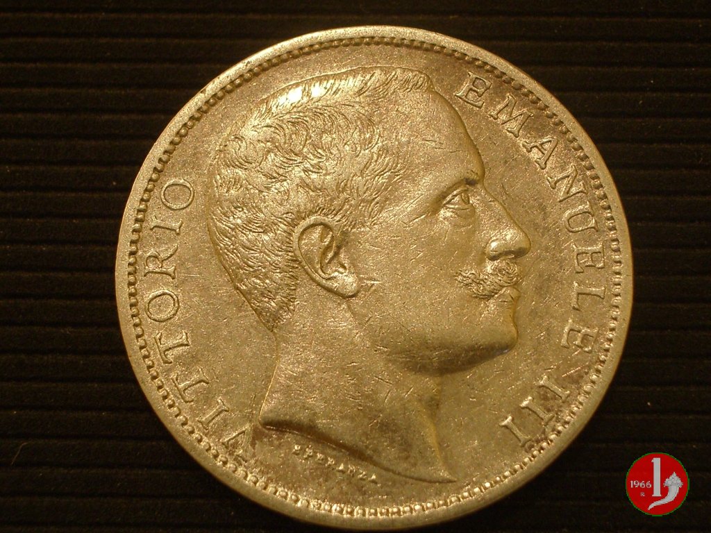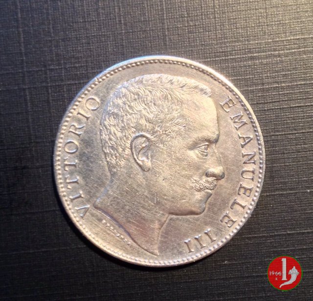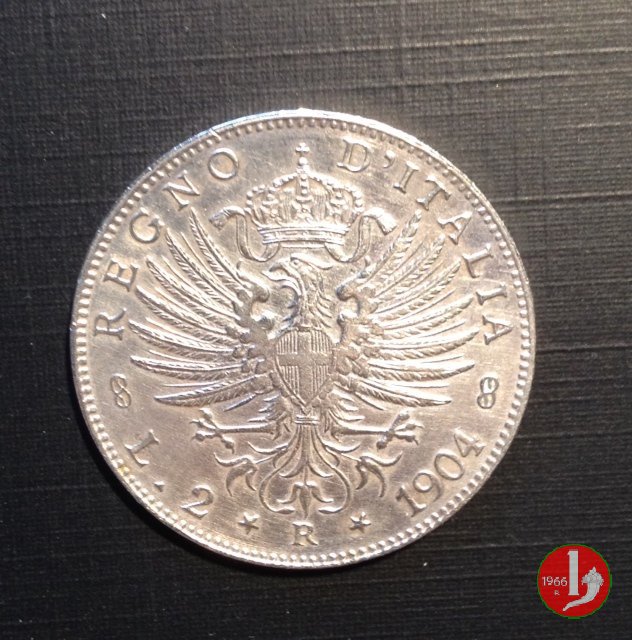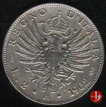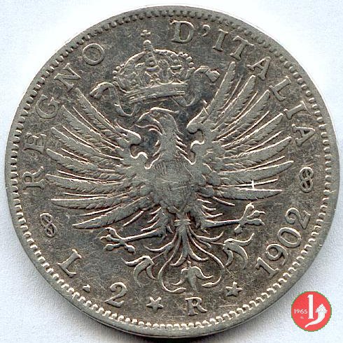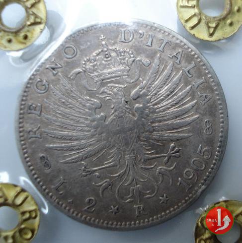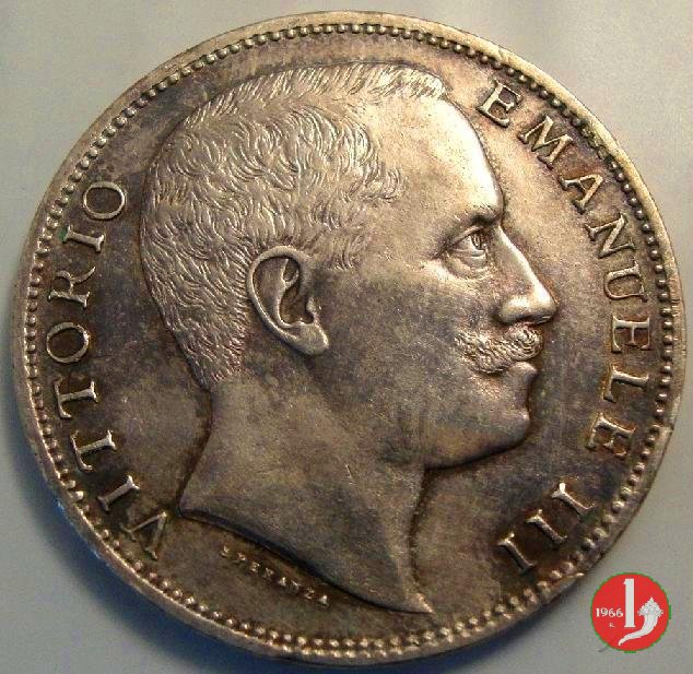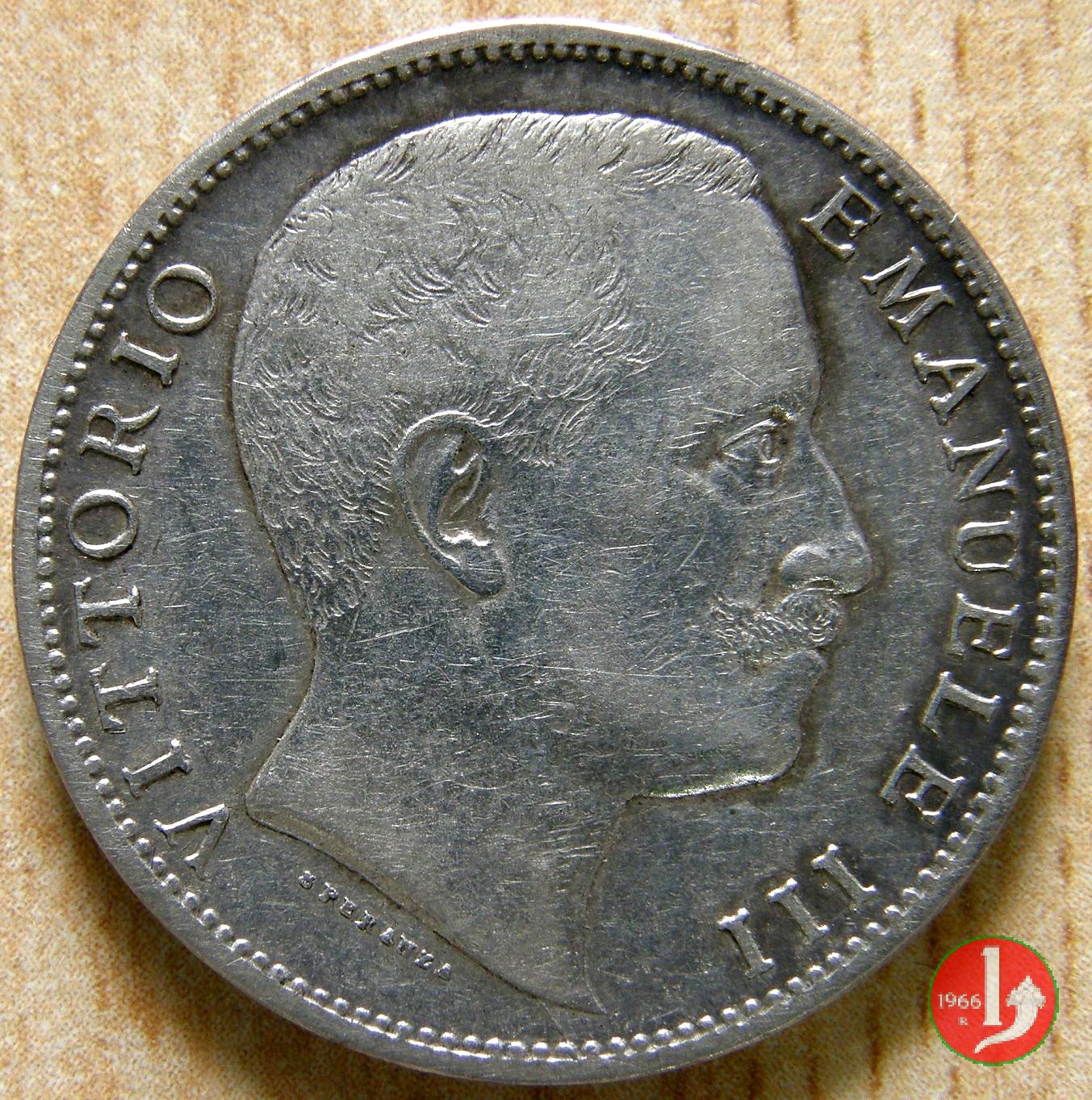 Testa del Re volto a destra contornato dalla scritta: VITTORIO EMANUELE III. Sotto il collo del Re, il nome dell'incisore SPERANZA. Aquila araldica con stemma di casa Savoia. Intorno la scritta: REGNO D'ITALIA, sotto l'indicazione del valore (L • 2), il segno di zecca (R) tra due stelle a 5 punte e il millesimo.