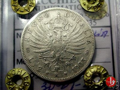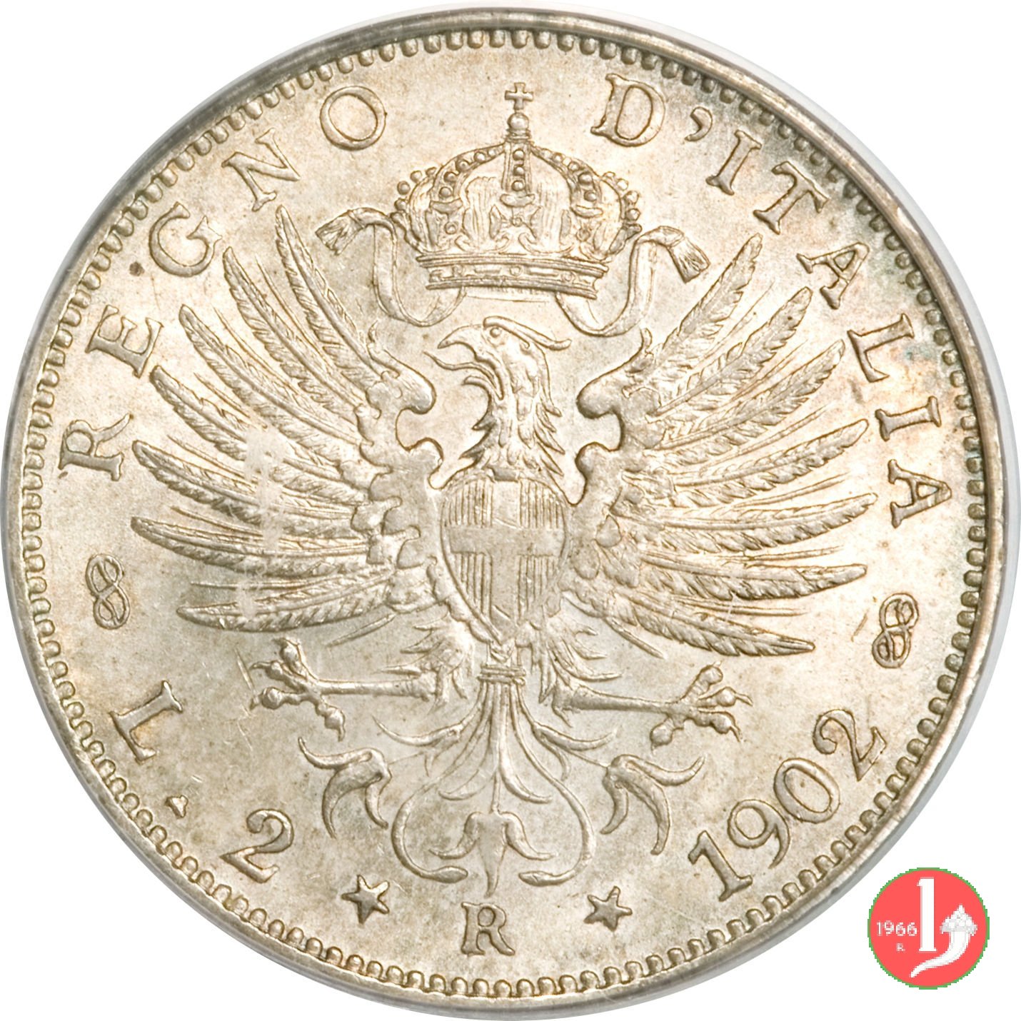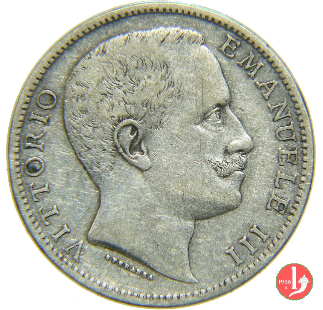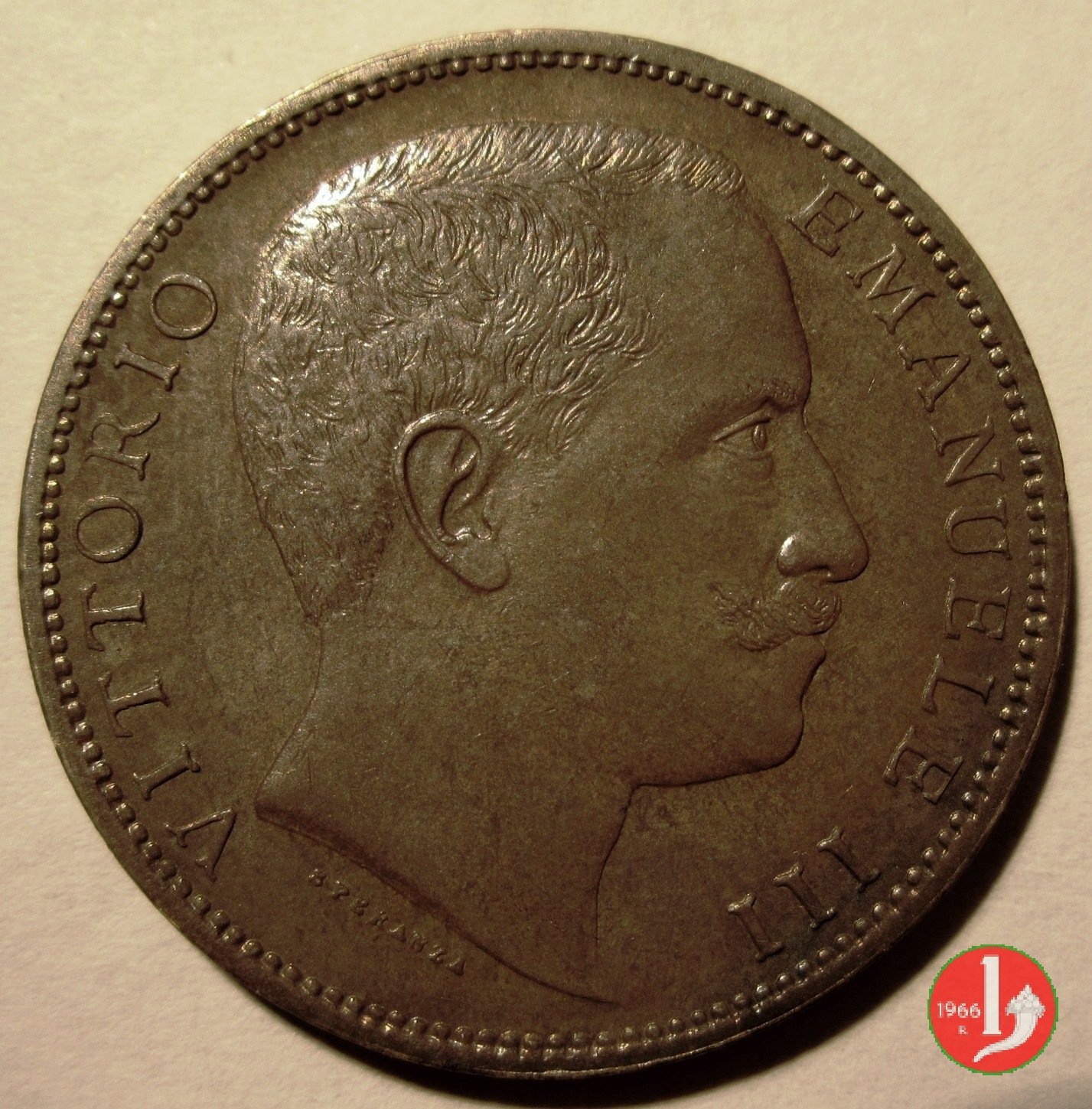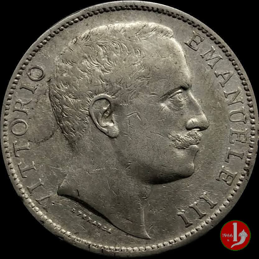 Testa del Re volto a destra contornato dalla scritta: VITTORIO EMANUELE III. Sotto il collo del Re, il nome dell'incisore SPERANZA. Aquila araldica con stemma di casa Savoia. Intorno la scritta: REGNO D'ITALIA, sotto l'indicazione del valore (L • 2), il segno di zecca (R) tra due stelle a 5 punte e il millesimo.