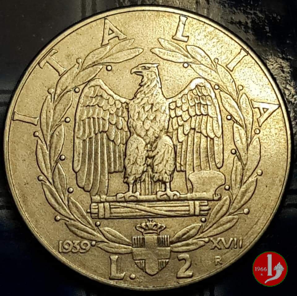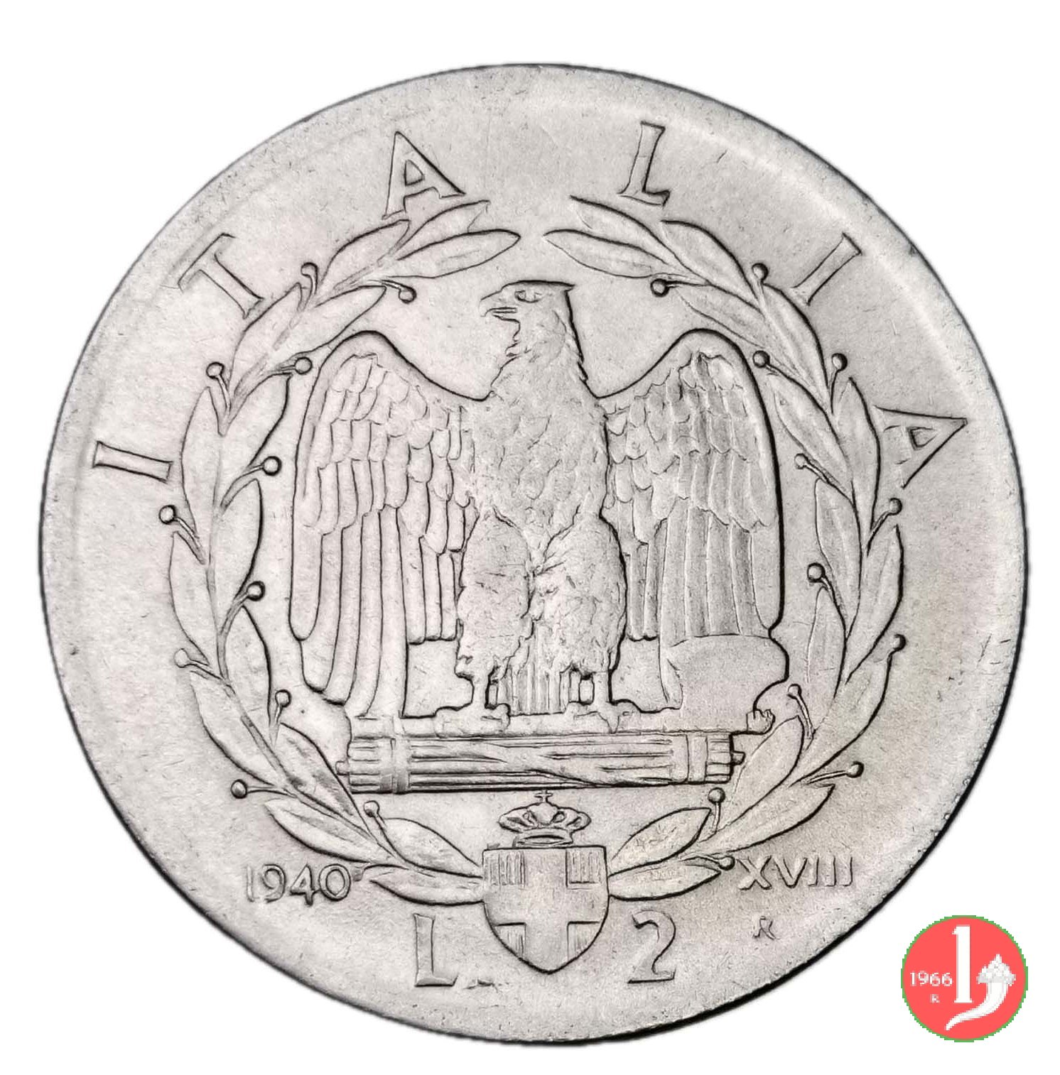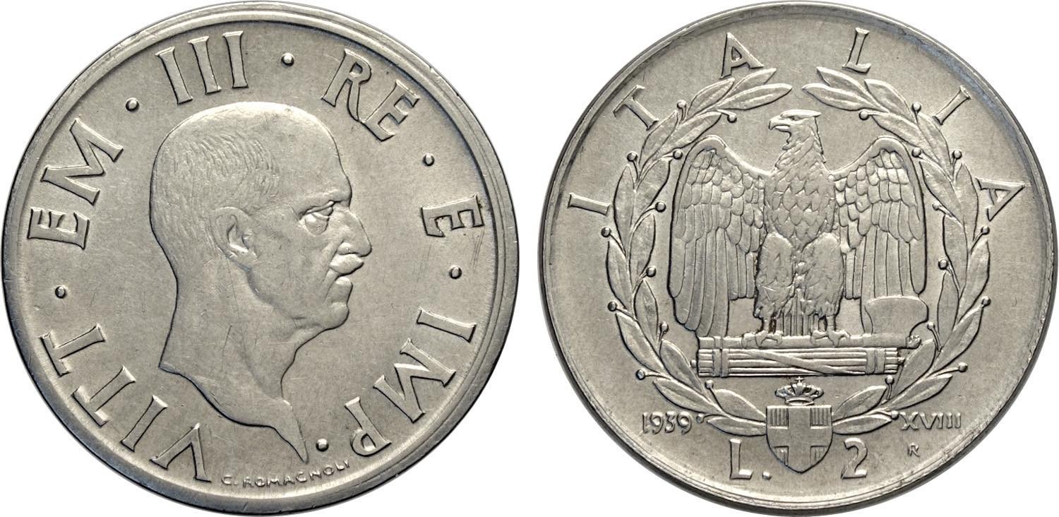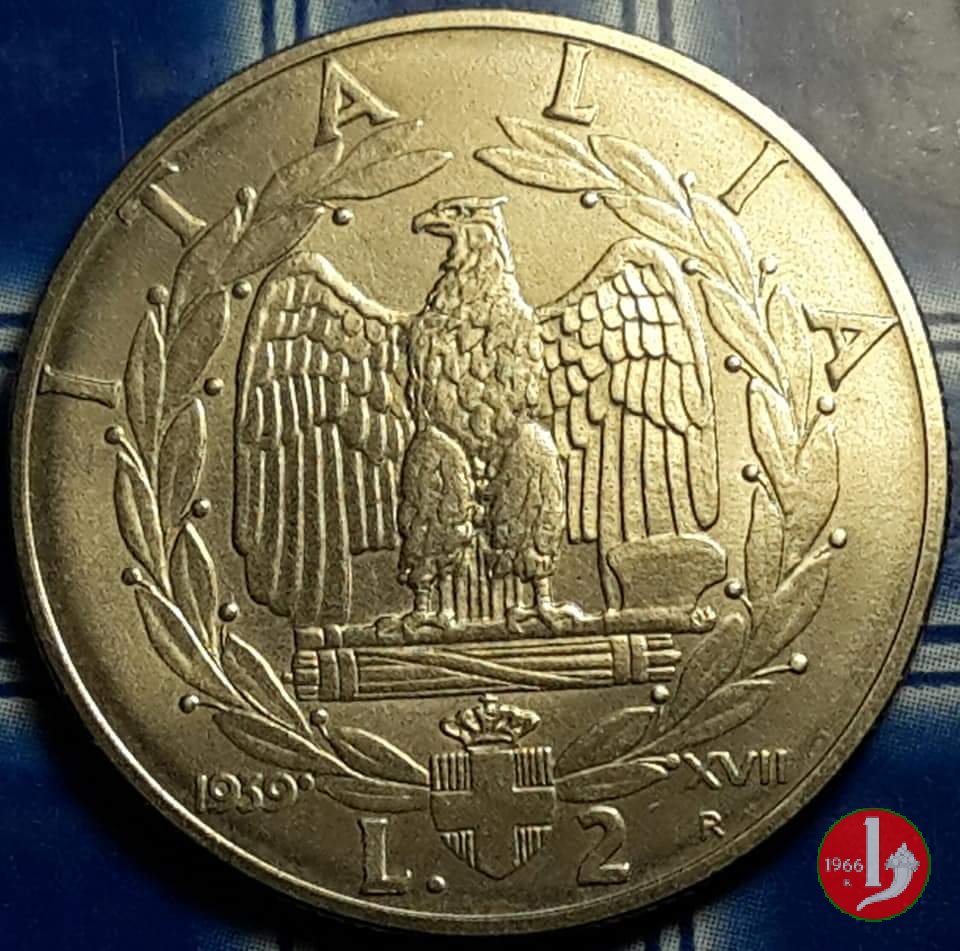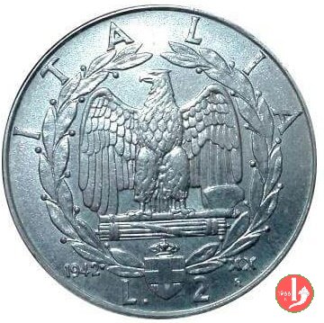 Testa del Re a sinistra, intorno: VITTORIO • EMANUELE • III • RE • E • IMP •, in basso lungo il bordo: G • ROMAGNOLI. Aquila con ali spiegate e fascio tra gli artigli, intorno, corona di alloro e la scritta: ITALIA. In basso stemma sabaudo tra il valore (L • 2) con a destra la data fascista e il segno di zecca e a sinistra il millesimo.