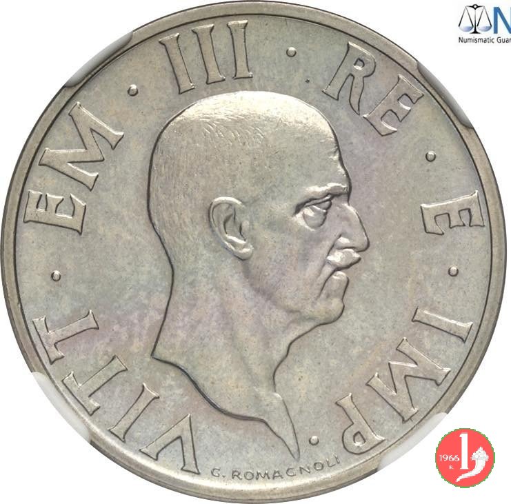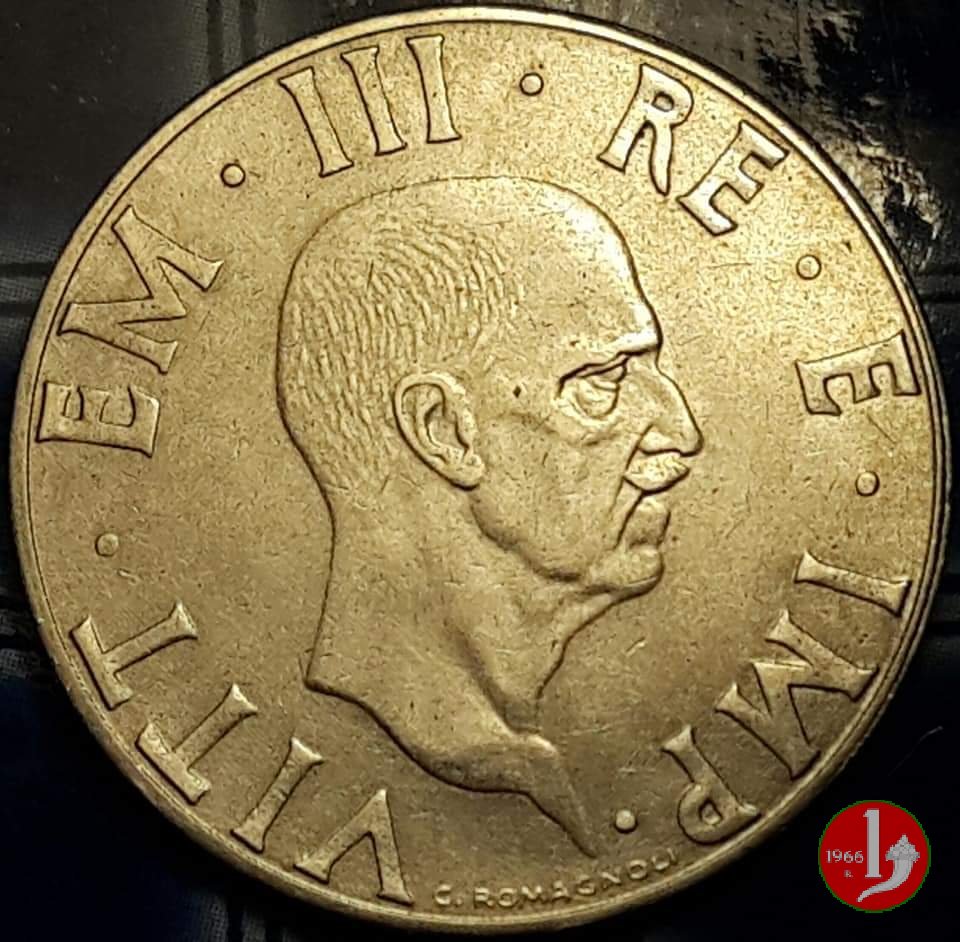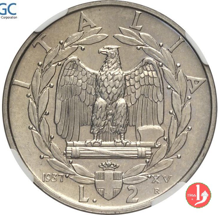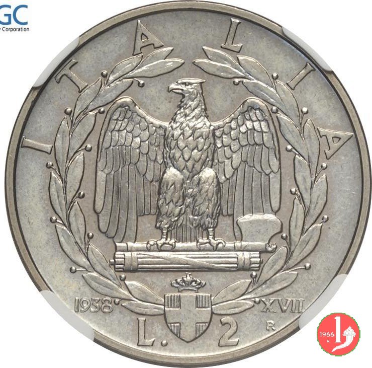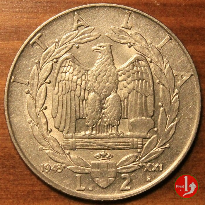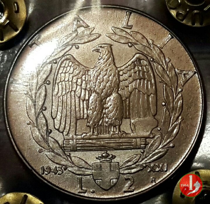 Testa del Re a sinistra, intorno: VITTORIO • EMANUELE • III • RE • E • IMP •, in basso lungo il bordo: G • ROMAGNOLI. Aquila con ali spiegate e fascio tra gli artigli, intorno, corona di alloro e la scritta: ITALIA. In basso stemma sabaudo tra il valore (L • 2) con a destra la data fascista e il segno di zecca e a sinistra il millesimo.