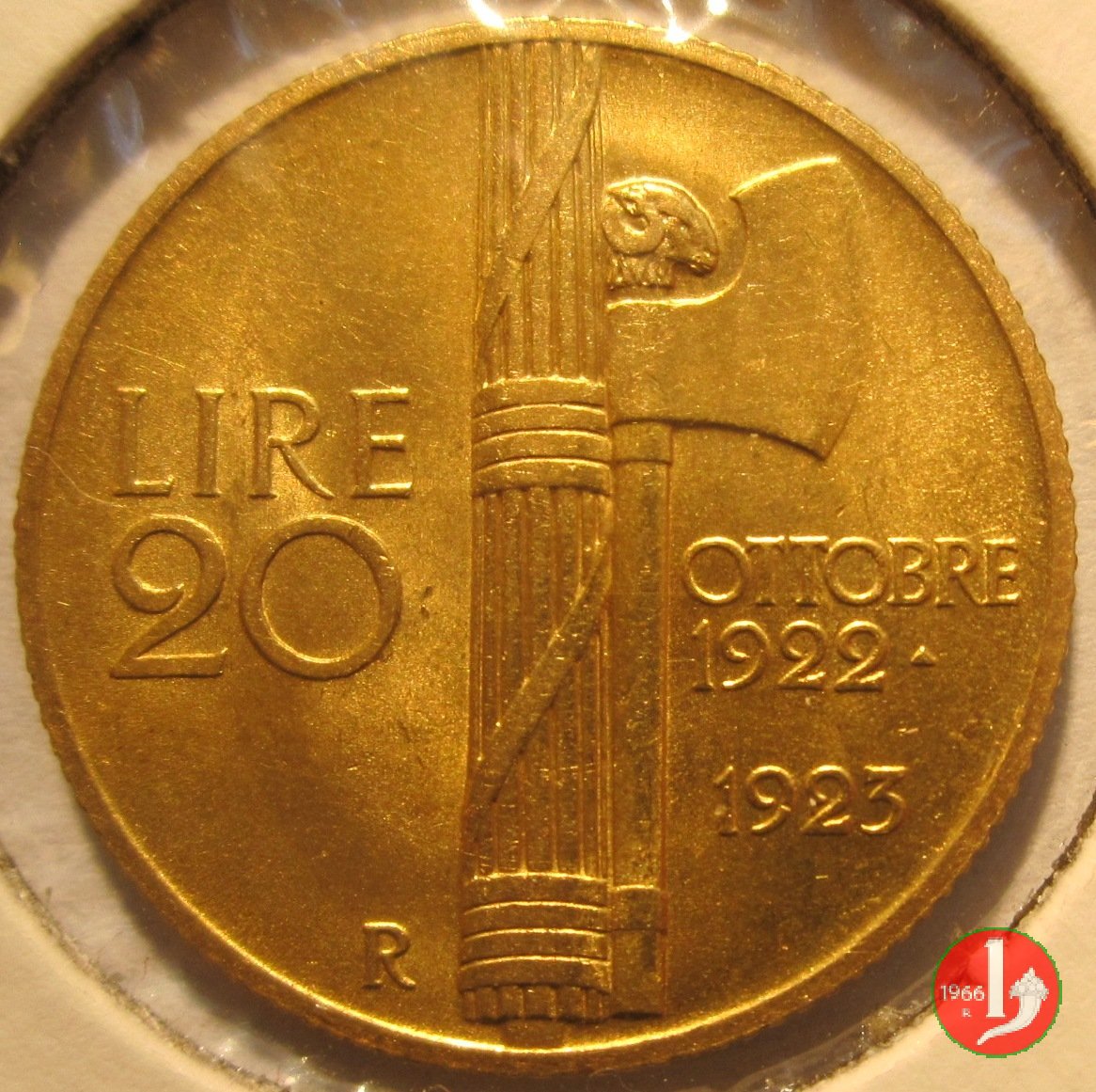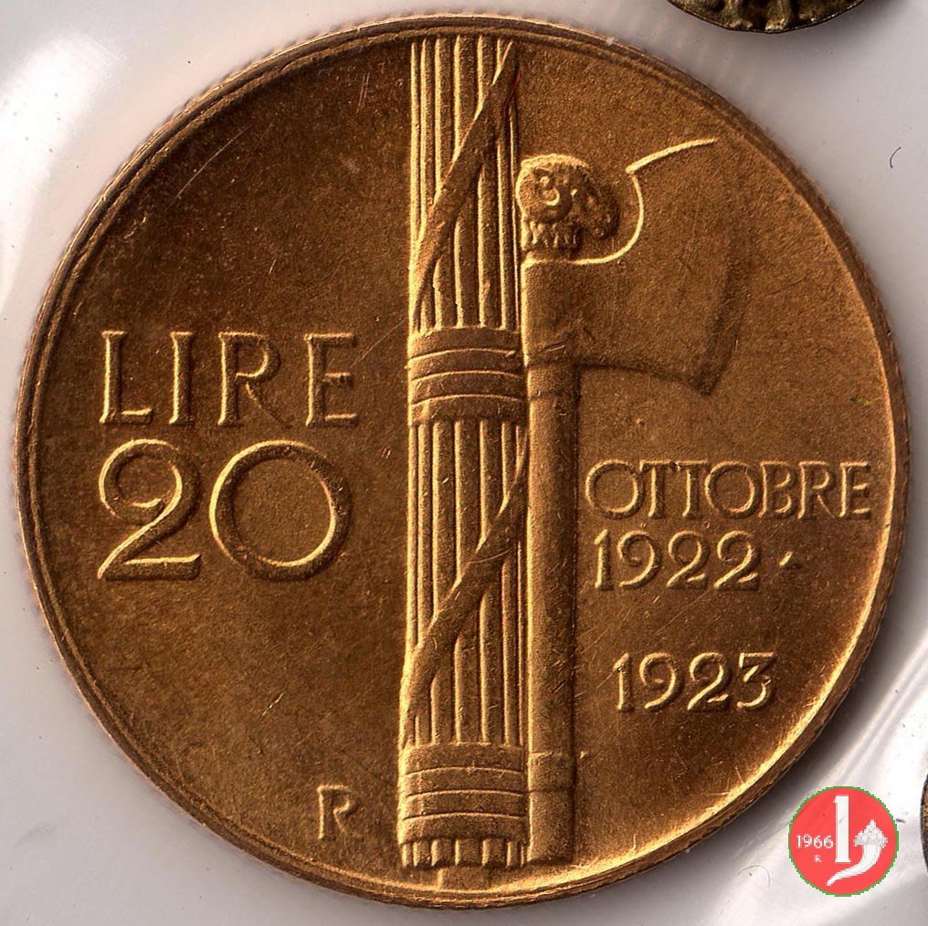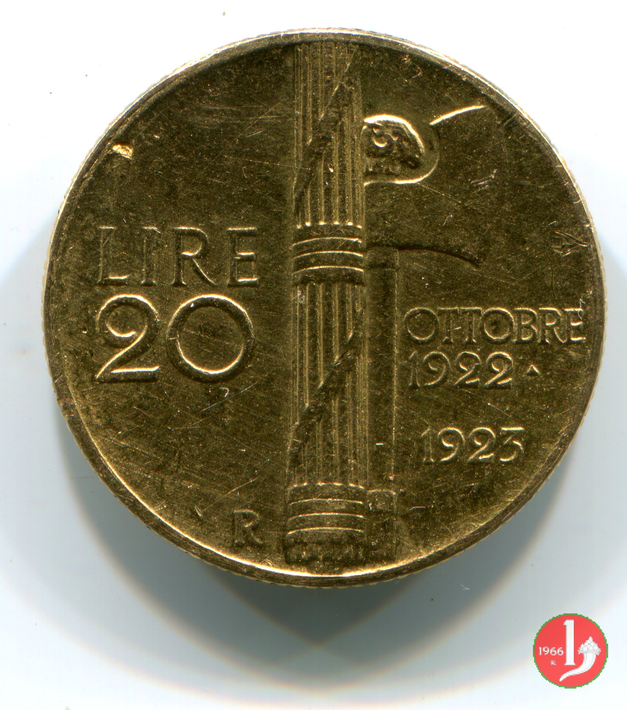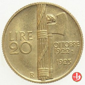 VITTORIO EMANUELE III RE D'ITALIA. Testa a sinistra, lungo il collo A. MOTTI (incisore dei conii) Fascio littorio con la scure verso destra ornato da testa di montone. A sinistra indicazione del valore (LIRE 20) su due righe, a destra OTTOBRE 1922 e 1923 su due righe. Alla sinistra della base del fascio il segno di zecca (R).