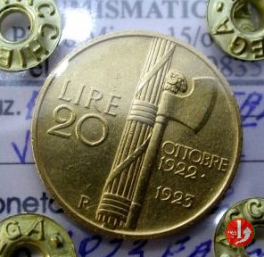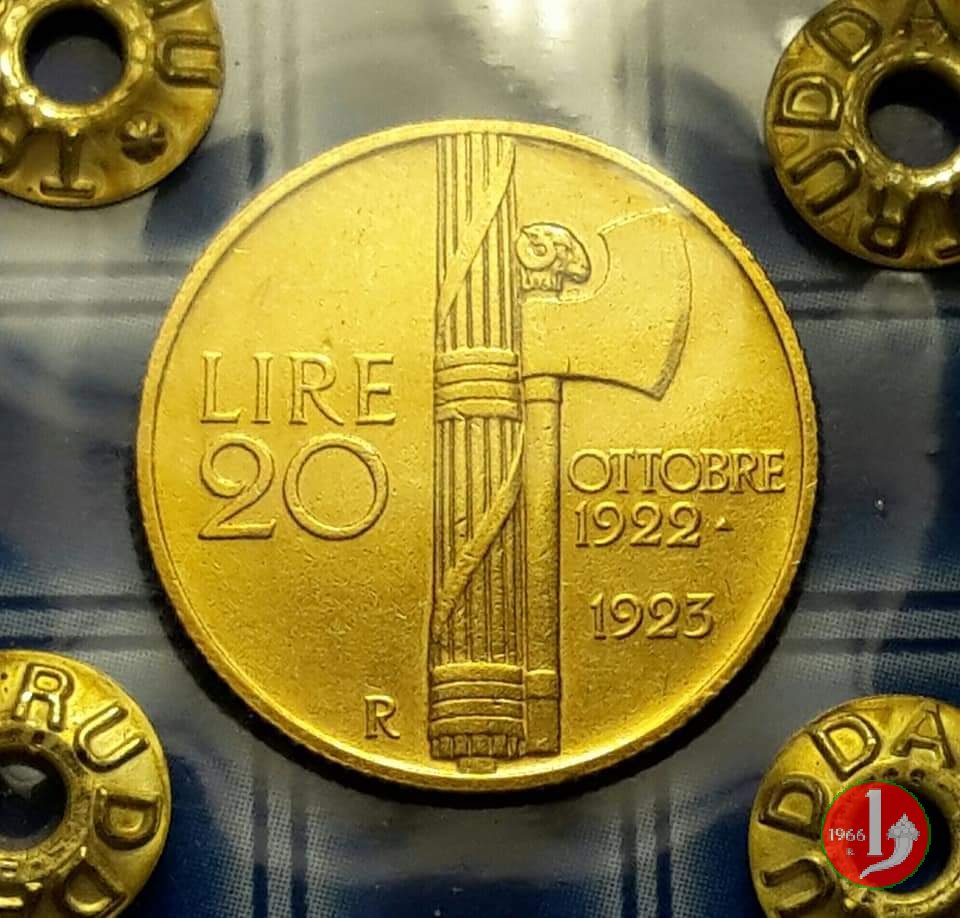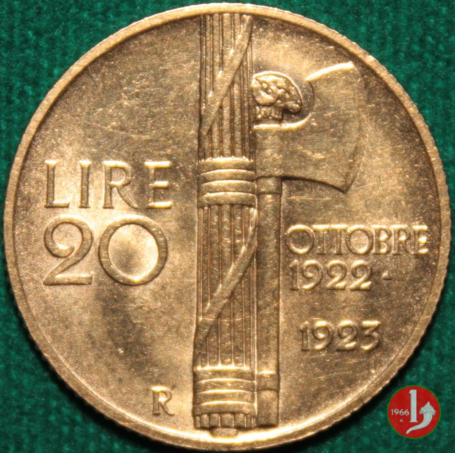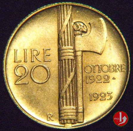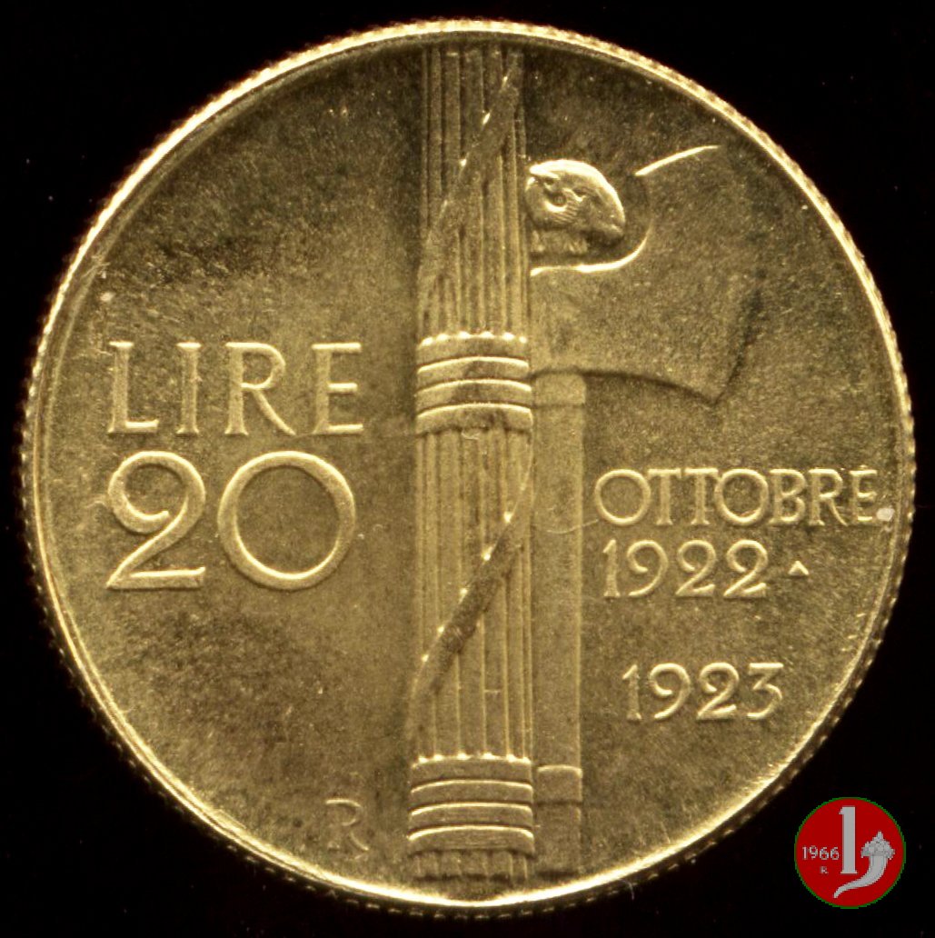 VITTORIO EMANUELE III RE D'ITALIA. Testa a sinistra, lungo il collo A. MOTTI (incisore dei conii) Fascio littorio con la scure verso destra ornato da testa di montone. A sinistra indicazione del valore (LIRE 20) su due righe, a destra OTTOBRE 1922 e 1923 su due righe. Alla sinistra della base del fascio il segno di zecca (R).