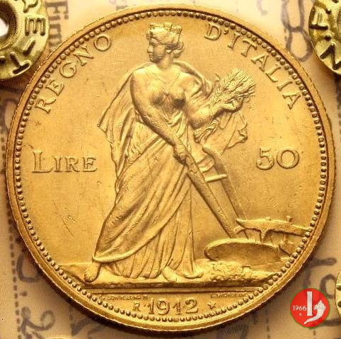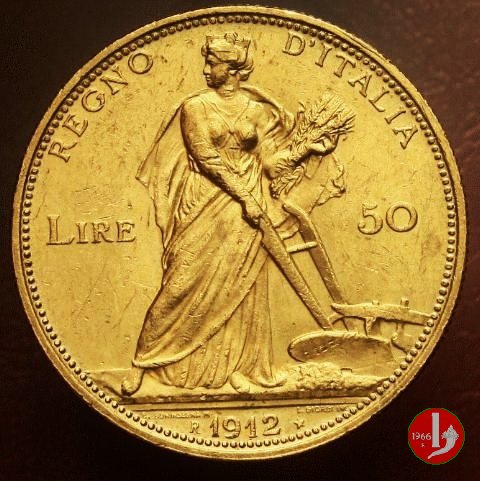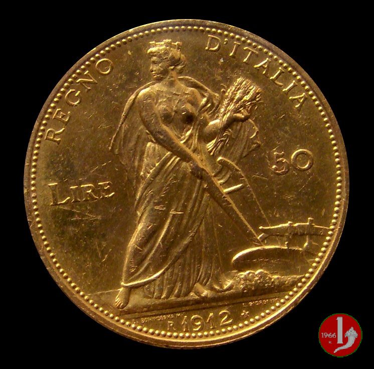 Busto del Re in uniforme volto a sinistra contornato dalla scritta: VITTORIO EMANUELE III. A ore otto lungo il bordo nodo savoia in incuso all'interno di un rettangolo. Figura allegorica dell'Italia raffigurata come un'aratrice recante un fascio di spighe nella mano sinistra e con la mano destra poggiata sopra il manico di un aratro. In alto la legenda REGNO D'ITALIA in carattere lapidario romano; l'indicazione del valore è ai due lati in modo che il lato sinistro contenga la parola LIRE e il destro la cifra del valore della moneta.
