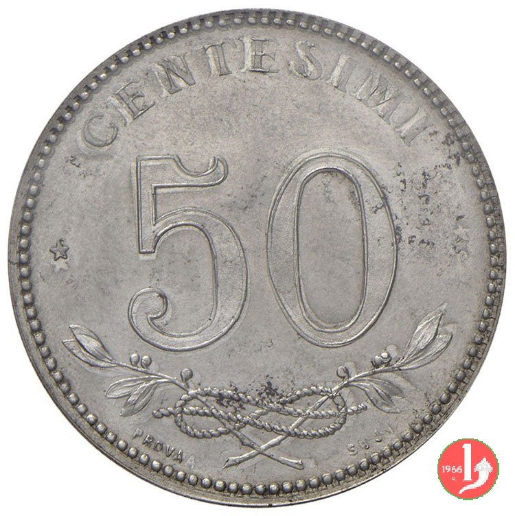 testa elmata a sinistra; attorno: stella REGNO D'ITALIA e a destra la data. nel campo, il valore su nodo d'amore con rami d'alloro, in basso circolarmente, a sinistra "PROVA" e a destra "SJ"