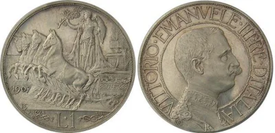 Figura allegorica dell'Italia con scudo, elmo e ramo di quercia, su quadriga veloce a sinistra.