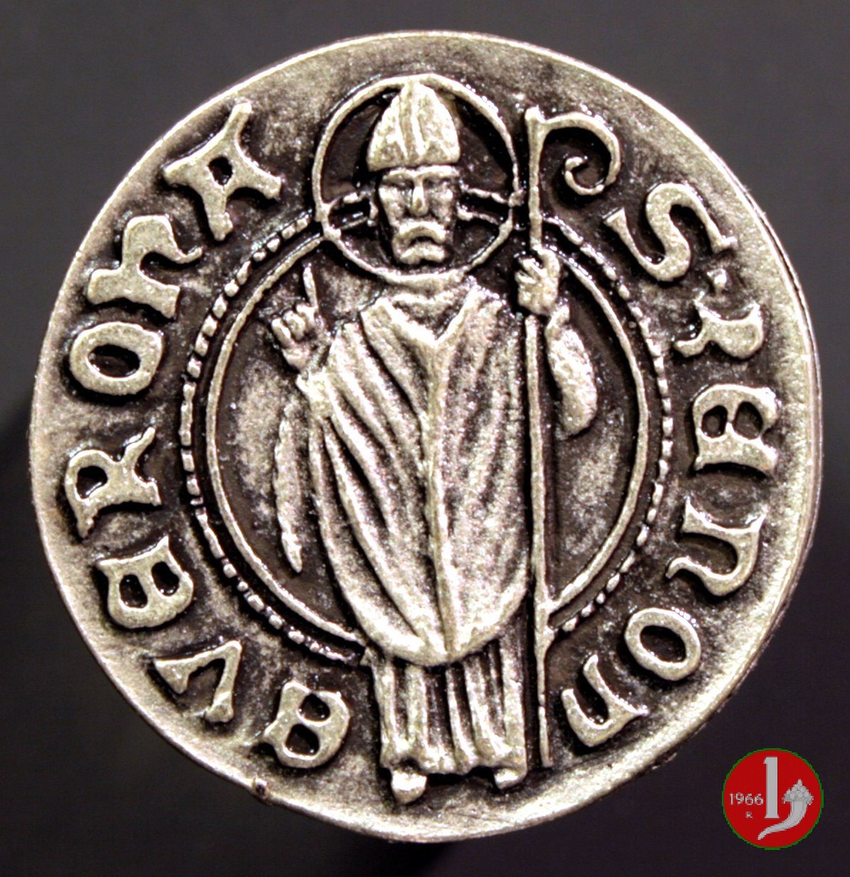 Il Vescovo San Zeno (+372), principale Patrono della città e della diocesi di Verona, solennemente parato, con la mitra in capo e aureolato, la mano destra levata, con le tre dita spiegate a simboleggiare la Santissima Trinità, nel cui nome benedice.