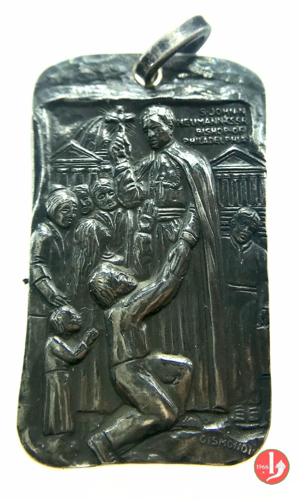 Placchetta rettangolare coniata, realizzata probabilmente nel 1977 a ricordo della canonizzazione di Giovanni Nepomuceno Neumann (1811-1860).