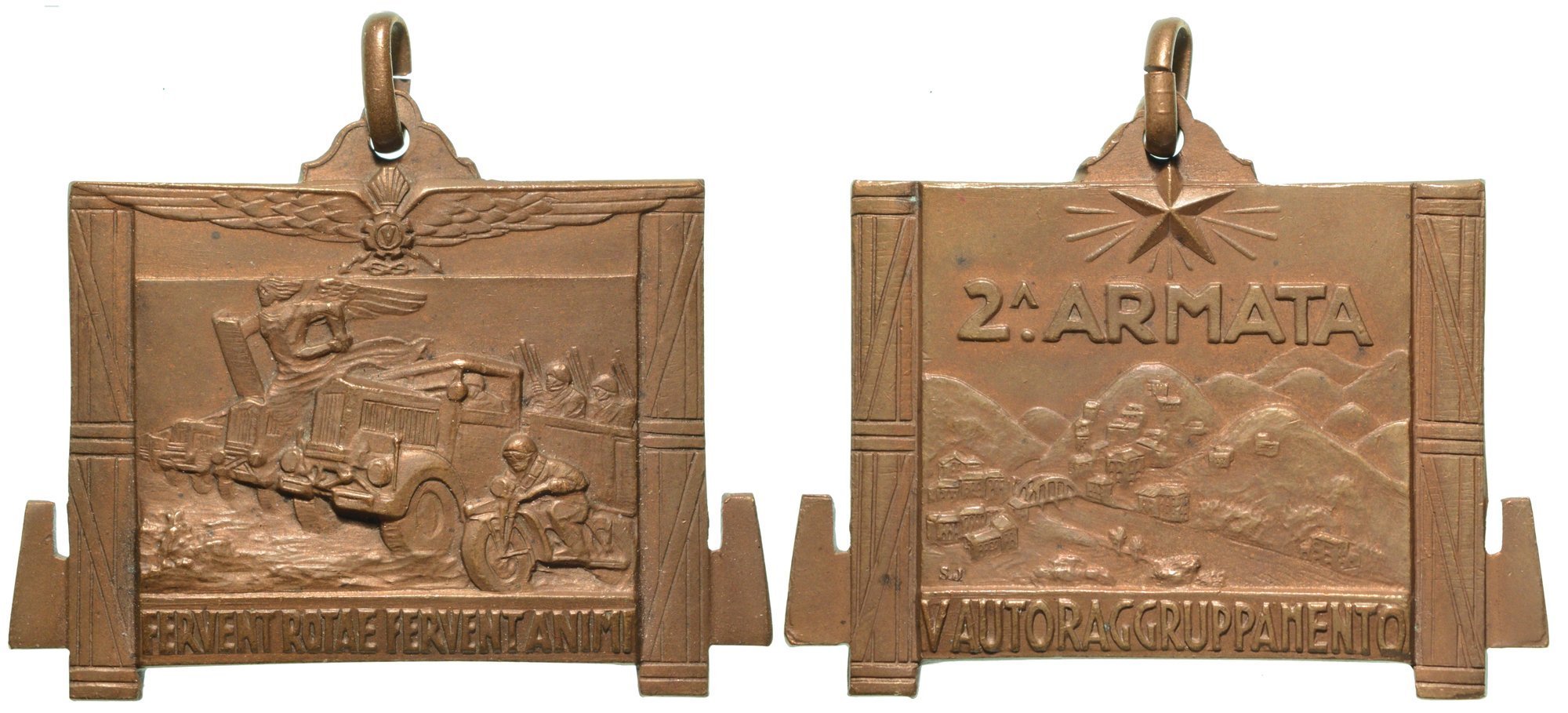 II° Armata - V° Autogruppamento -C80 Dritto: tra due fasci verticali con lame divergenti motociclista e truppe autotrasportate, la figura alelgorica della Vittoria a sx fregio della V° Autoragruppamento in esergo in alto: 2° ARMATA Stella raggiante su paesaggio alpino in esergo: V° AUTORAGRUPPAMENTO in basso a sx: S.J. | |