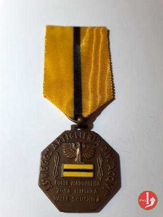 Reggimento Artiglieria Divisione Acqui -C103 Dritto: Postazione di cannoni volta a dx, a sx reticolo di filo spinato, sullo sfondo rilievi montuosi Verso: 33° REGG Aquila ad ali spiegate su mostrina gialla e nera orizzontale tra due nodi d'amore verticali sotto: COLLE MADDALENA = ZONA HIMARA = VALLE SHUSHICA | |