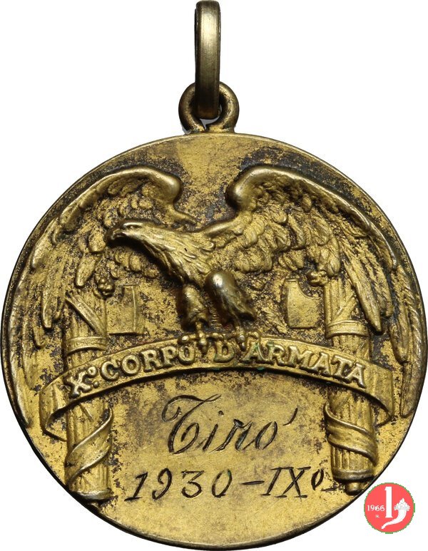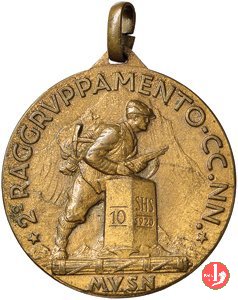 M.V.S.N. - Comando Generale -C- Dritto: busto maschile elmato e volto a dx, regge fucile su bersaglio in basso a dx: S.J a sx presso il bordo: MANCIOLI in alto: Stemma Savoia coronato, posto sopra a fasci verticali e contornato da collare della SS. Annunziata e da nastro MILIZIA V.S NAZIONALE nel campo: ISPETTORATO = POST MILITARE = SPORTIVO E TIRO A SEGNO | |