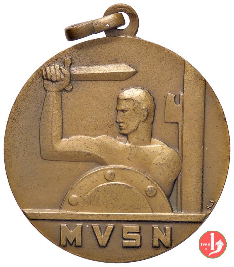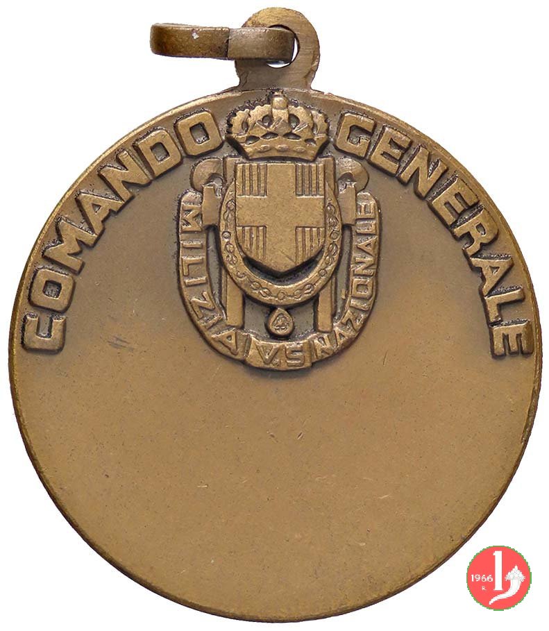 M.V.S.N. - Comando Generale -C- Dritto: busto maschile volto a sx, regge gladio e scudo e a dx fascio verticale in basso a dx: S.J in esergo: MVSN in alto: Stemma Savoia coronato, posto sopra a fasci verticali e contornato da collare della SS. Annunziata e da nastro MILIZIA V.S NAZIONALE | |
