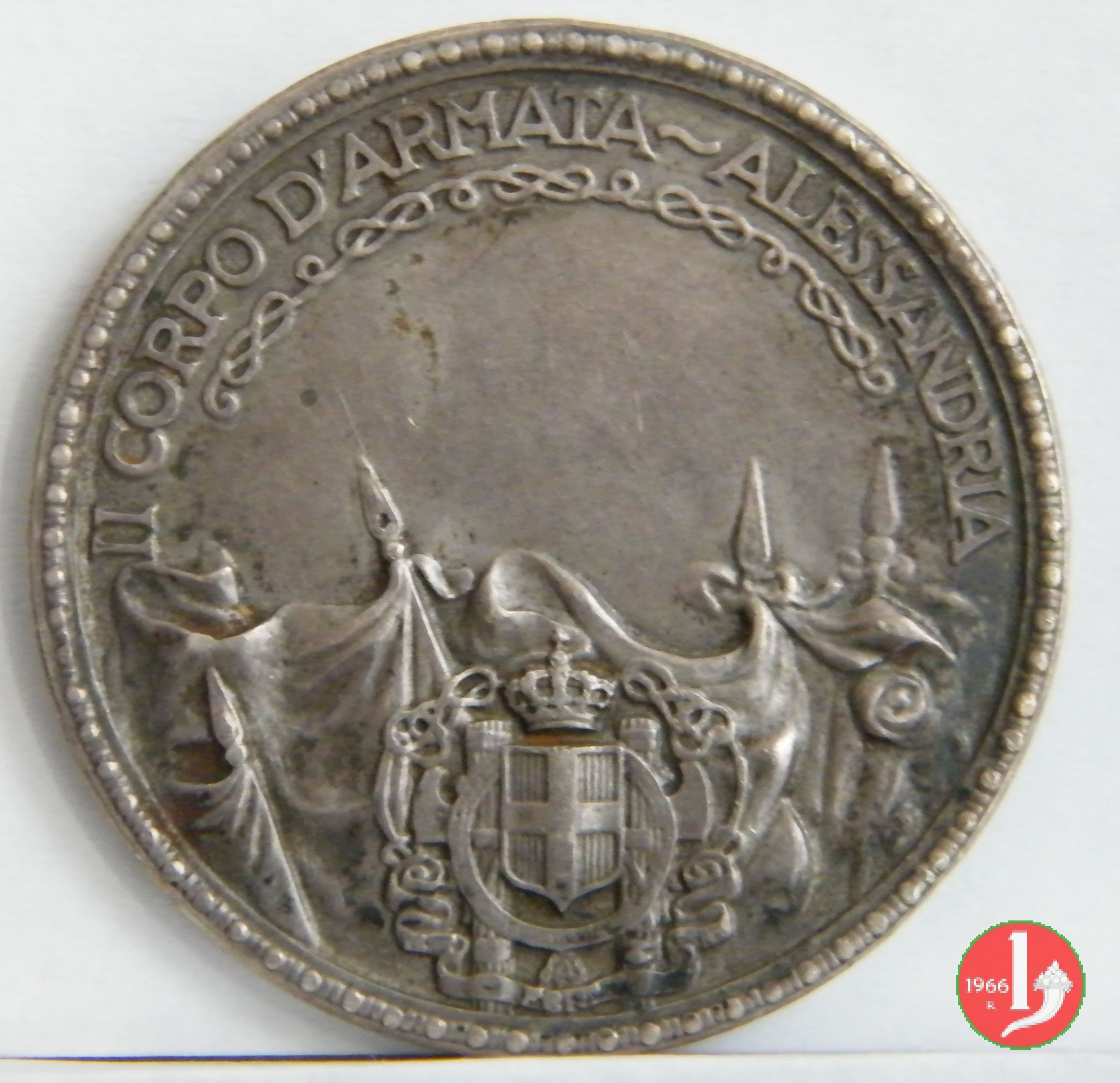 I° Corpo d'Armata Torino -C- Dritto: gladio diagonale coronato su ramo di quercia intrecciato a nodo d'amore in basso a sx: E. LOMBARDI in basso: fascio verticale con lama a dx | |