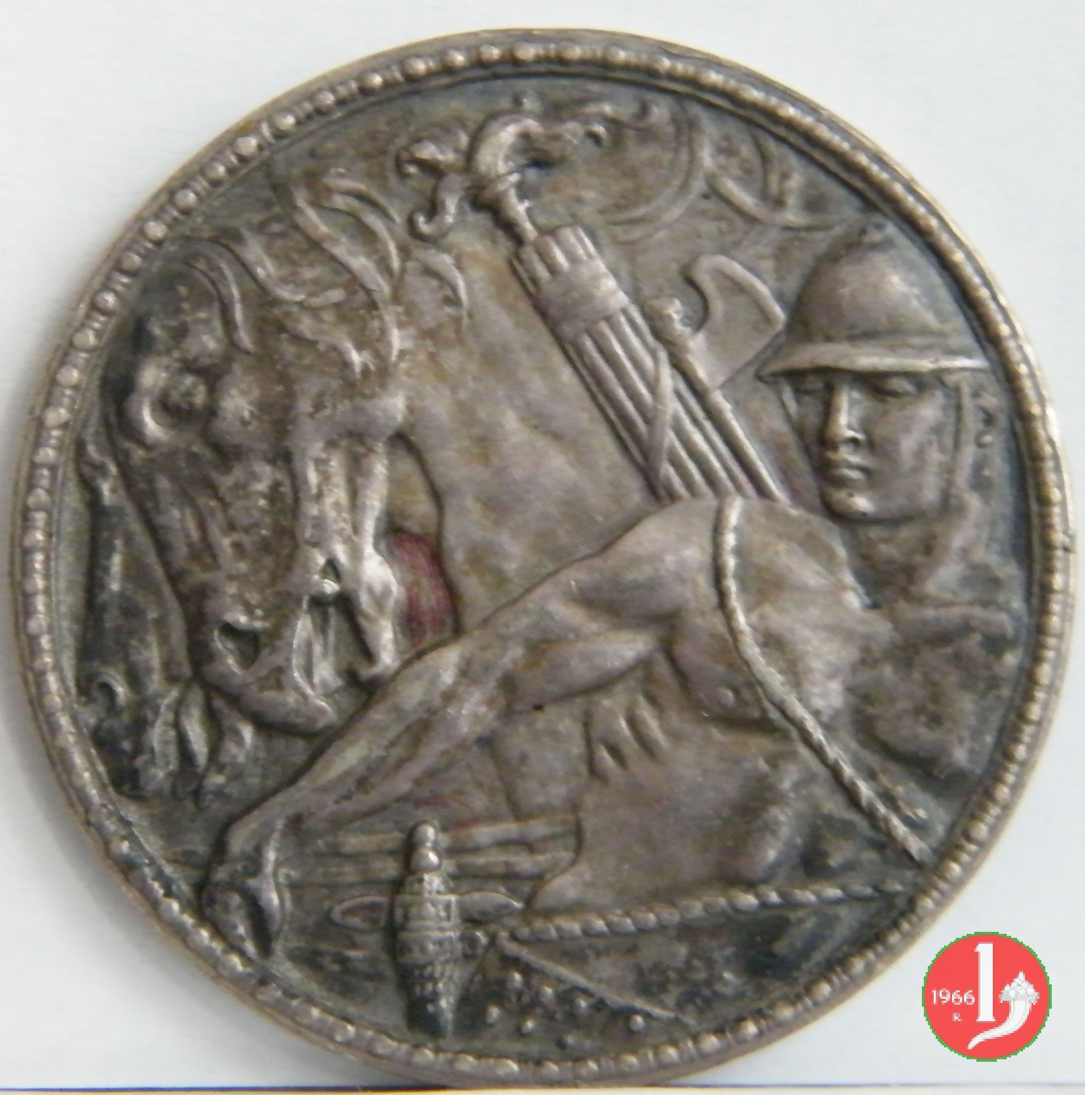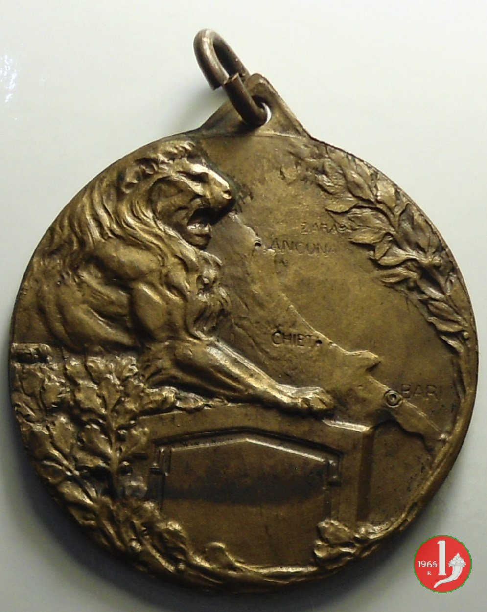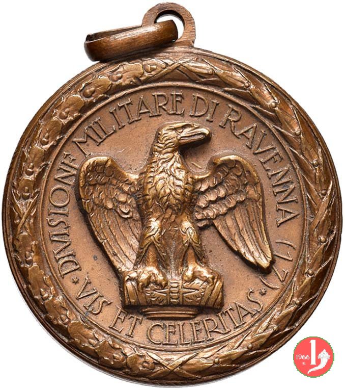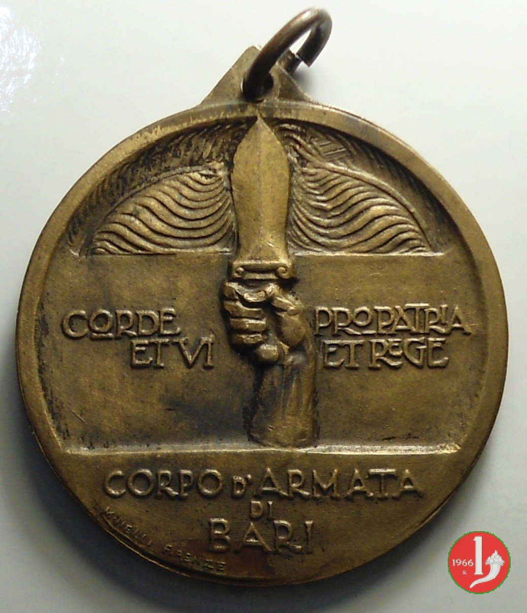 IX° Corpo d' Armata di Bari -C82 Dritto: leone ruggente a dx sullo sfondo la planimetria dell'Italia Adriatica centro-meridionale con indicate le città di ZARA _ ANCONA _ CHIETI _ BARI, pone zampa sopra a targa vuota, posta tra rami d'alloro e quercia Verso: braccio impugna gladio verticale tra rami di palma al centro: CORDE = ET VI _ PRO PATRIA = ET REGE in esergo: CORPO D'ARMATA = DI = BARI in basso: M. NELLI FIRENZE | |