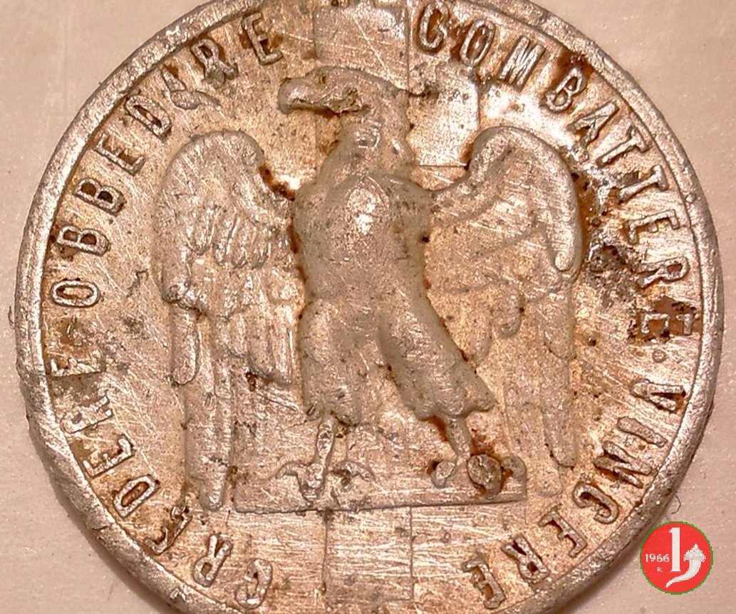 Divisione 59° Cagliari -C92 Dritto: Stemma coronato in cartiglio, tra rami di palma e tra due sirene Verso: Scudetto con gladio al centro tra foglie di quercia presso i bordi inferiori dello scudetto: DIVISIONE *59* CAGLIARI in basso: fascio orizzontale con lama in basso | |