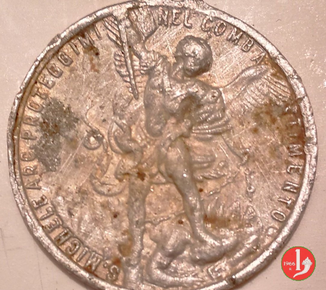 M.V.S.N. - San Michele -C61 Dritto: CREDERE • OBBEDIRE _ COMBATTERE • VINCERE Aquila ad ali spiegate di fronte su fascio in basso: SCALIA _ ROMA L'Arcangelo Michele in piedi ad ali spiegate, regge spada e calpesta nemico a terra | |
