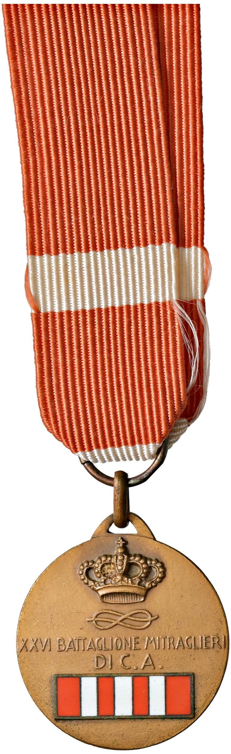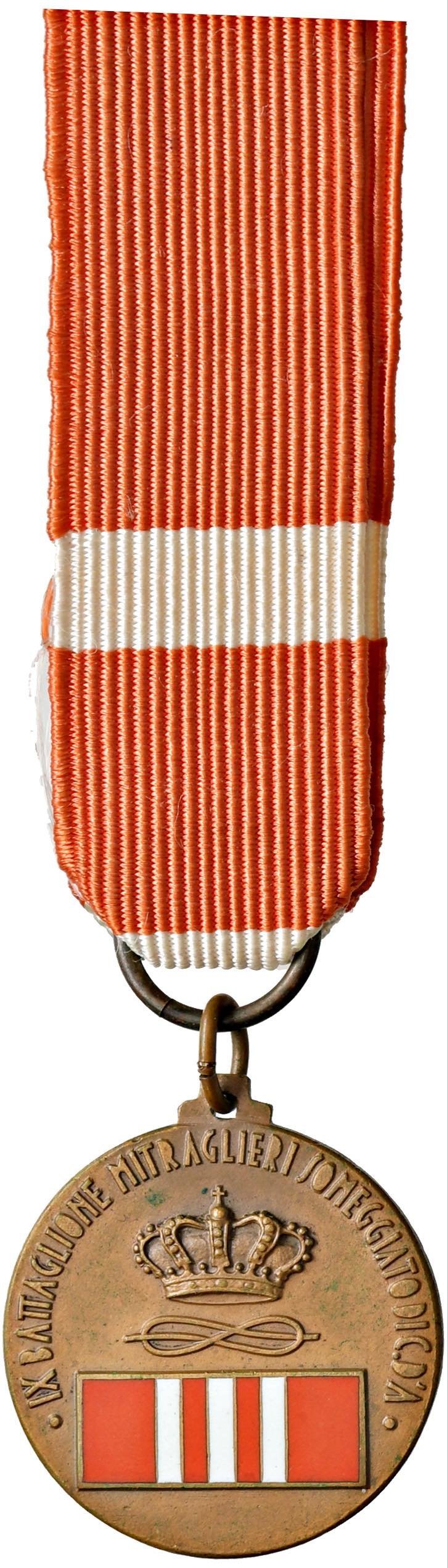 VI Battaglione Mitraglieri -C98 Dritto: Mitragliere e Fuciliere elmati, volti a dx, presso abete e sullo sfondo paesaggio montuoso Verso: VI BATTAGLIONE MITRAGLIERI DI CORPO D' ARMATA in alto circolarmente: fregio in smalto rosso con ai lati due copie di triglifi bianchi disposti radialmente sotto: corona su nodo d'amore | |